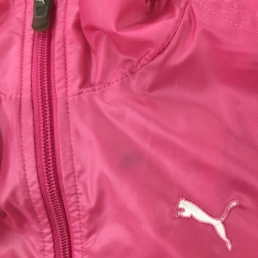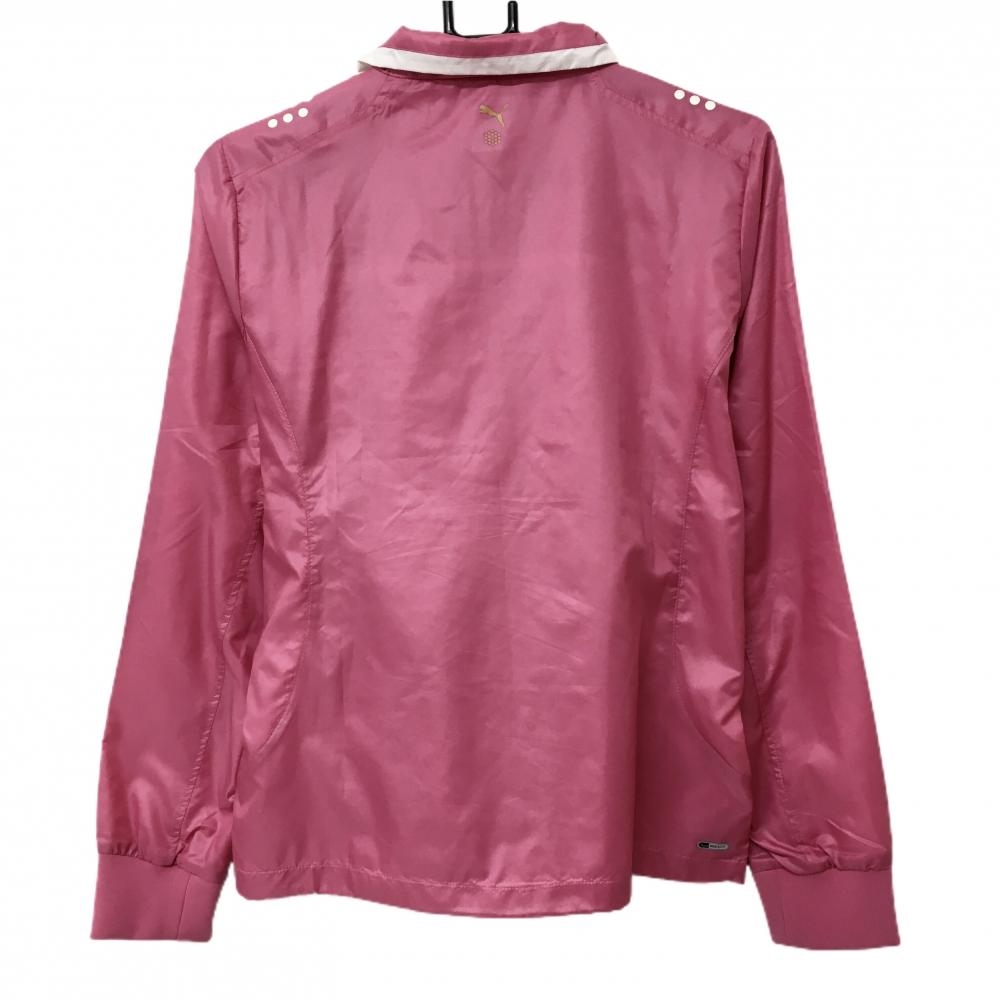 【美品】プーマ ジャケットブルゾン ピンク×白 胸元ロゴ 裏地メッシュ 裾ドローコード レディース L ゴルフウェア PUMA