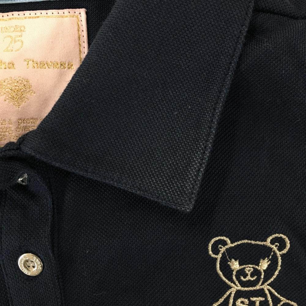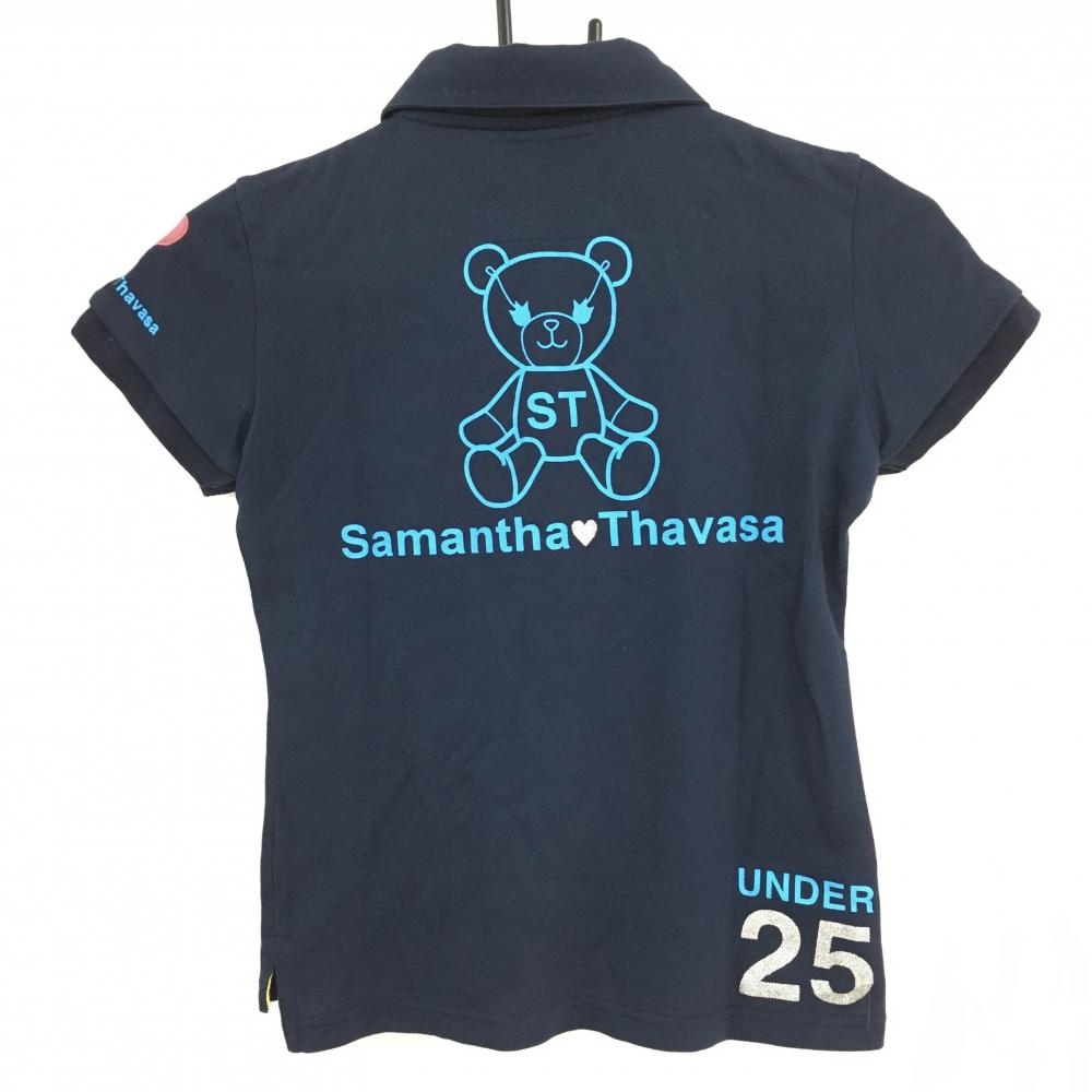 サマンサタバサ UNDER25 半袖ポロシャツ ネイビー×ライトブルー ベア ロゴプリント レディース S ゴルフウェア Samantha Thavasa