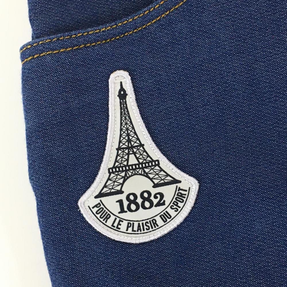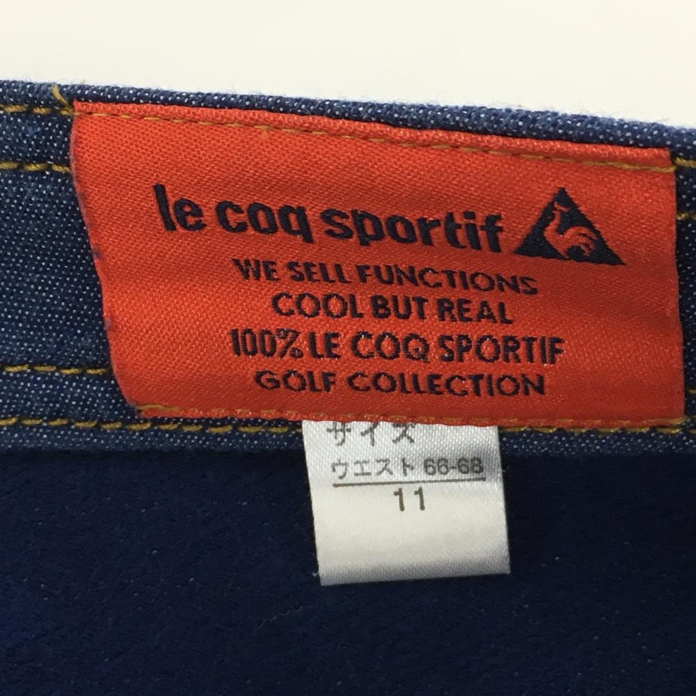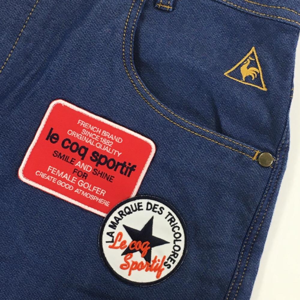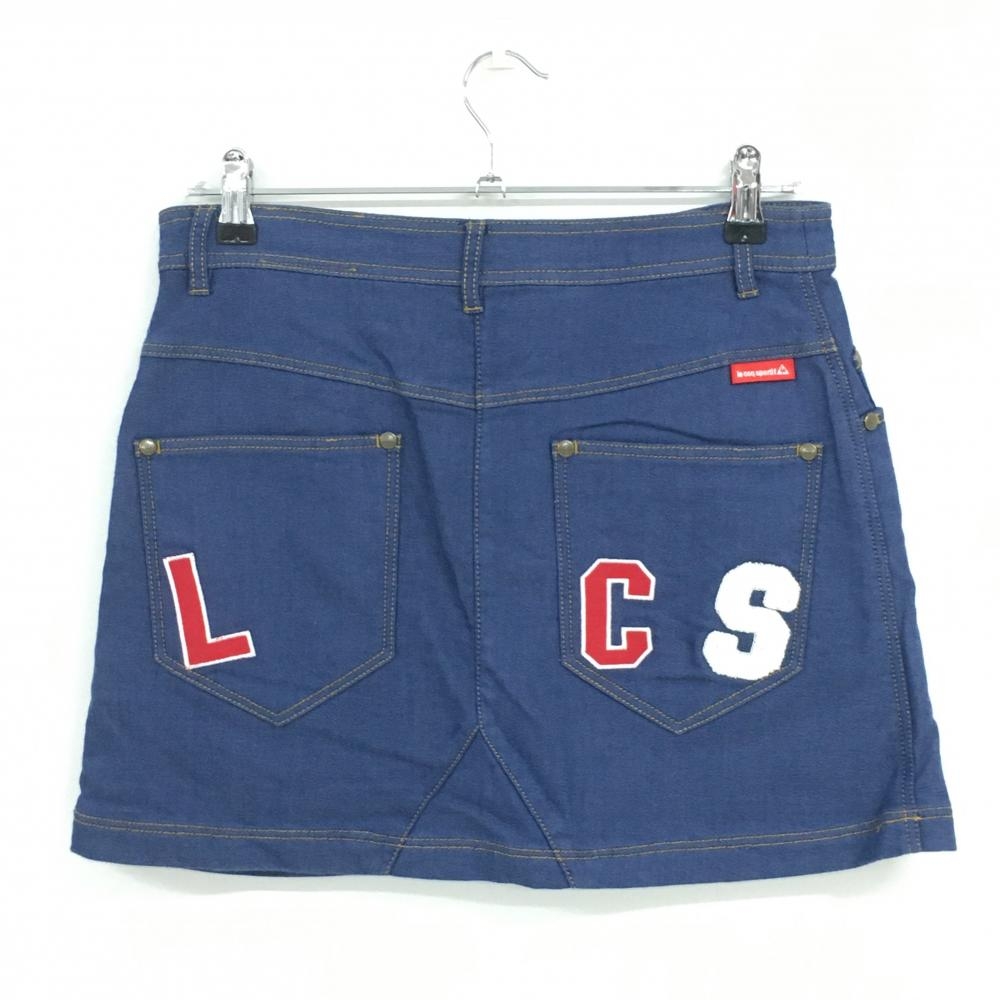 【美品】ルコック スカート ネイビー×ブラウン デニム風 ロゴ刺しゅう 複数ワッペン ステッチ レディース 11 ゴルフウェア le coq sportif