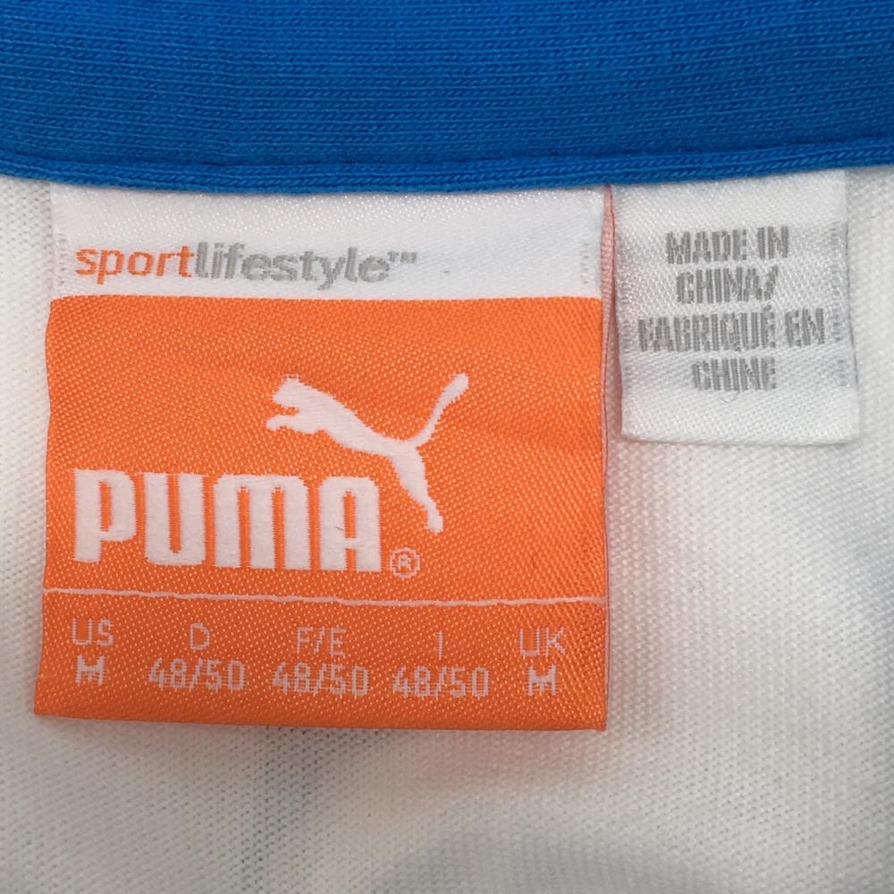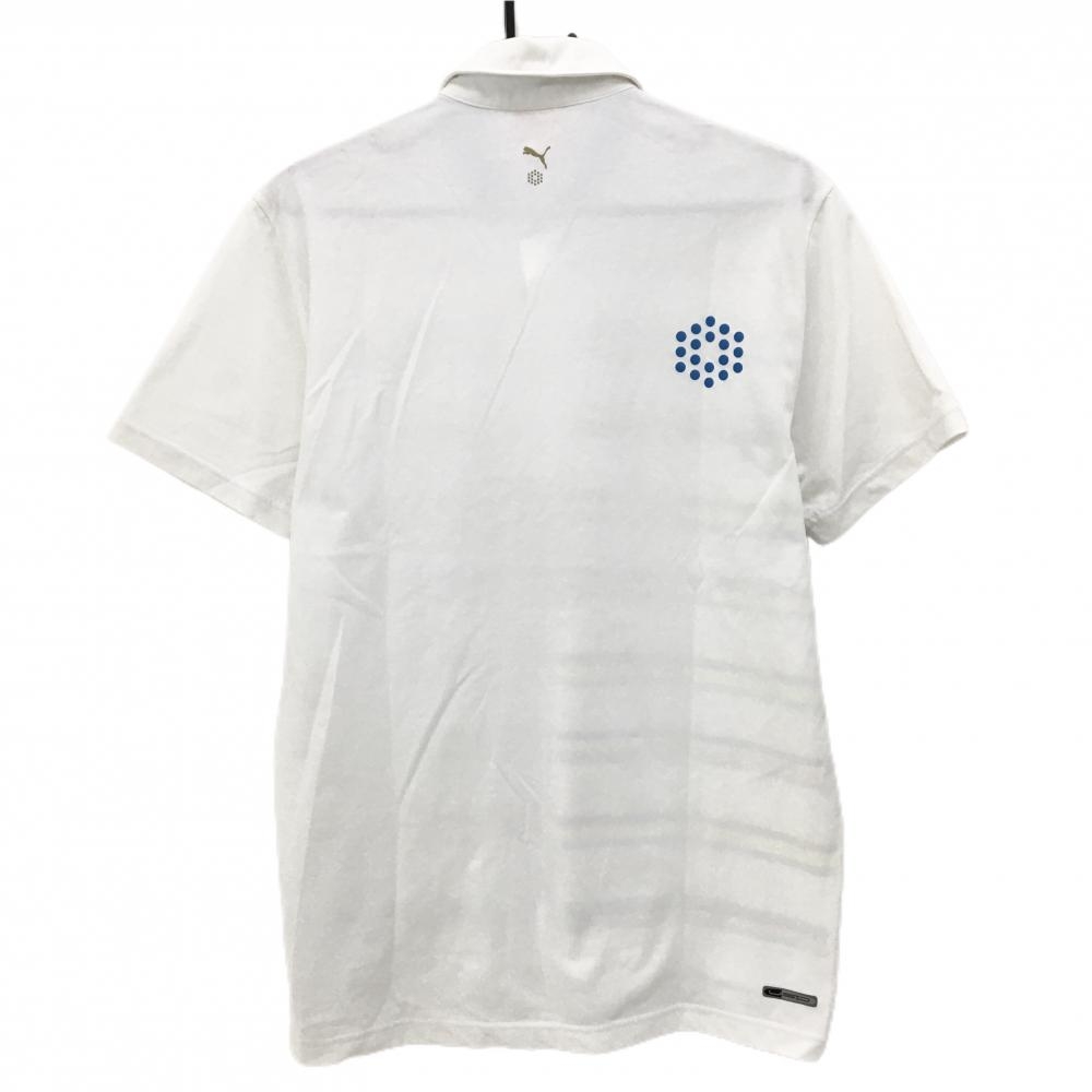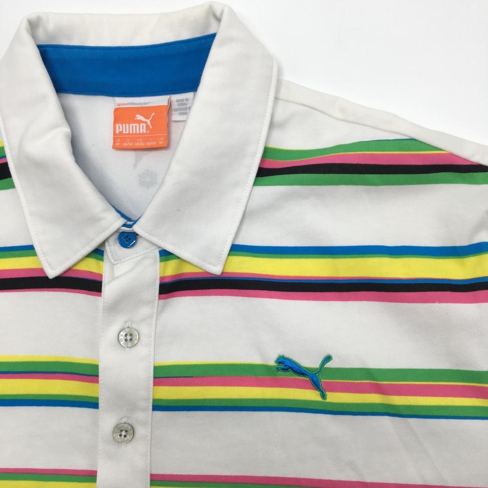【美品】プーマ 半袖ポロシャツ 白×イエロー×グリーン 前ボーダー コットン混 メンズ US-M ゴルフウェア PUMA
