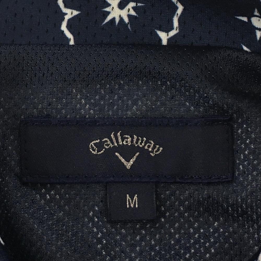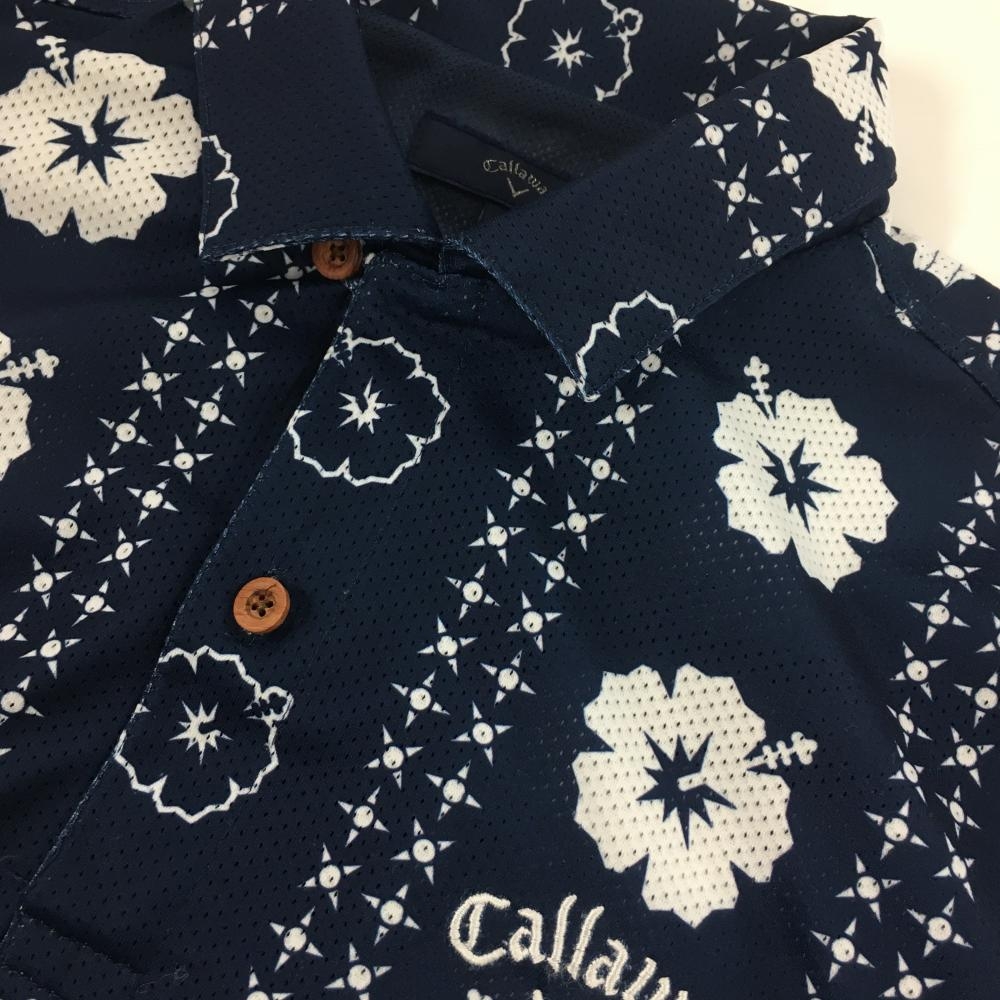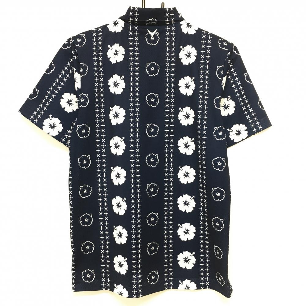 【超美品】キャロウェイ 半袖ポロシャツ ネイビー×白 ハイビスカス柄 メッシュ地 ロゴ刺しゅう メンズ M ゴルフウェア Callaway