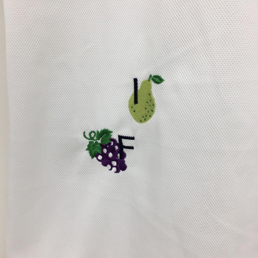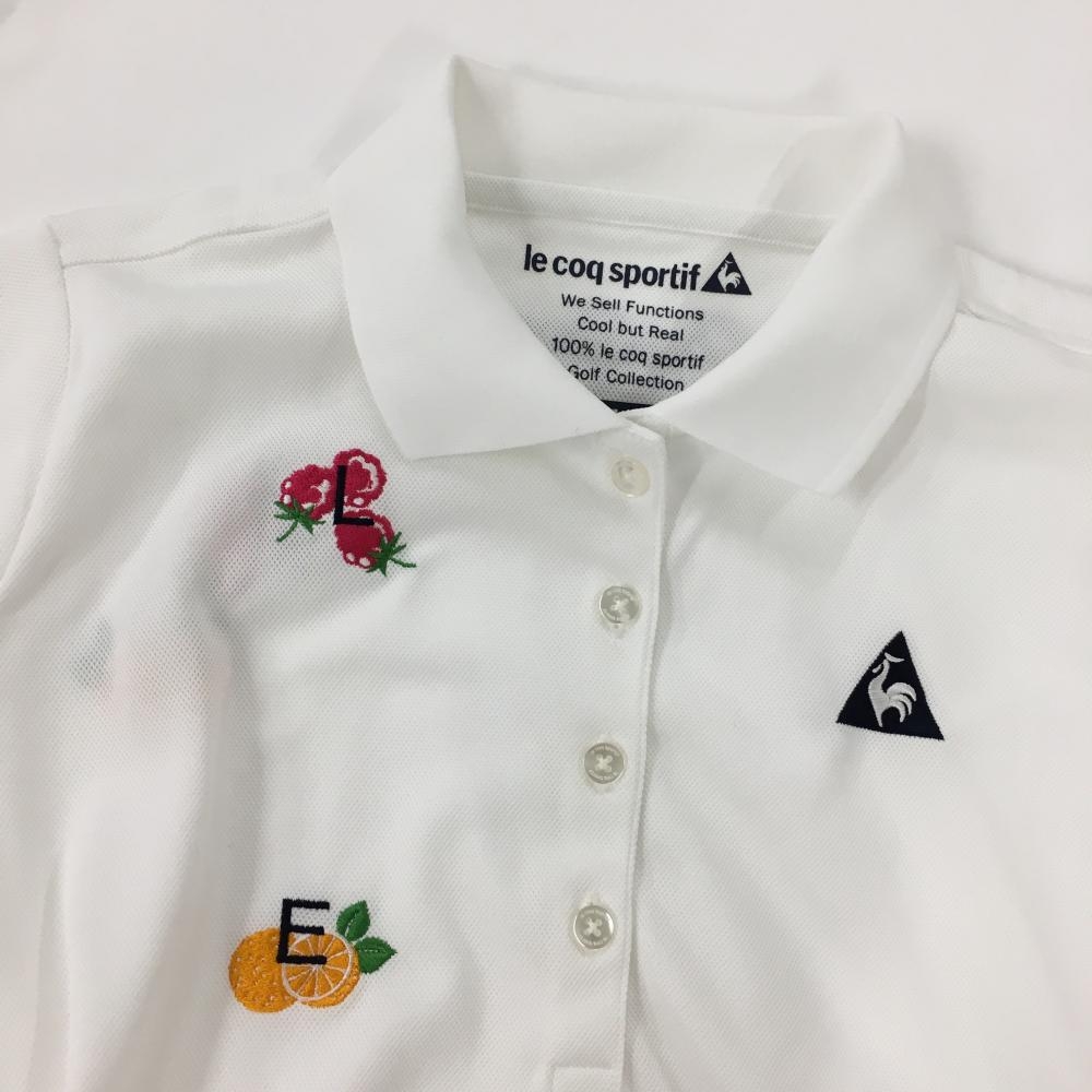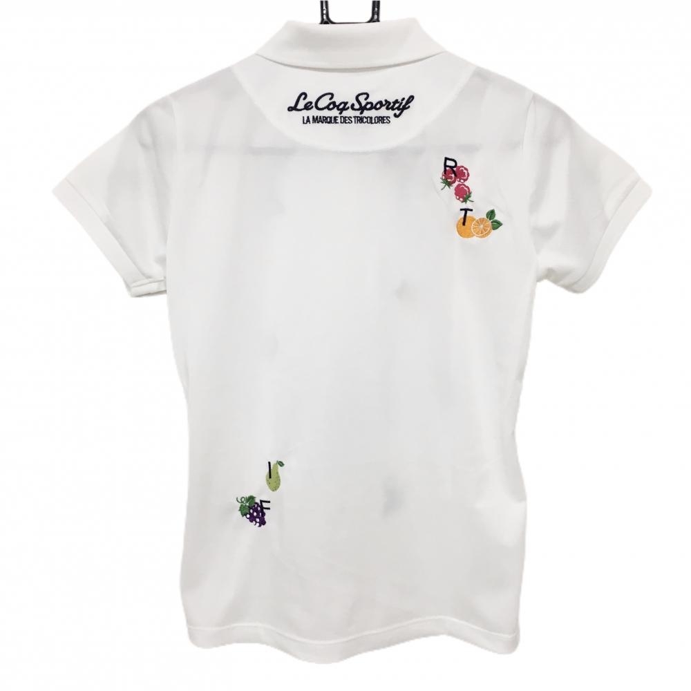 【超美品】ルコックゴルフ 半袖ポロシャツ 白×マルチカラー フルーツ刺しゅう総柄 レディース M ゴルフウェア le coq sportif