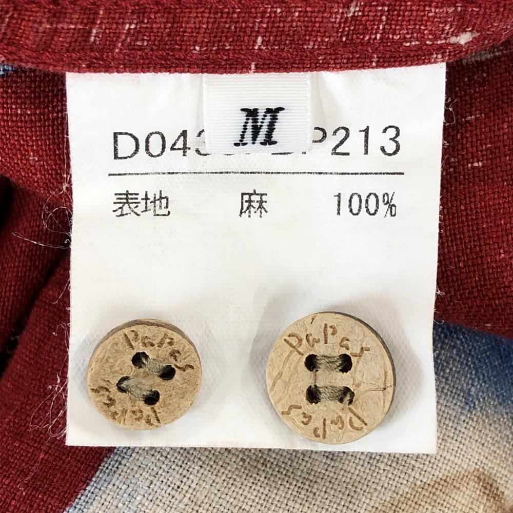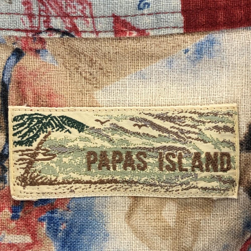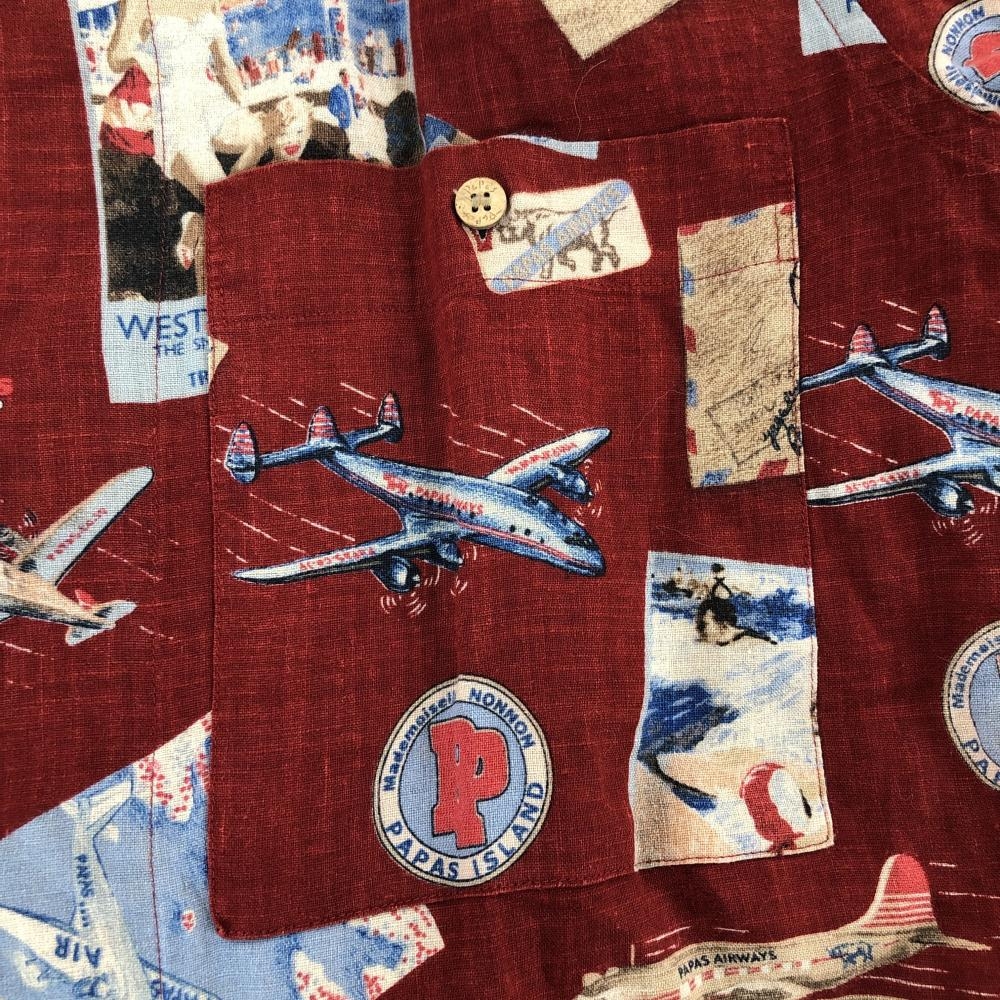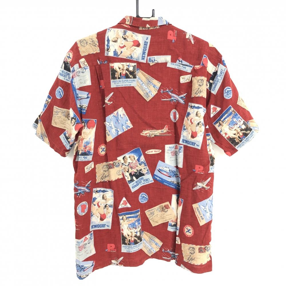 【超美品】パパスアイランド 半袖シャツ レッド×マルチカラー 総柄 飛行機 ハイビスカス 麻100% メンズ M ゴルフウェア PAPAS ISLAND