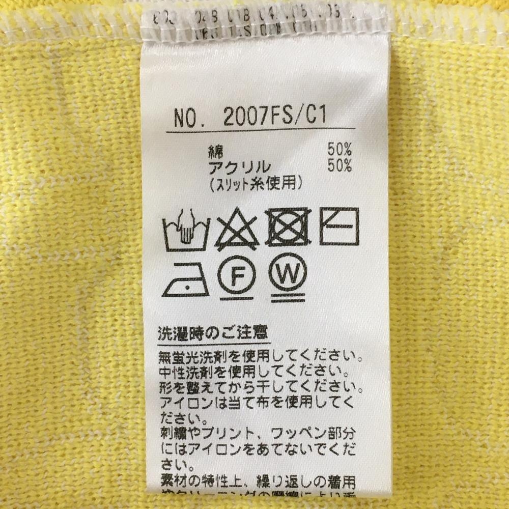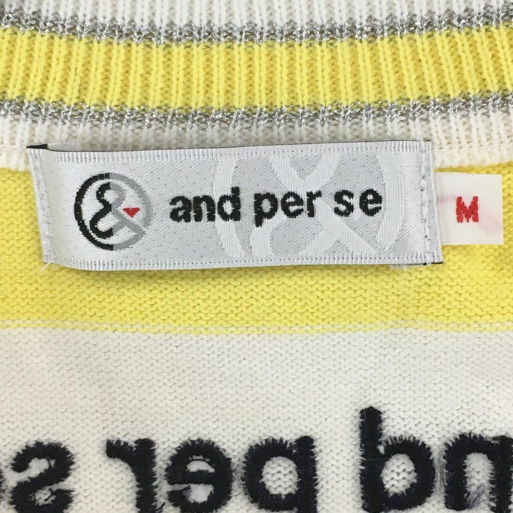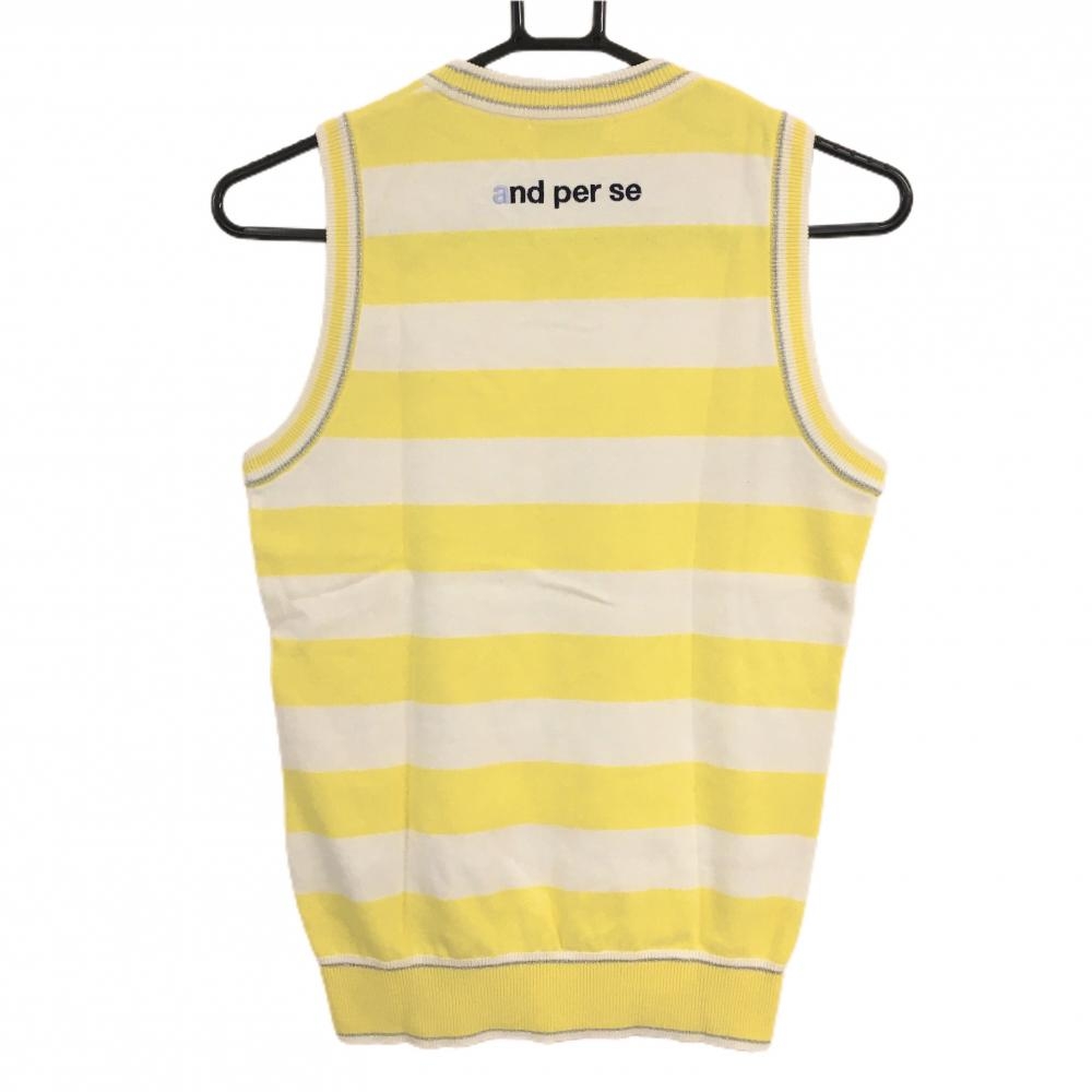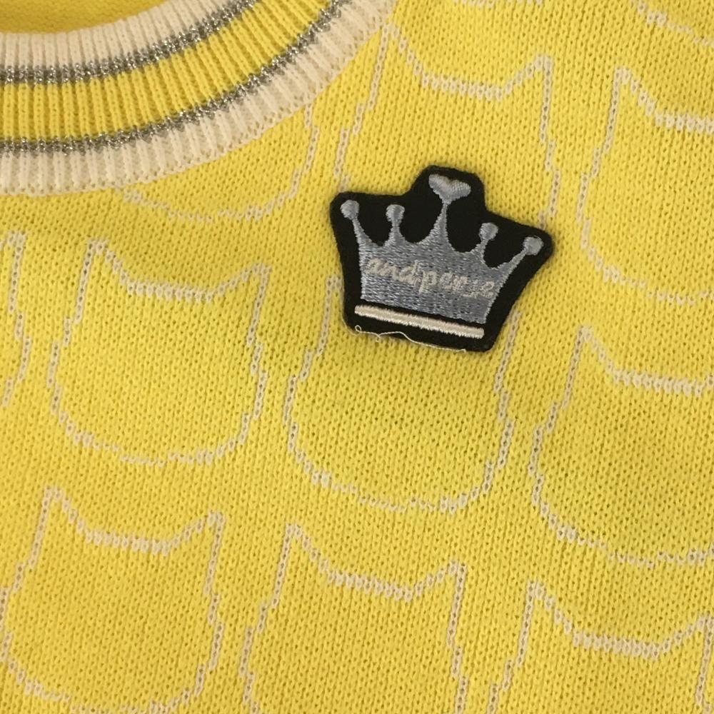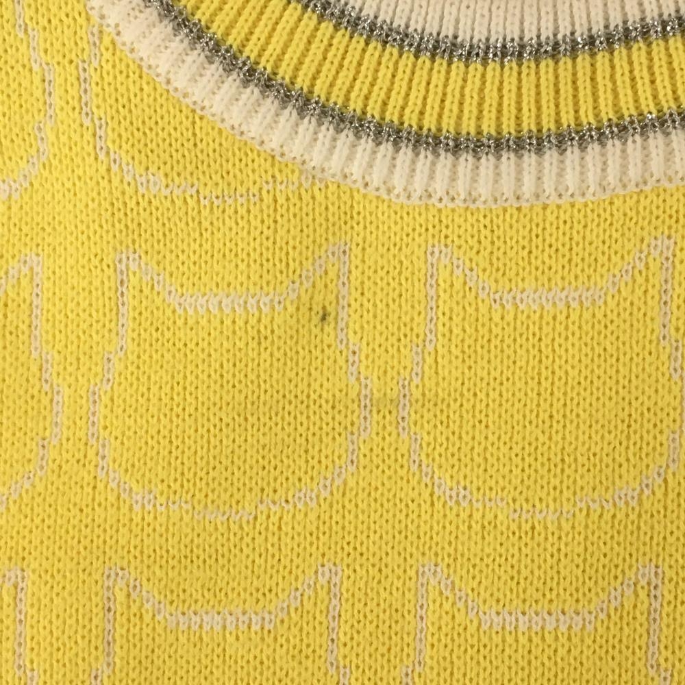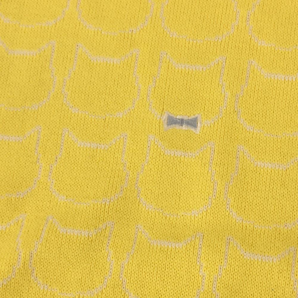 【超美品】アンパスィ ニットベスト イエロー×白 前ネコ柄織生地 背面ボーダー リボン刺しゅう レディース M ゴルフウェア and per se