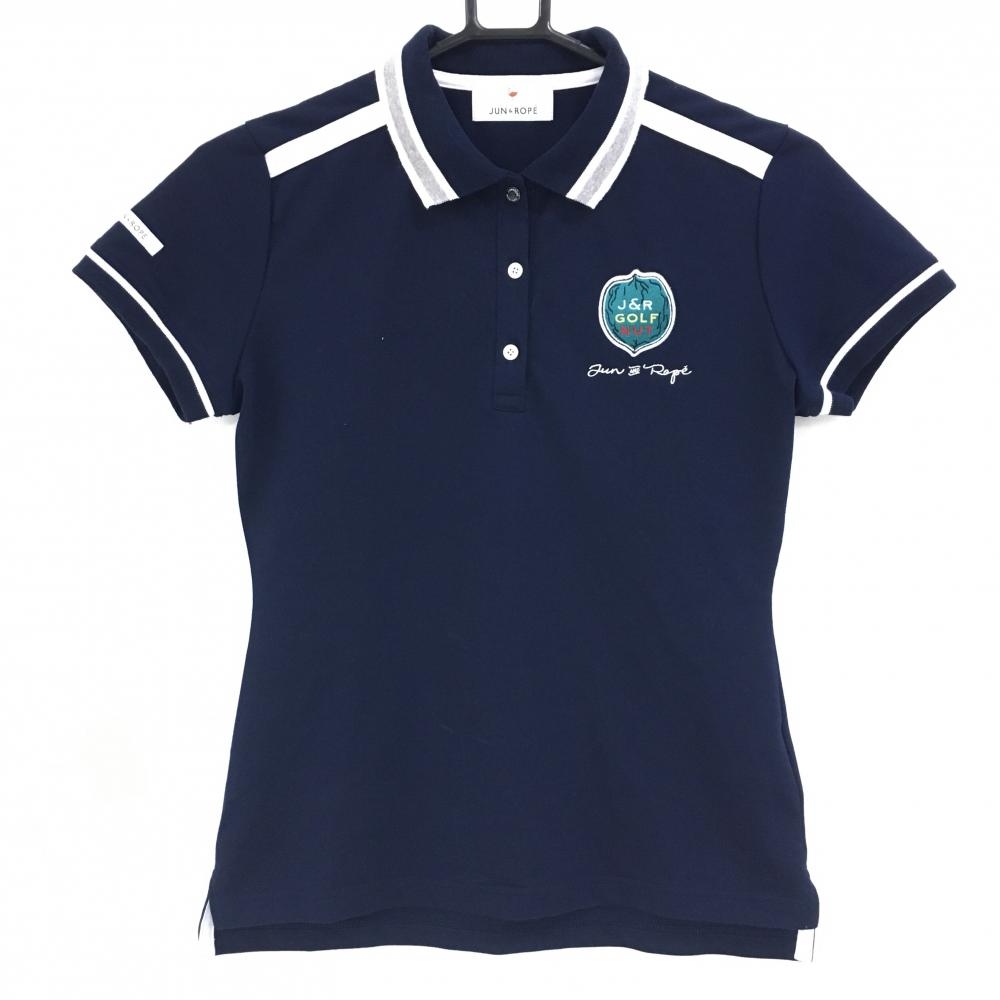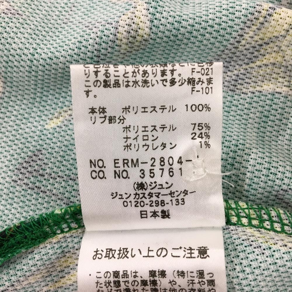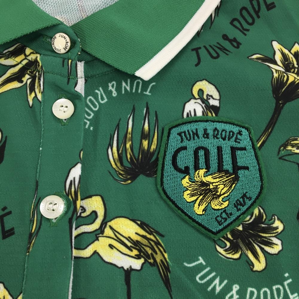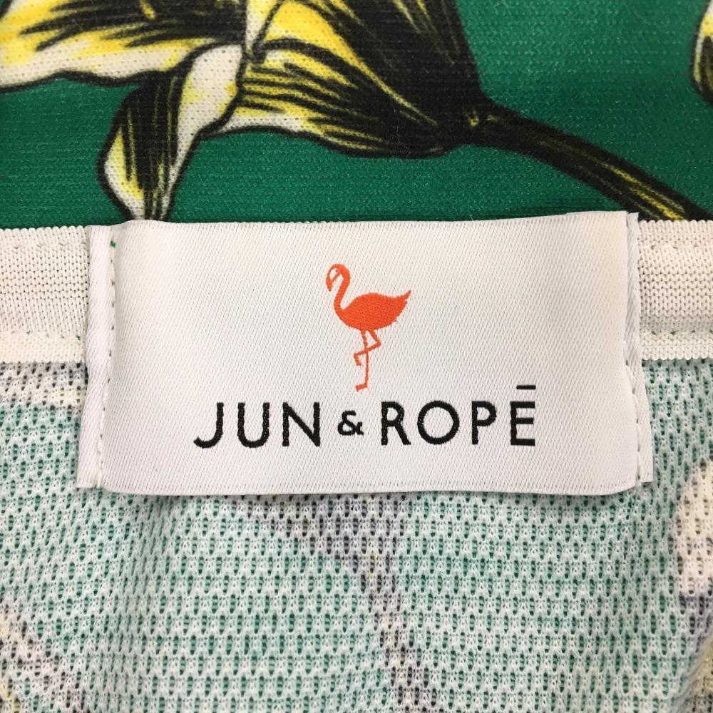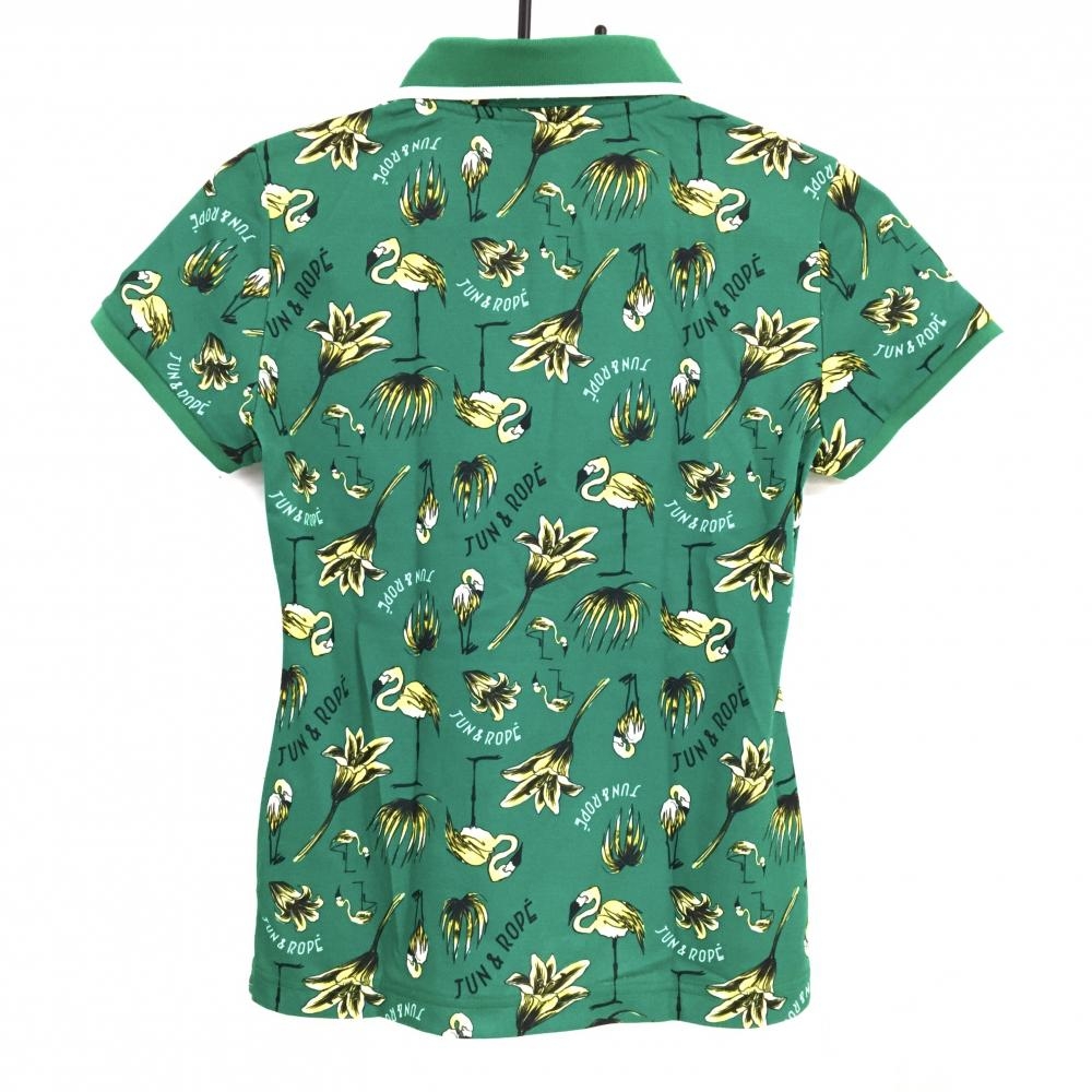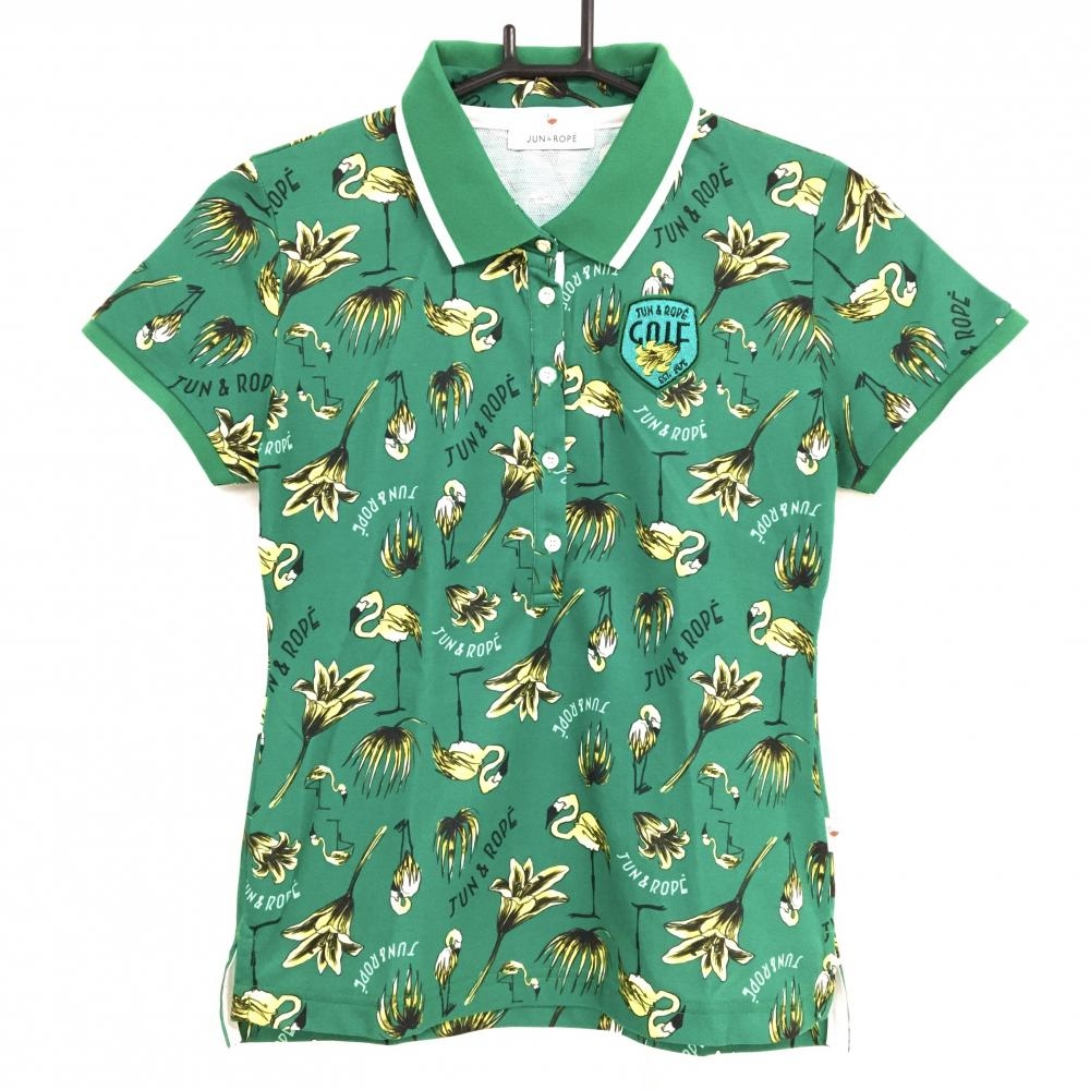 【超美品】ジュンアンドロペ 半袖ポロシャツ グリーン×イエロー 総柄 フラミンゴ 胸元ワッペン レディース M ゴルフウェア JUN&ROPE