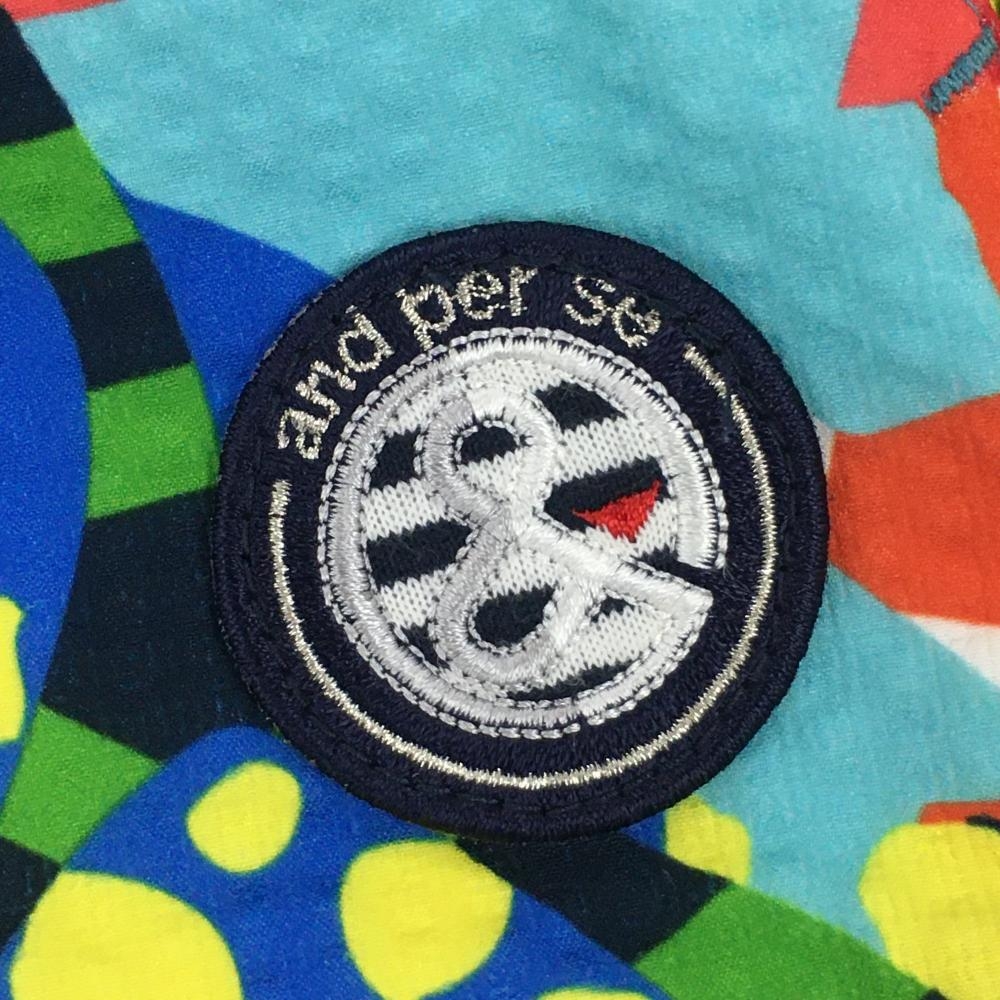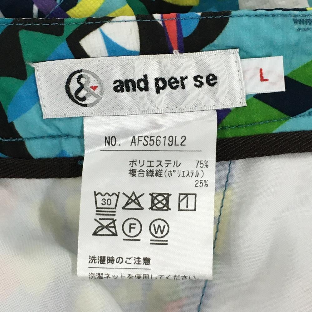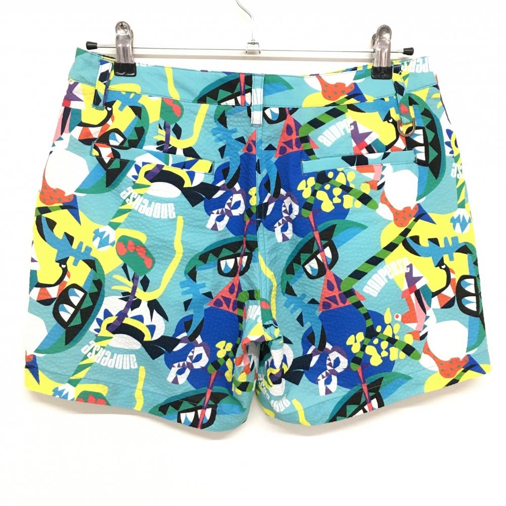 【超美品】アンパスィ ショートパンツ ライトブルー×マルチカラー 総柄 サッカー生地 ロゴワッペン レディース L ゴルフウェア and per se
