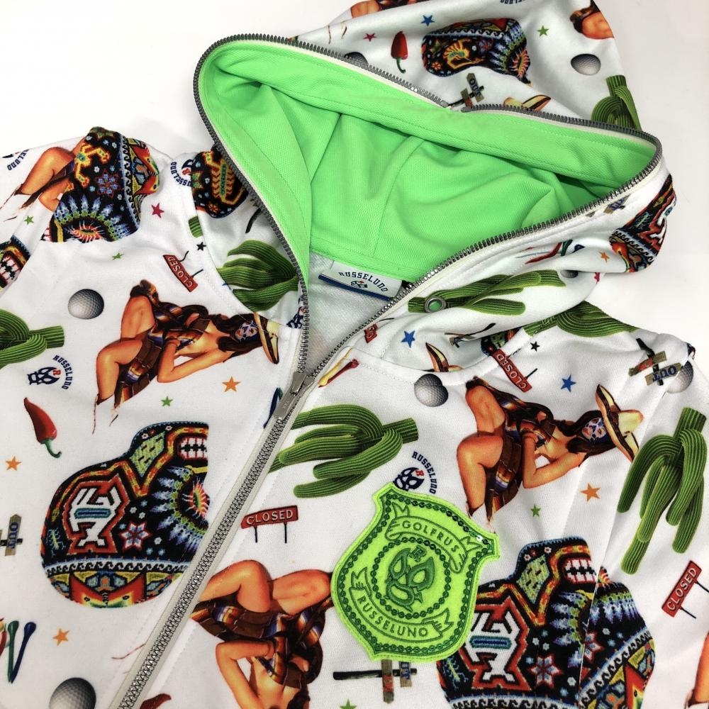 【美品】ラッセルノ 2WAYジップパーカー 白×マルチカラー スカル・サボテン総柄 袖着脱可 メンズ 4(M) ゴルフウェア RUSSELUNO