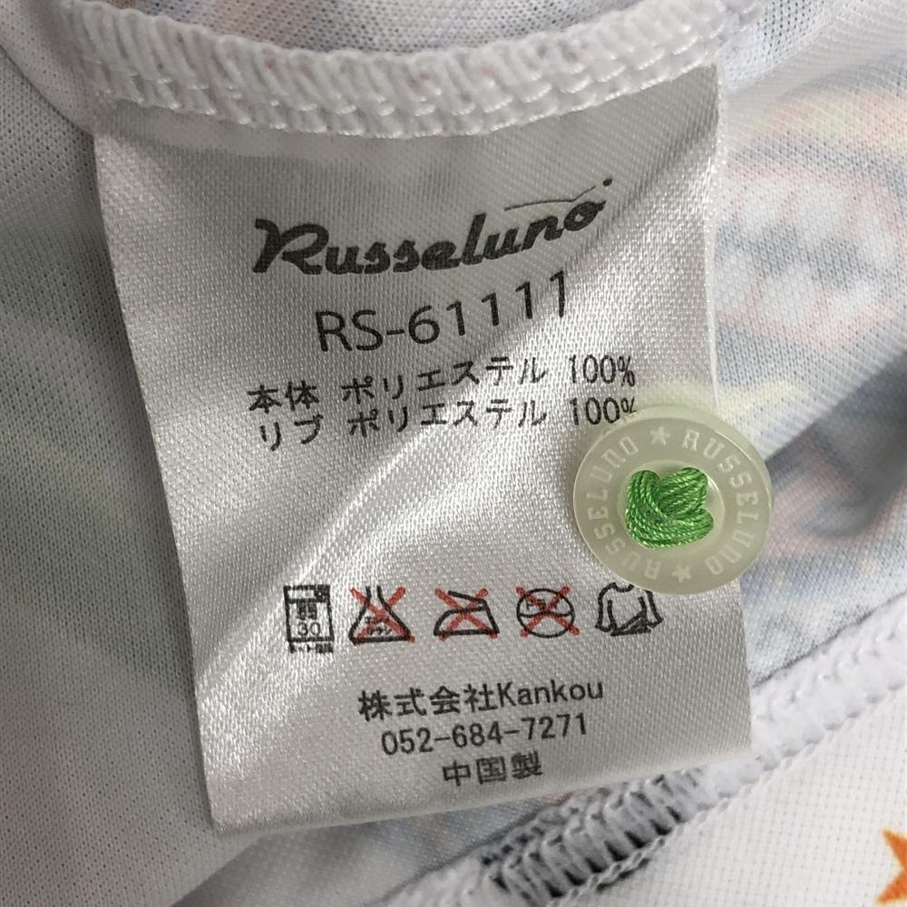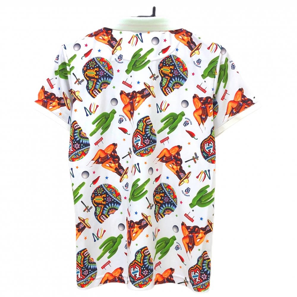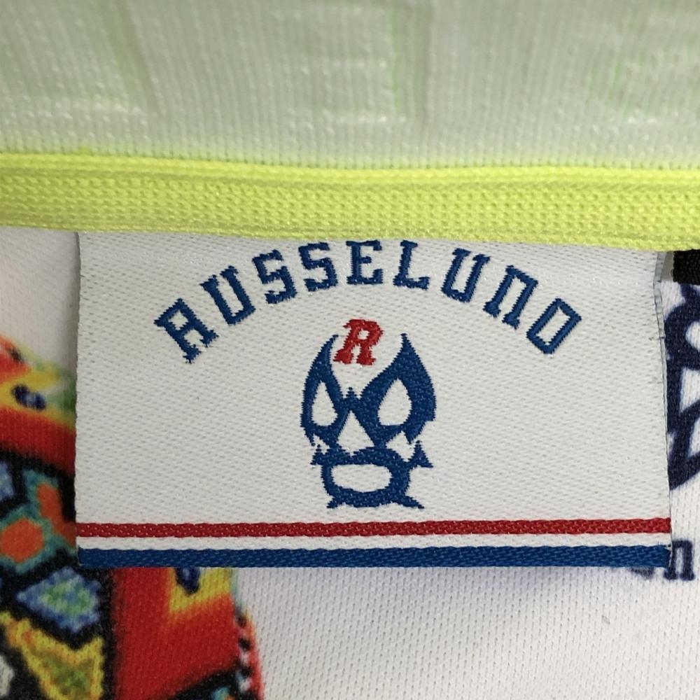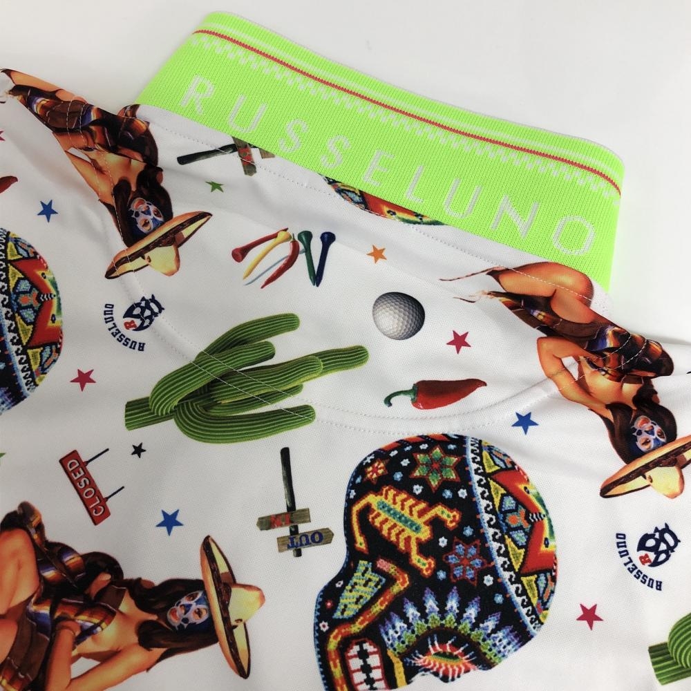 【超美品】ラッセルノ 半袖ポロシャツ 白×マルチカラー スカル・サボテン総柄 ルチャマスク 襟裏ロゴ メンズ 4(M) ゴルフウェア RUSSELUNO