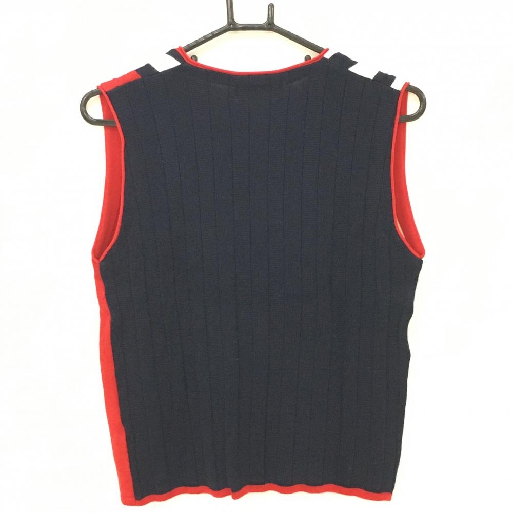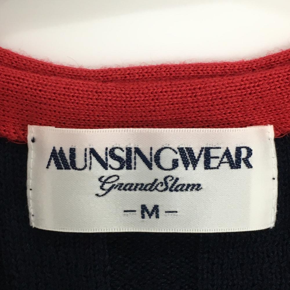 【美品】マンシングウェア ニットベスト レッド×白 ストライプ ロゴワッペン ウール混 レディース M ゴルフウェア Munsingwear