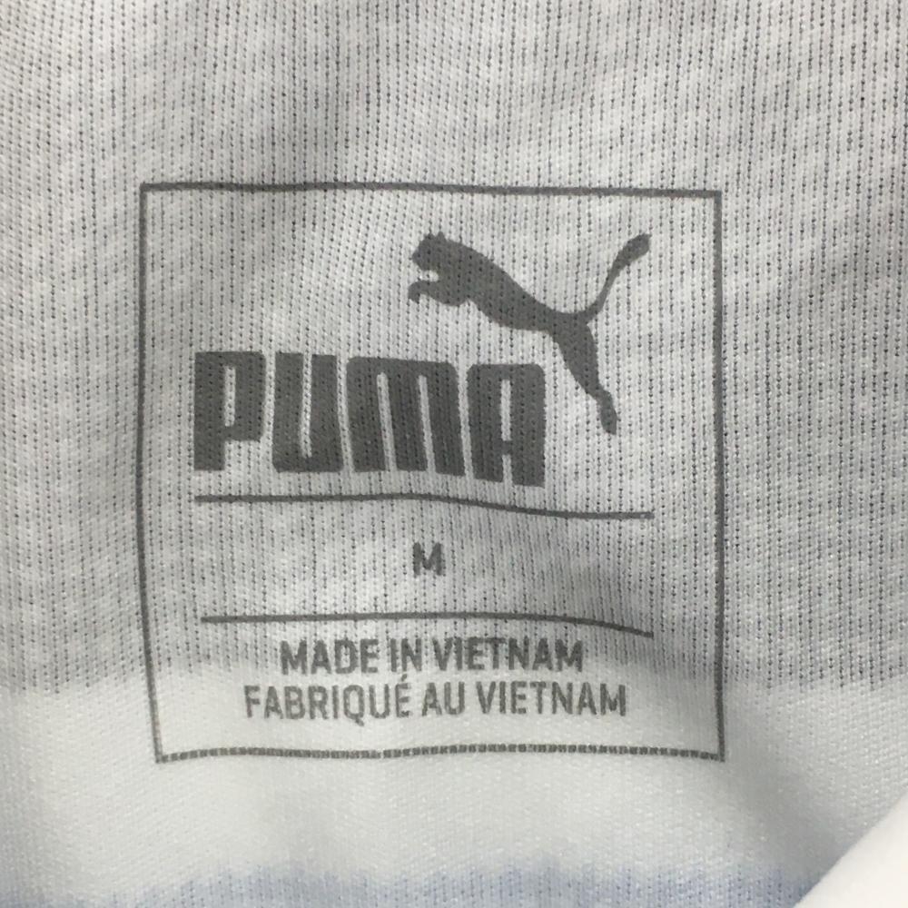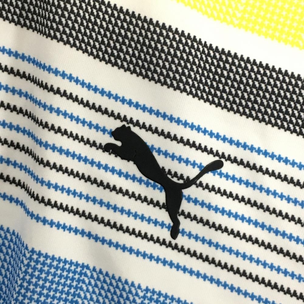【超美品】プーマ 半袖ポロシャツ 白×ブルー 上部ボーダー調 立体ロゴ メンズ M ゴルフウェア PUMA