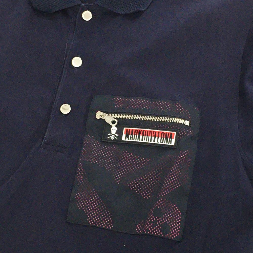マークアンドロナ 半袖ポロシャツ ネイビー×ピンク 胸ポケット スカル メンズ 46(M) ゴルフウェア MARK&LONA