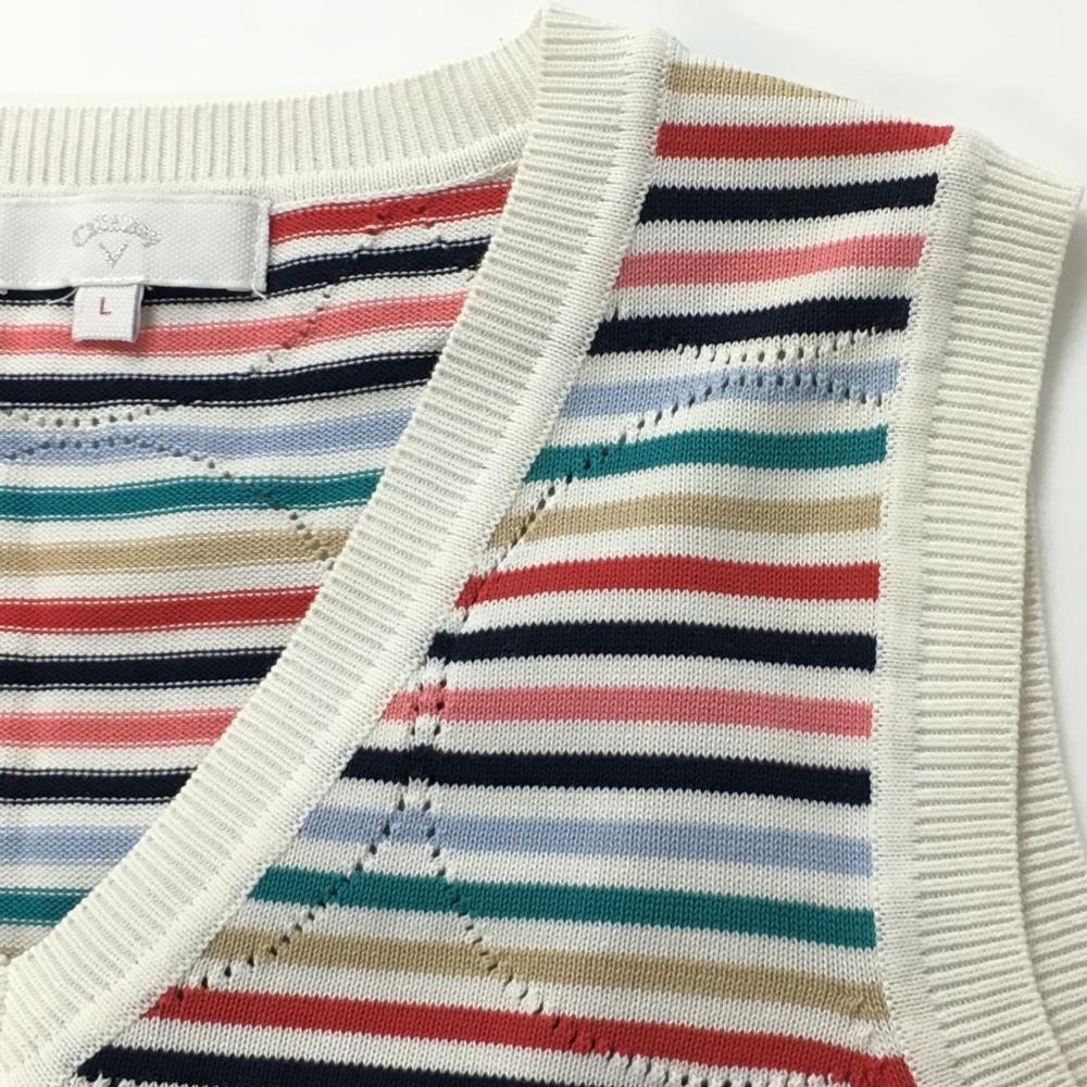 【美品】キャロウェイ ニットベスト マルチカラー ボーダー ドット透かし編み Vネック レディース L ゴルフウェア Callaway