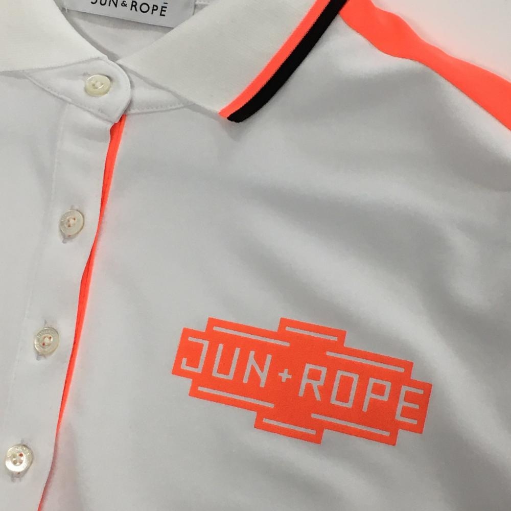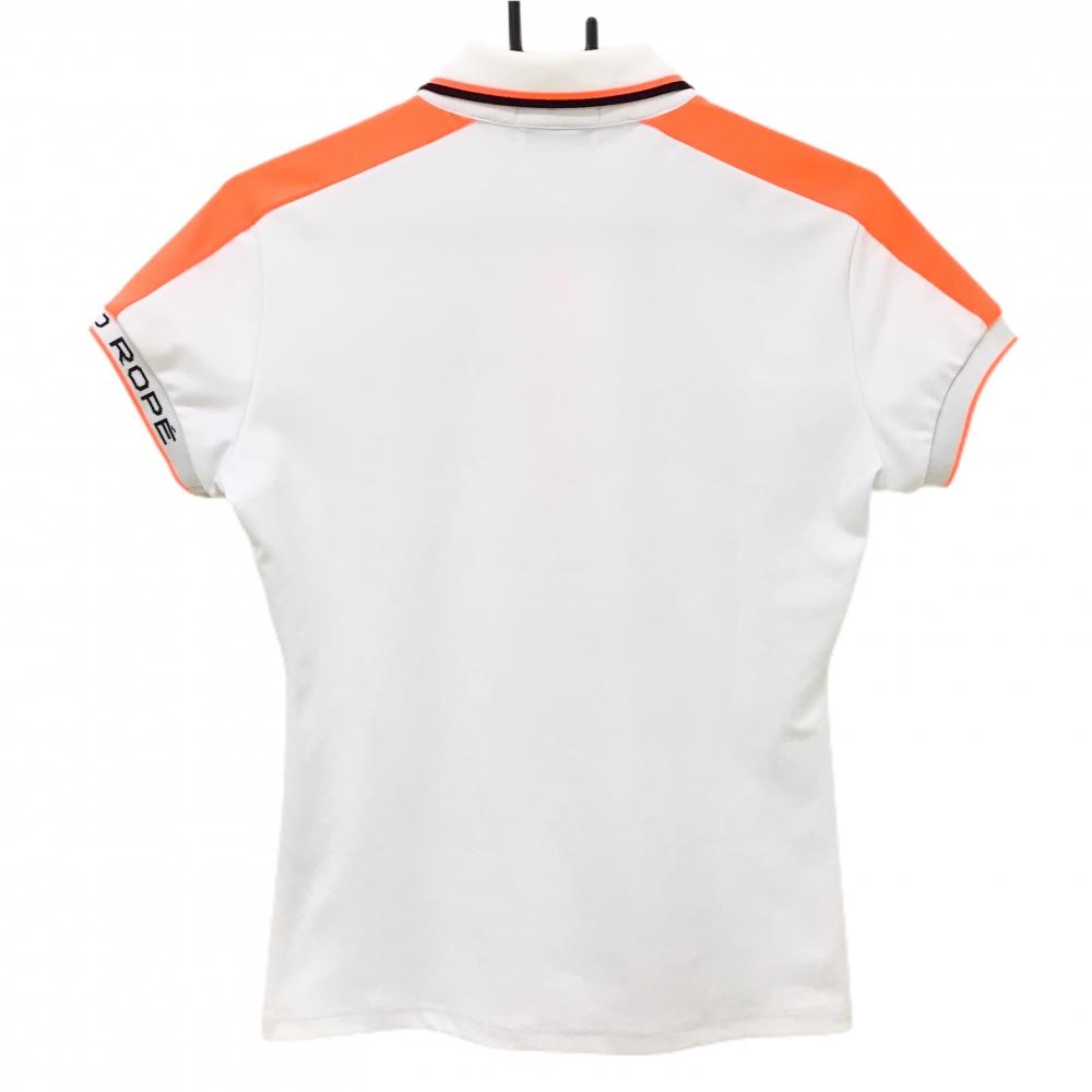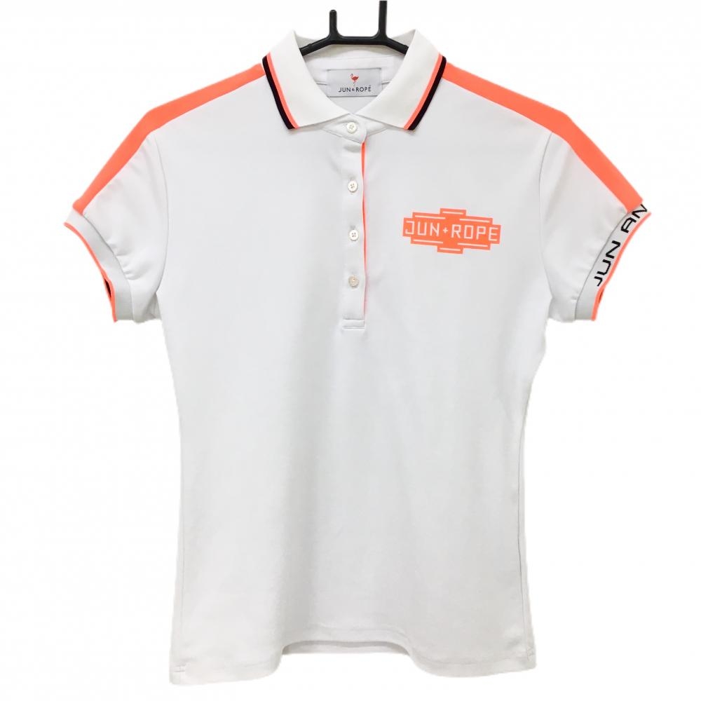 【美品】ジュンアンドロペ 半袖ポロシャツ 白×蛍光オレンジ系 袖口ロゴ 襟縁ライン レディース S ゴルフウェア JUN&ROPE