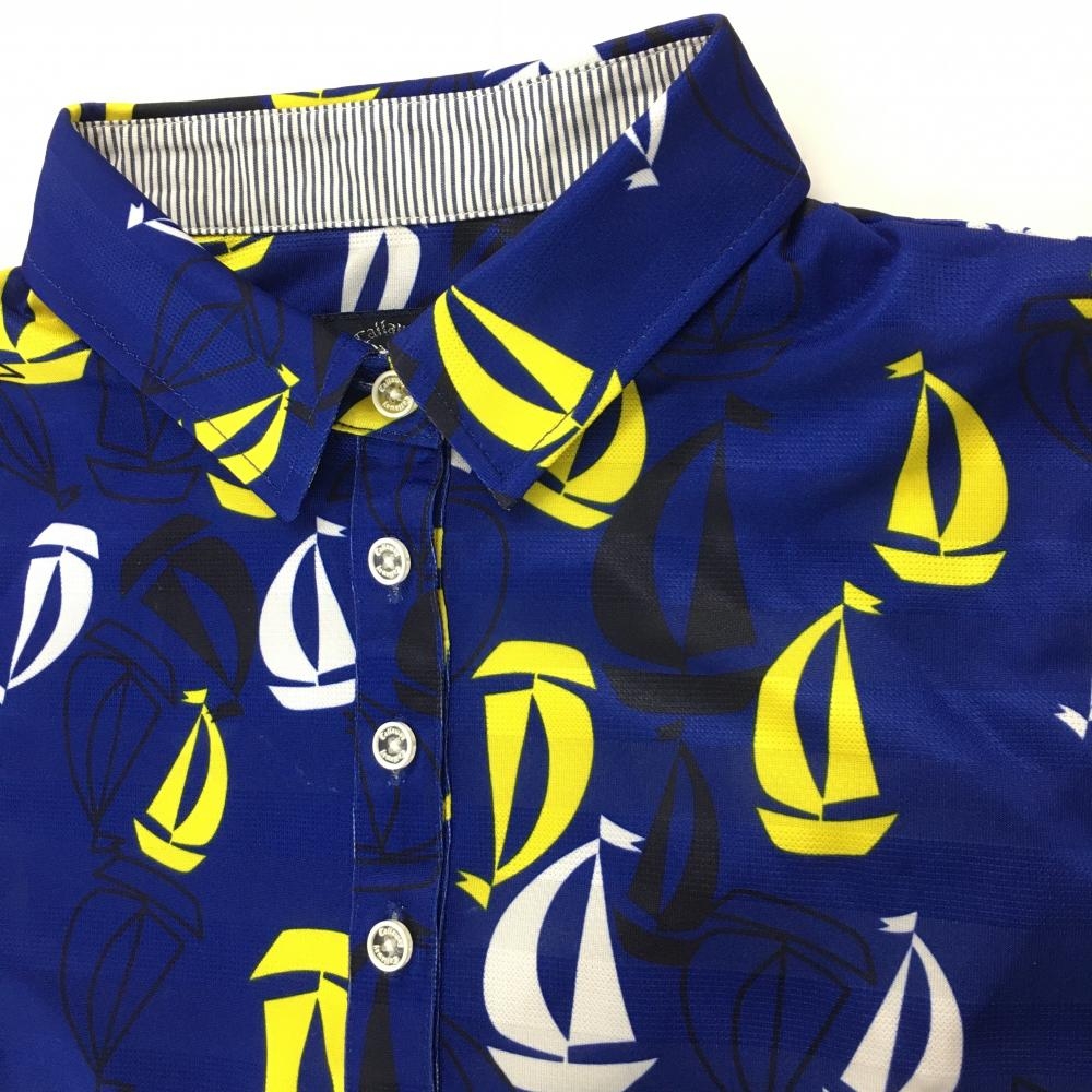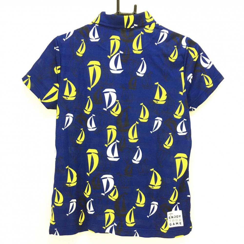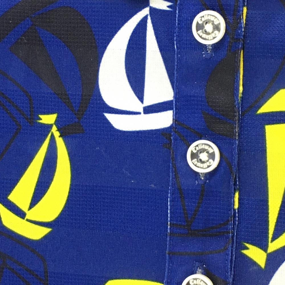 【美品】キャロウェイ 半袖ポロシャツ ブルー×イエロー ヨット柄 ボーダー織生地 レディース L ゴルフウェア Callaway