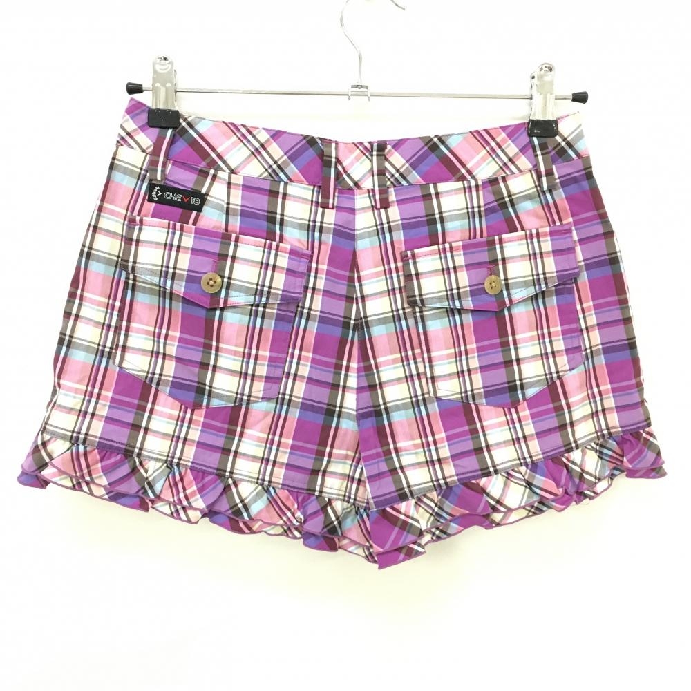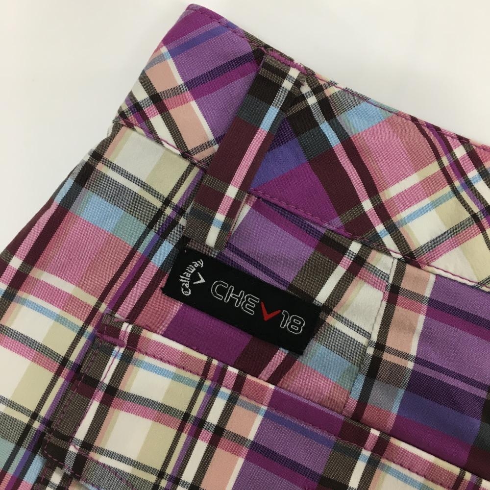 【超美品】キャロウェイ ショートパンツ 白×パープル×ピンク チェック 裾フリル ストレッチ レディース S ゴルフウェア Callaway