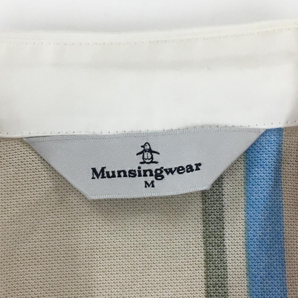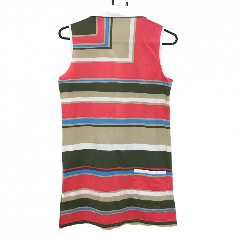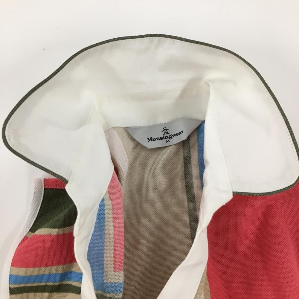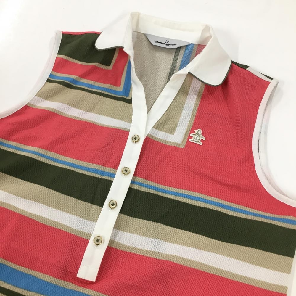 【美品】マンシングウェア ノースリーブポロワンピース ピンク×ベージュ ボーダー調 ロゴワッペン レディース M ゴルフウェア Munsingwear
