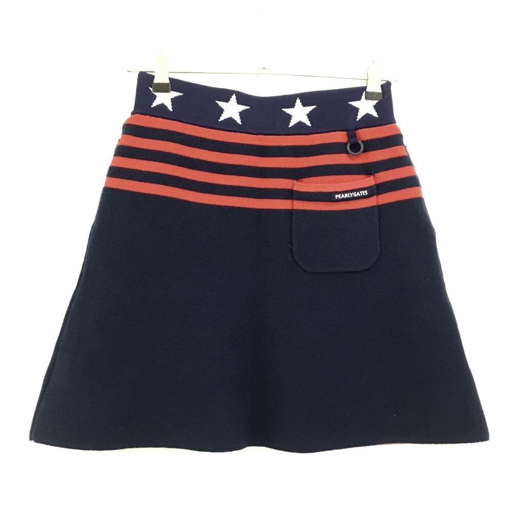 【美品】パーリーゲイツ ニットスカート ネイビー×レッド 上部ボーダー ウエスト星柄 レディース 1(M) ゴルフウェア PEARLY GATES