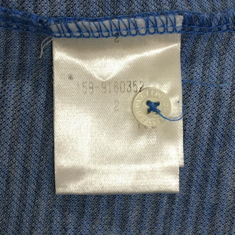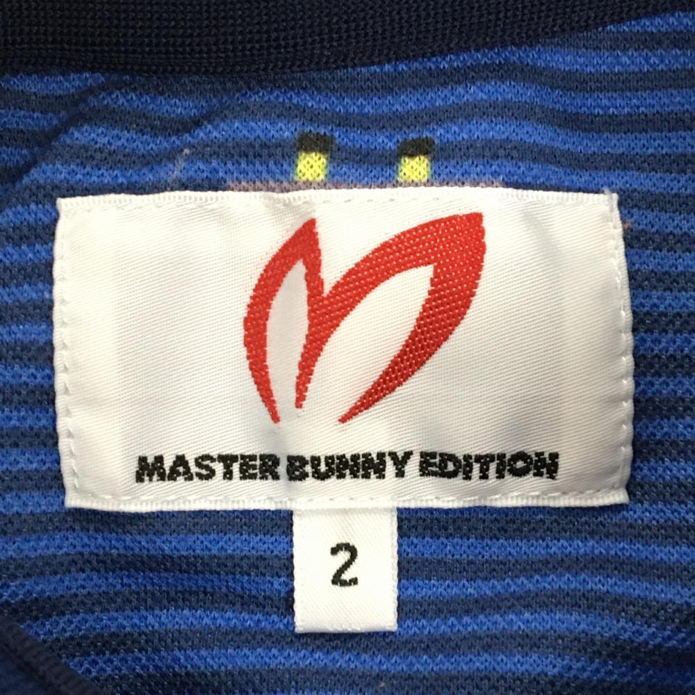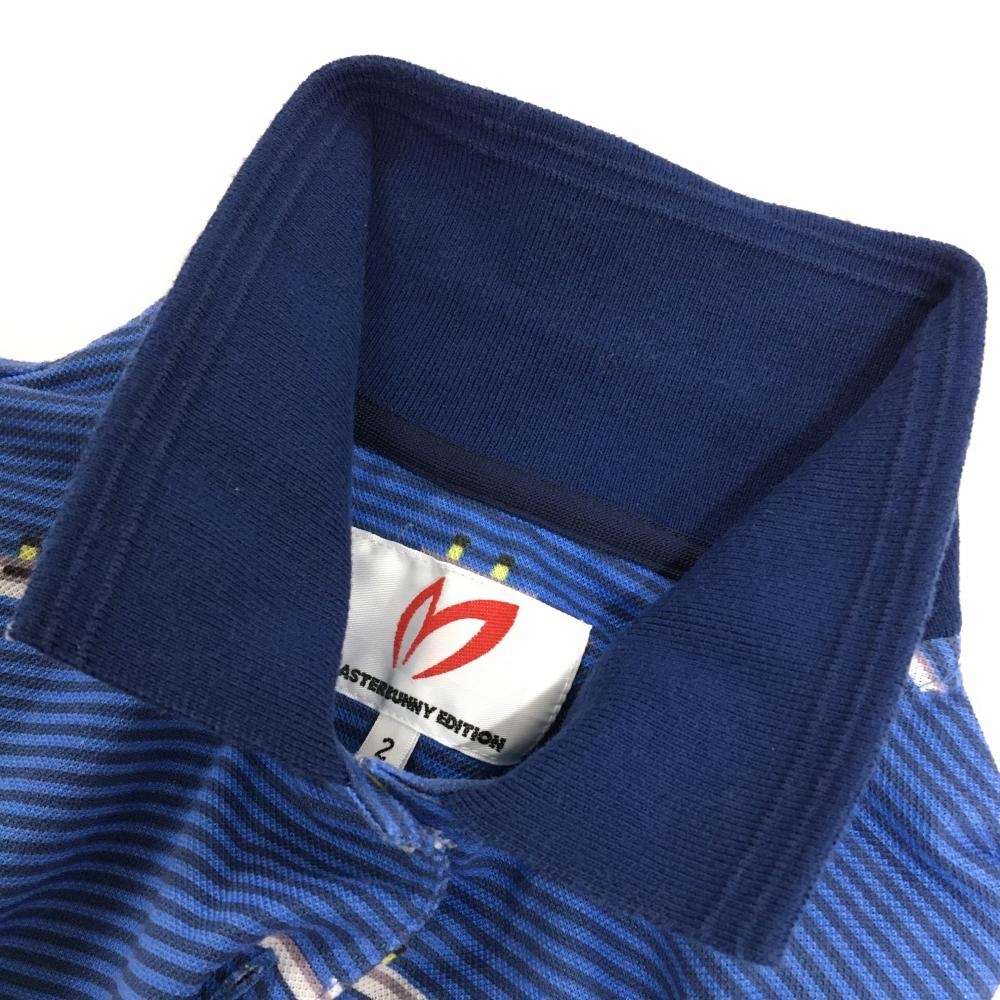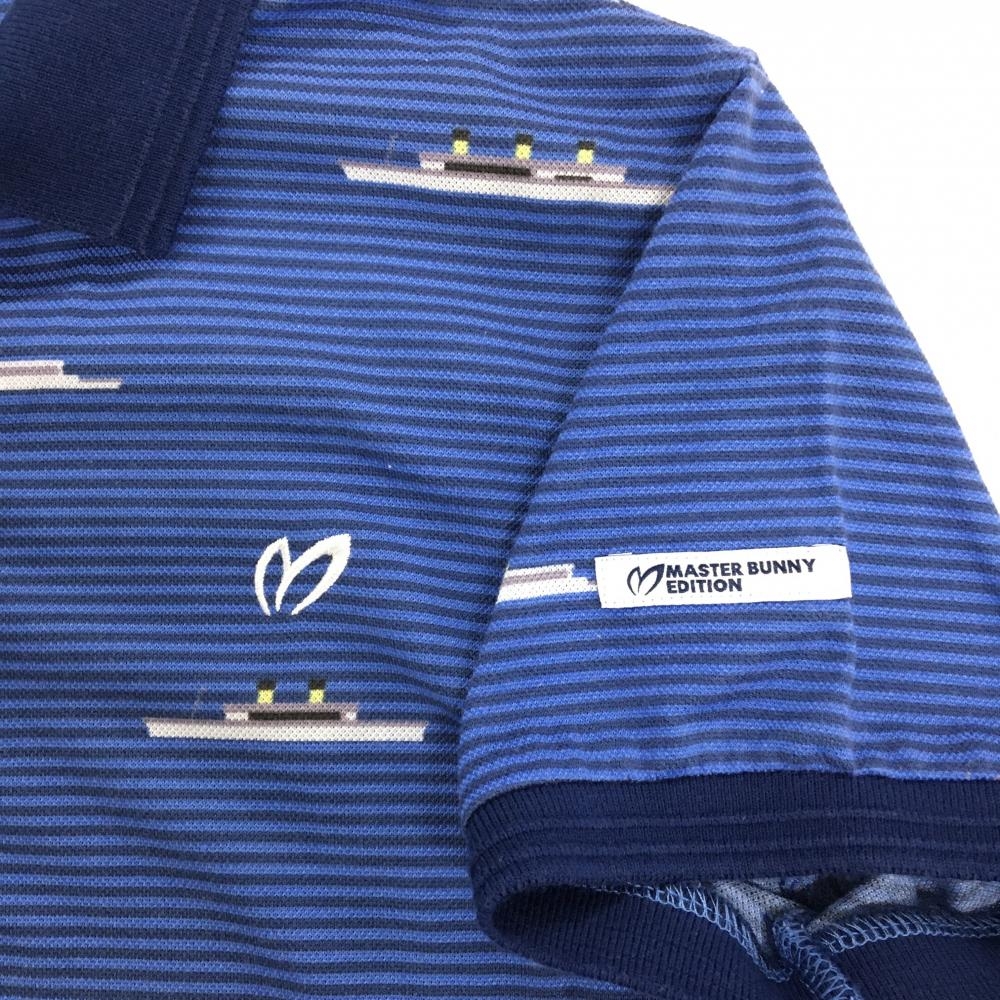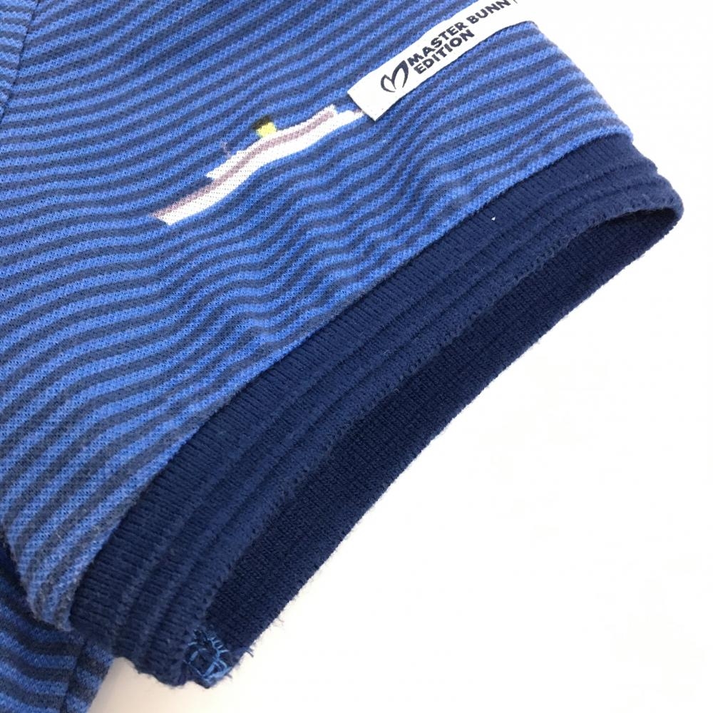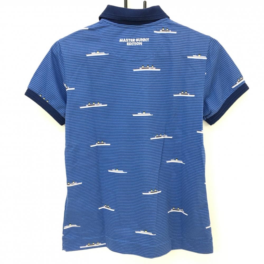 【美品】マスターバニー 半袖ポロシャツ ブルー×ネイビー 細ボーダー 船柄 レディース 2(L) ゴルフウェア MASTER BUNNY EDITION