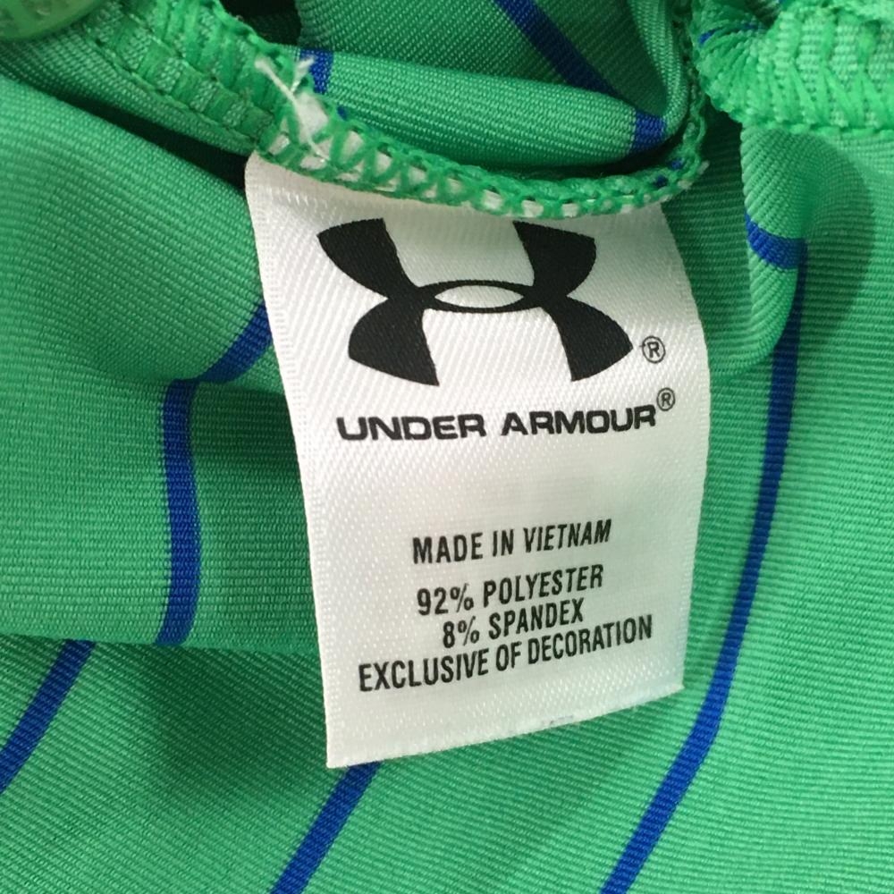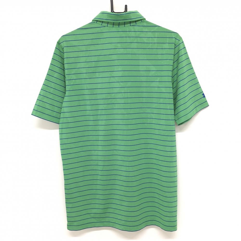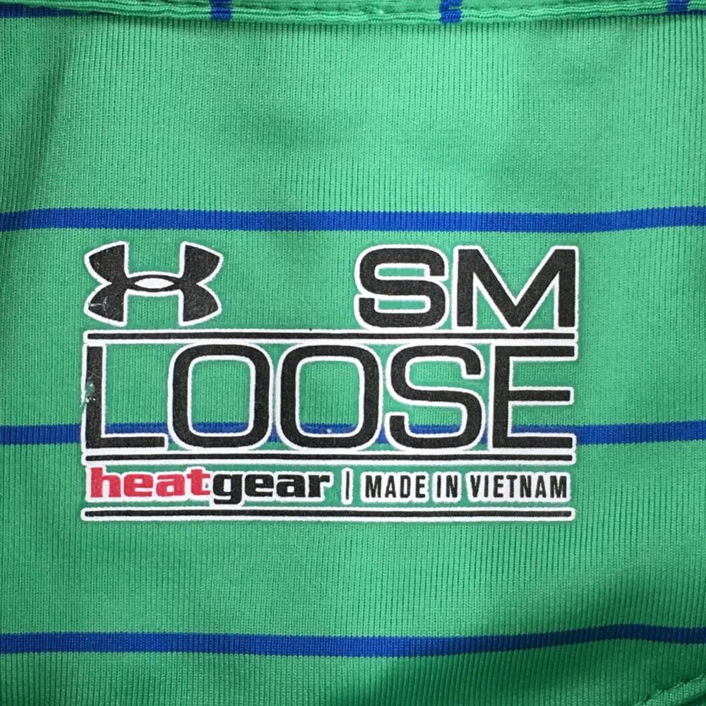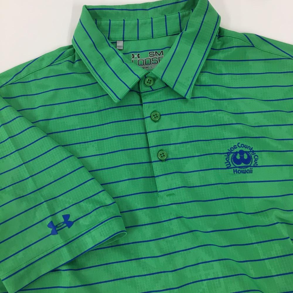 【超美品】アンダーアーマー 半袖ポロシャツ グリーン×ブルー 細ボーダー 地模様 heatgear メンズ SM ゴルフウェア UNDER ARMOUR