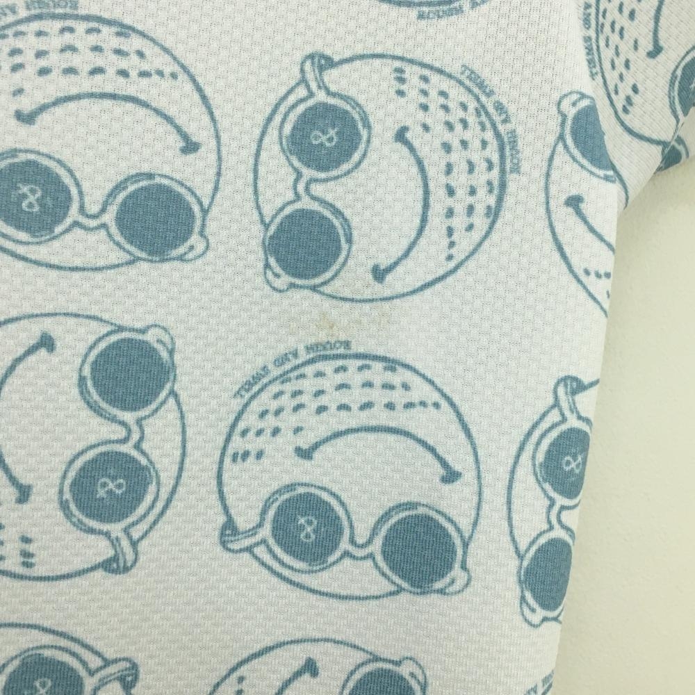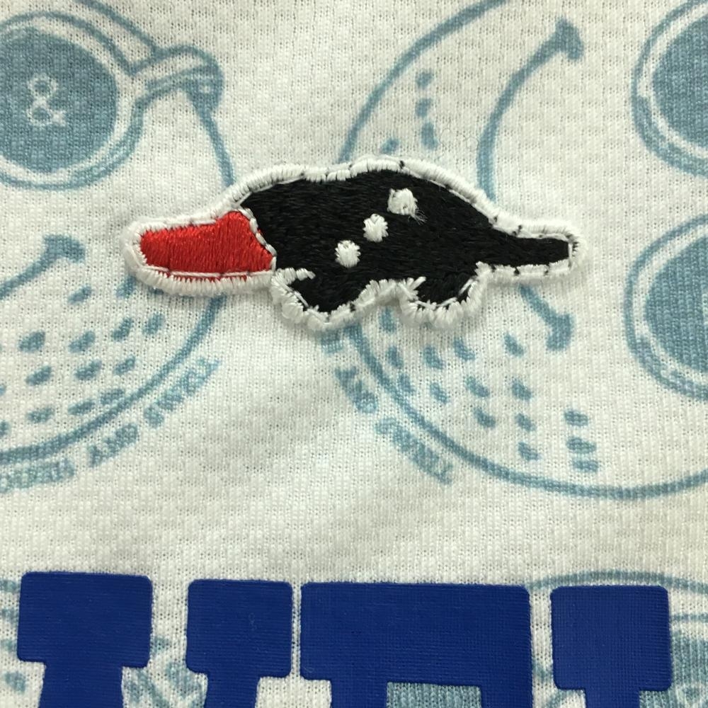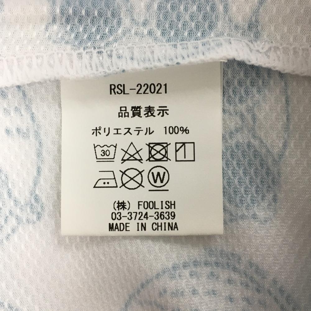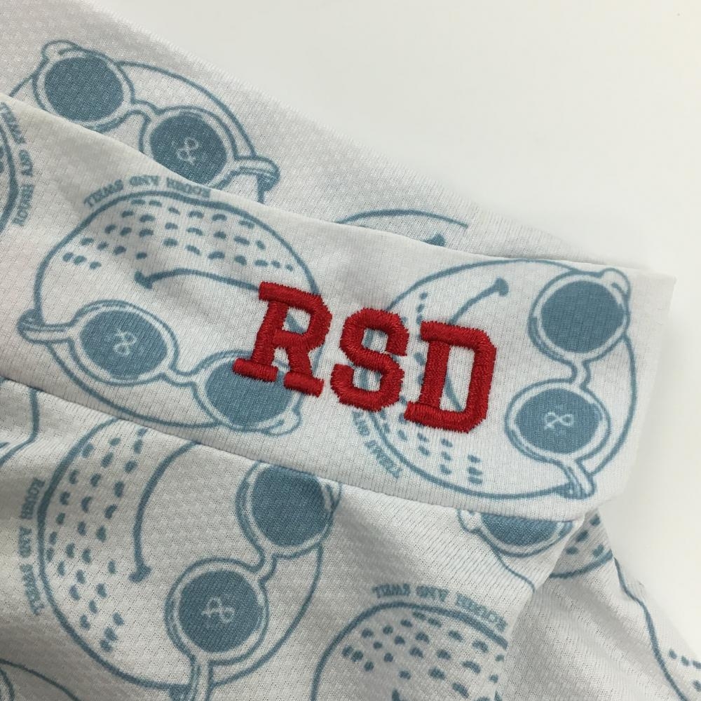 ラフアンドスウェル 半袖ハイネックシャツ 白×スモーキーブルー ゴルフボール総柄 フロントロゴ レディース S ゴルフウェア rough&swell
