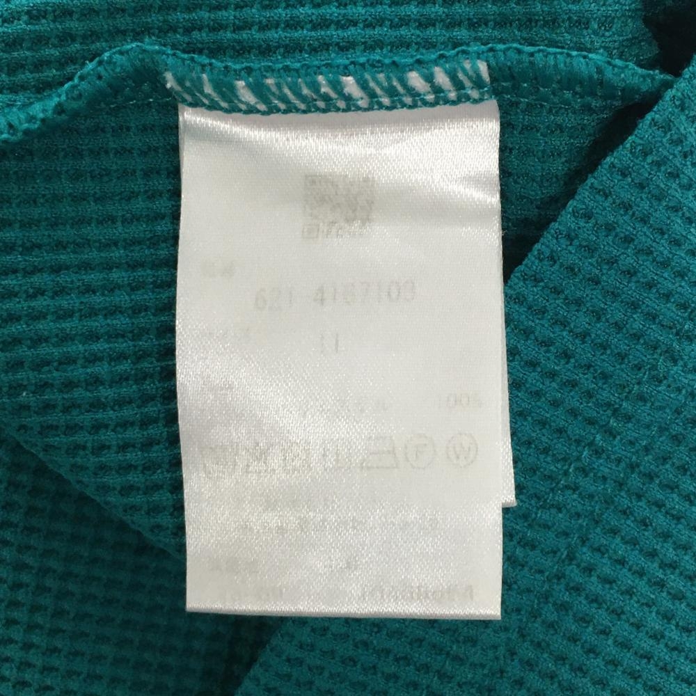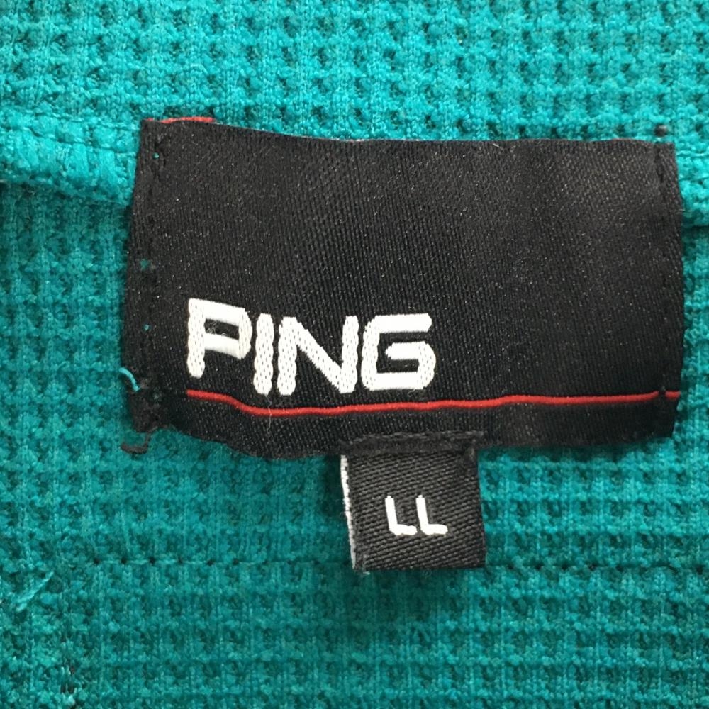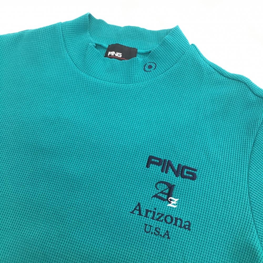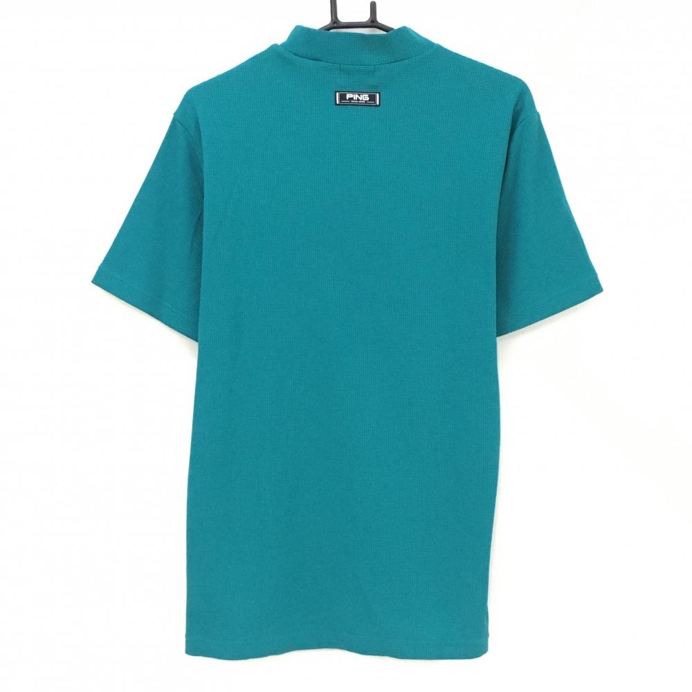 【美品】ピン 半袖ハイネックシャツ ブルーグリーン×ネイビー 凸凹織 ロゴ刺しゅう メンズ LL ゴルフウェア PING