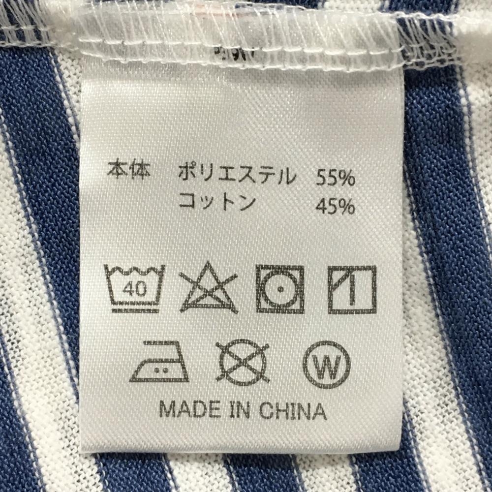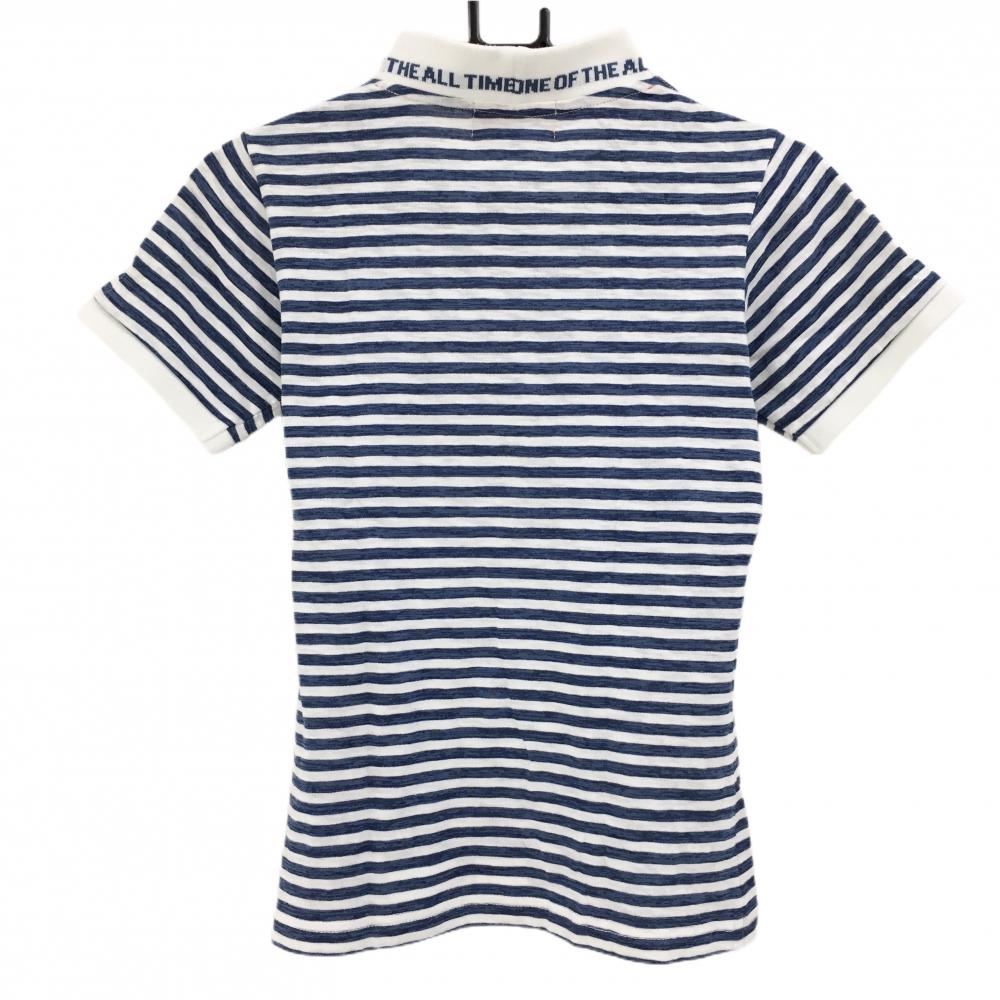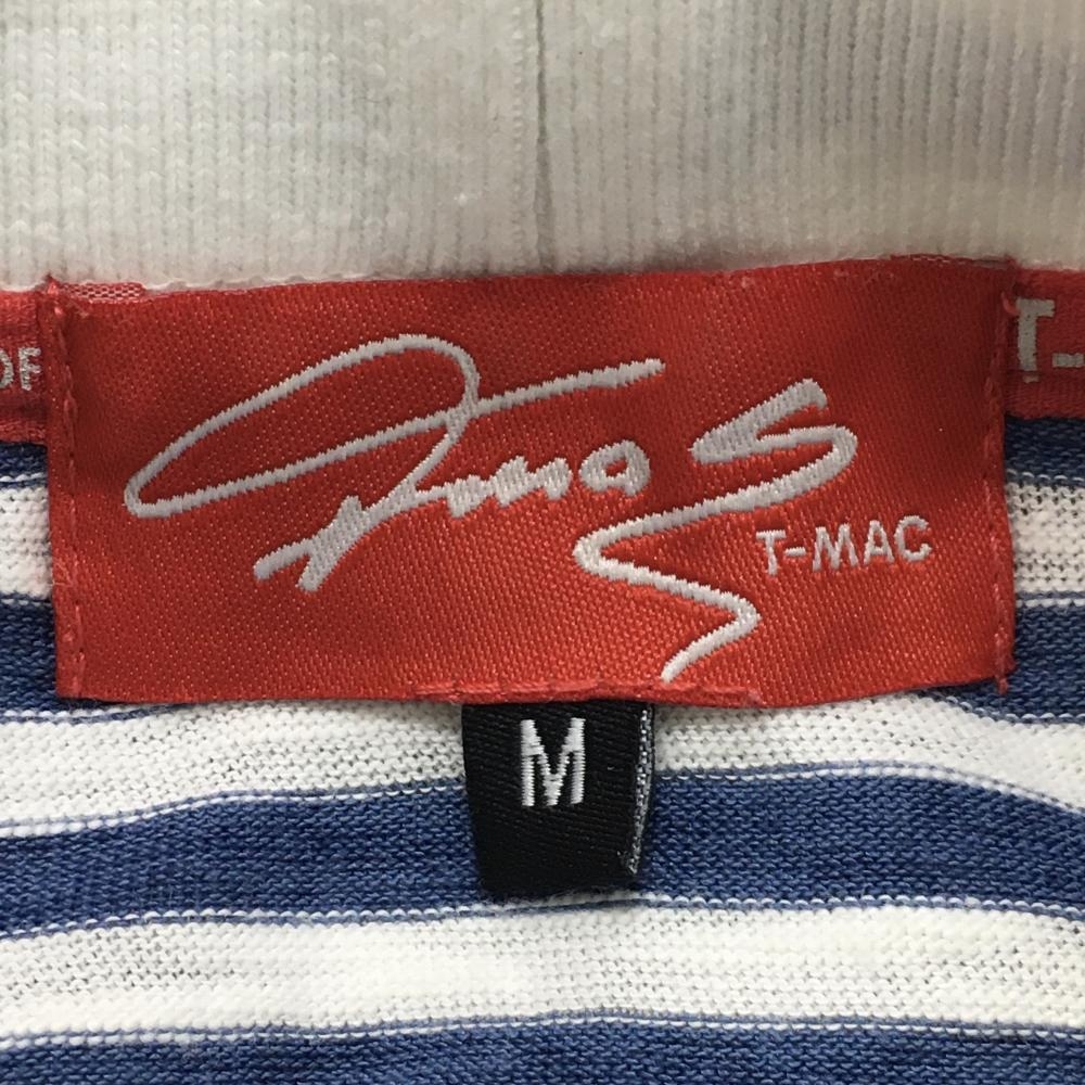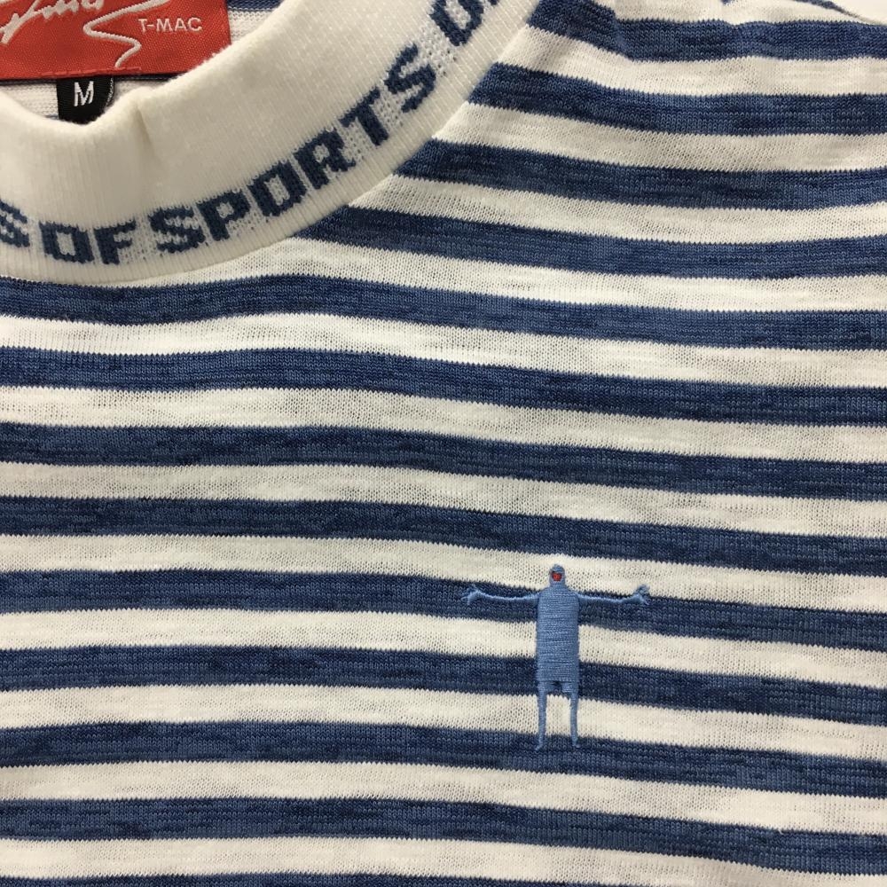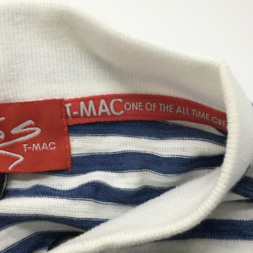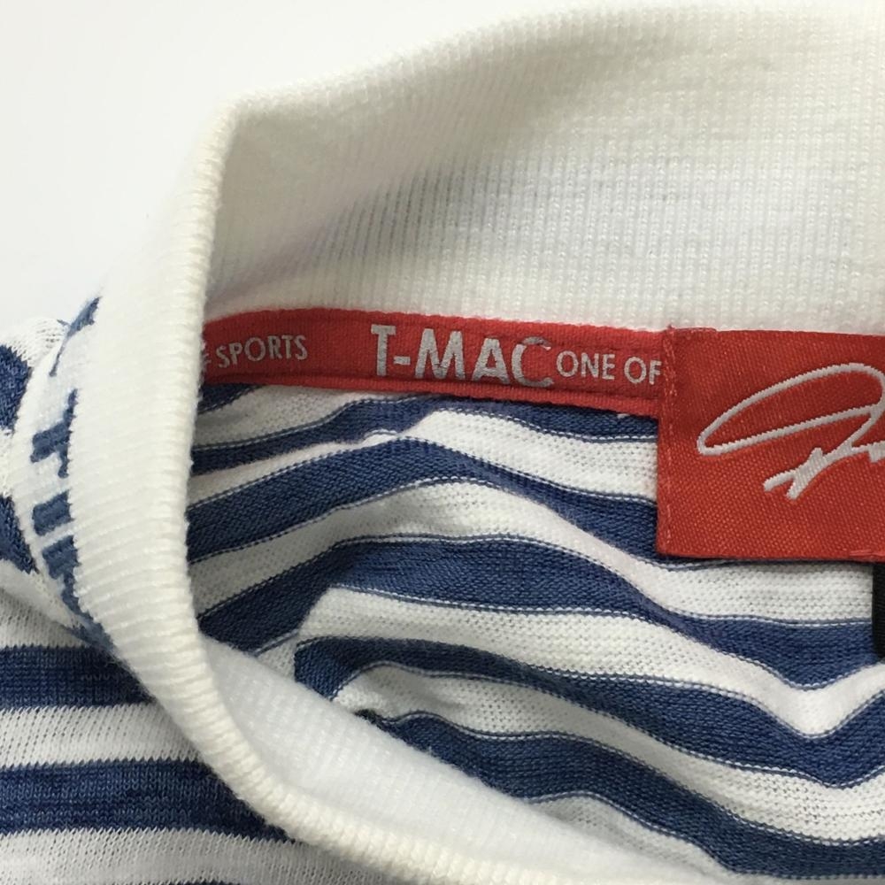 【美品】ティーマック 半袖ハイネックシャツ 白×ブルー ボーダー ネックロゴ レディース M ゴルフウェア T-MAC
