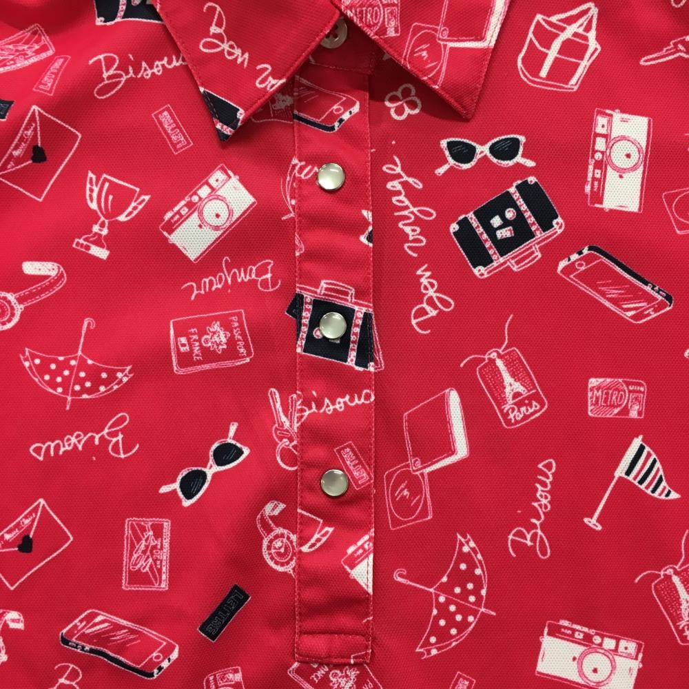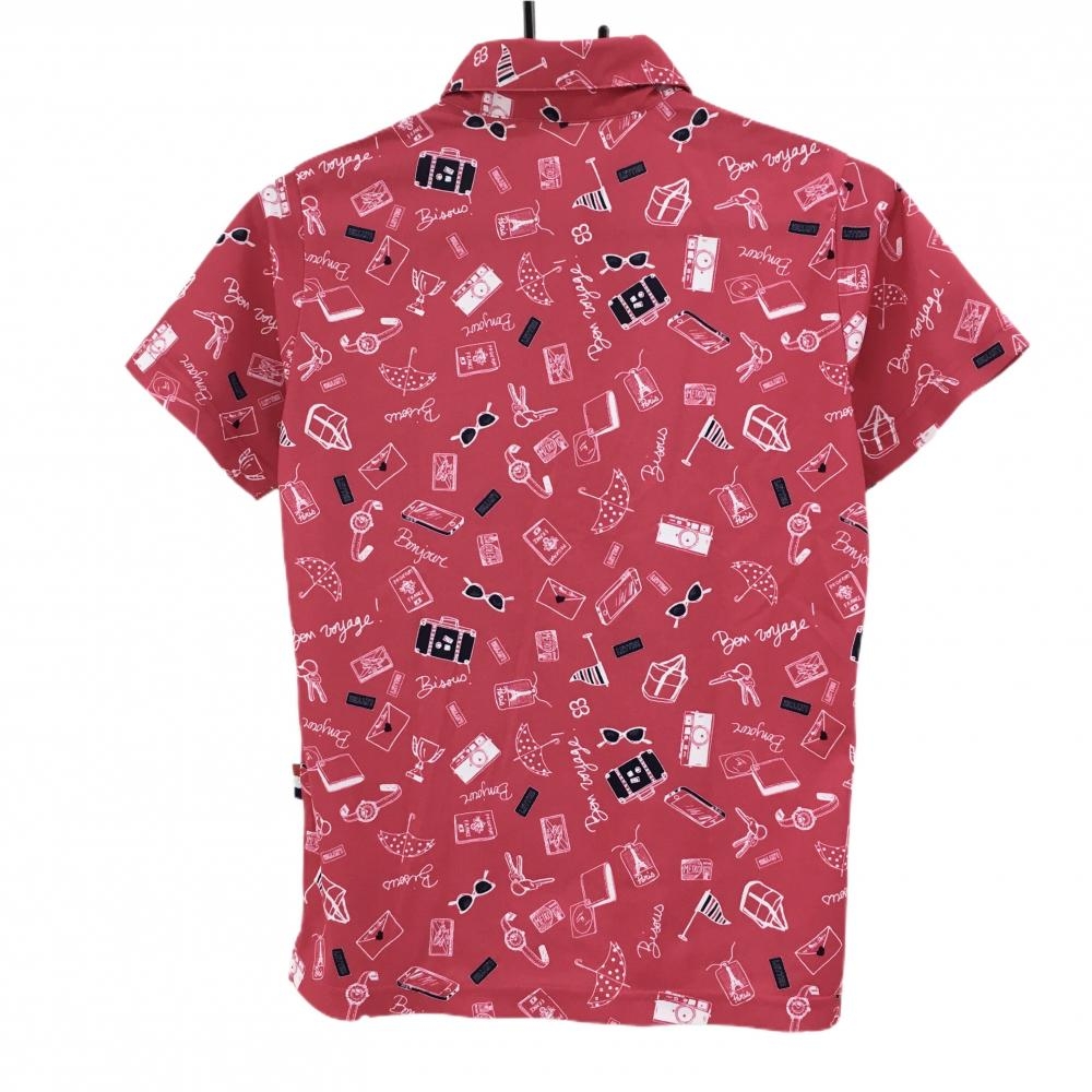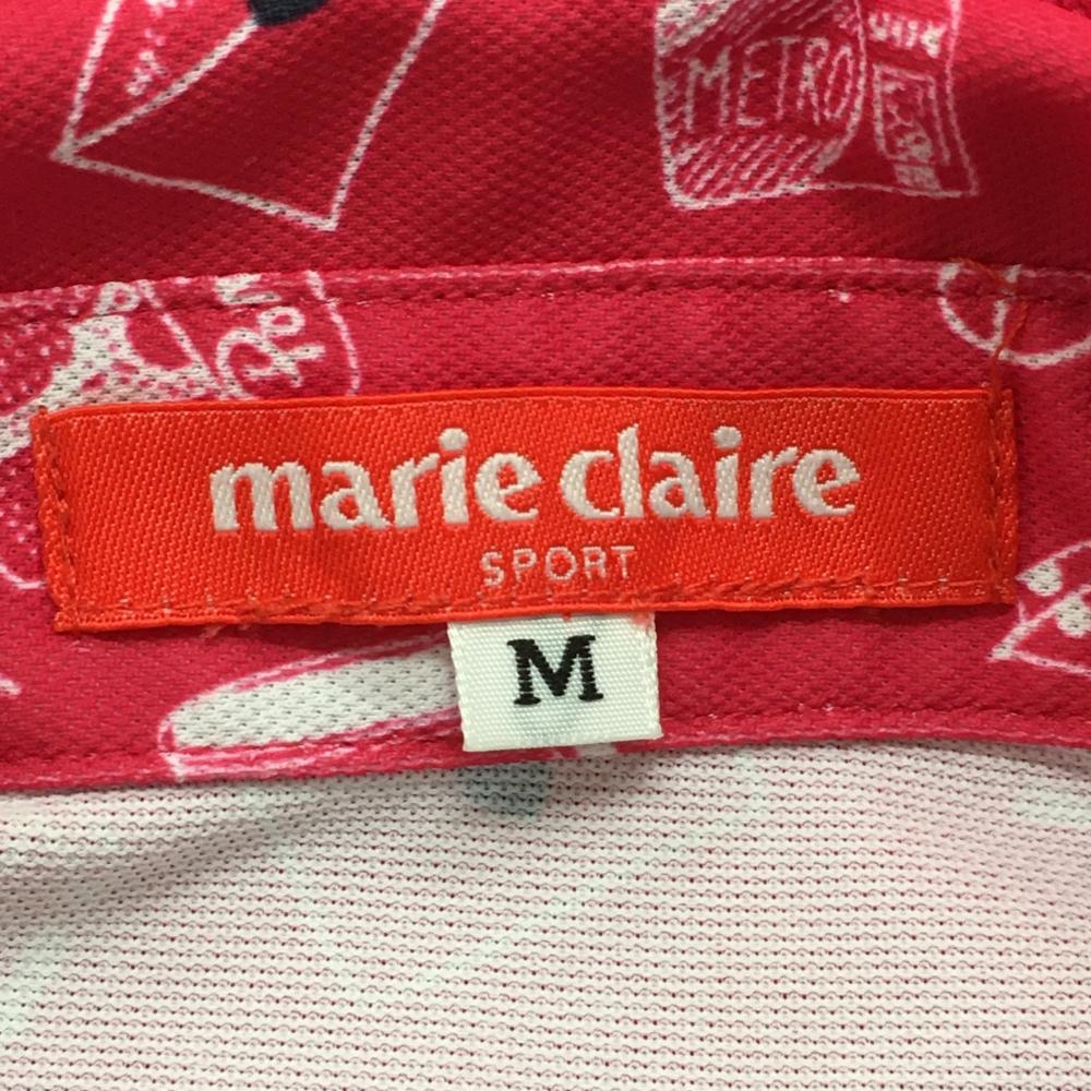 【超美品】マリクレールスポール 半袖ポロシャツ レッドピンク×白 総柄 スナップボタン レディース M ゴルフウェア marie claire