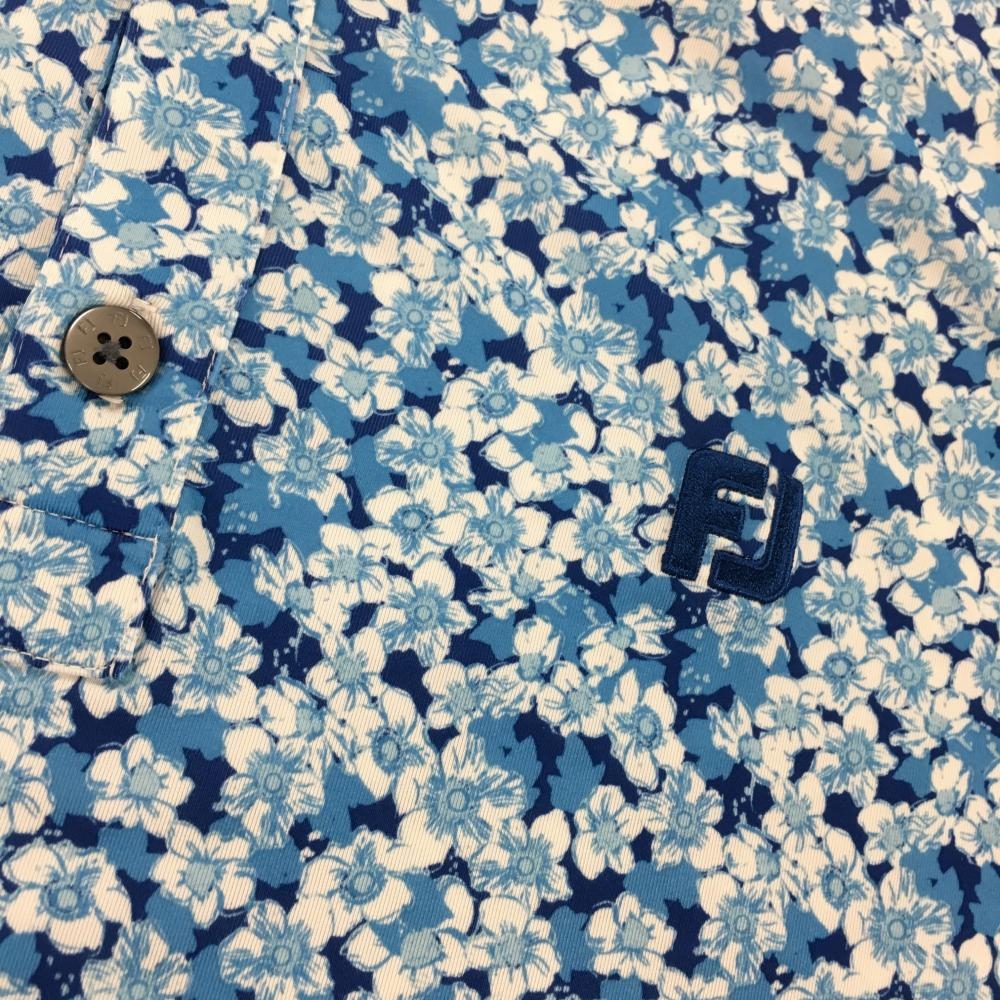 【美品】フットジョイ 半袖ポロシャツ ライトブルー×ネイビー 花柄 ボタンダウン メンズ M ゴルフウェア 2024年モデル FootJoy