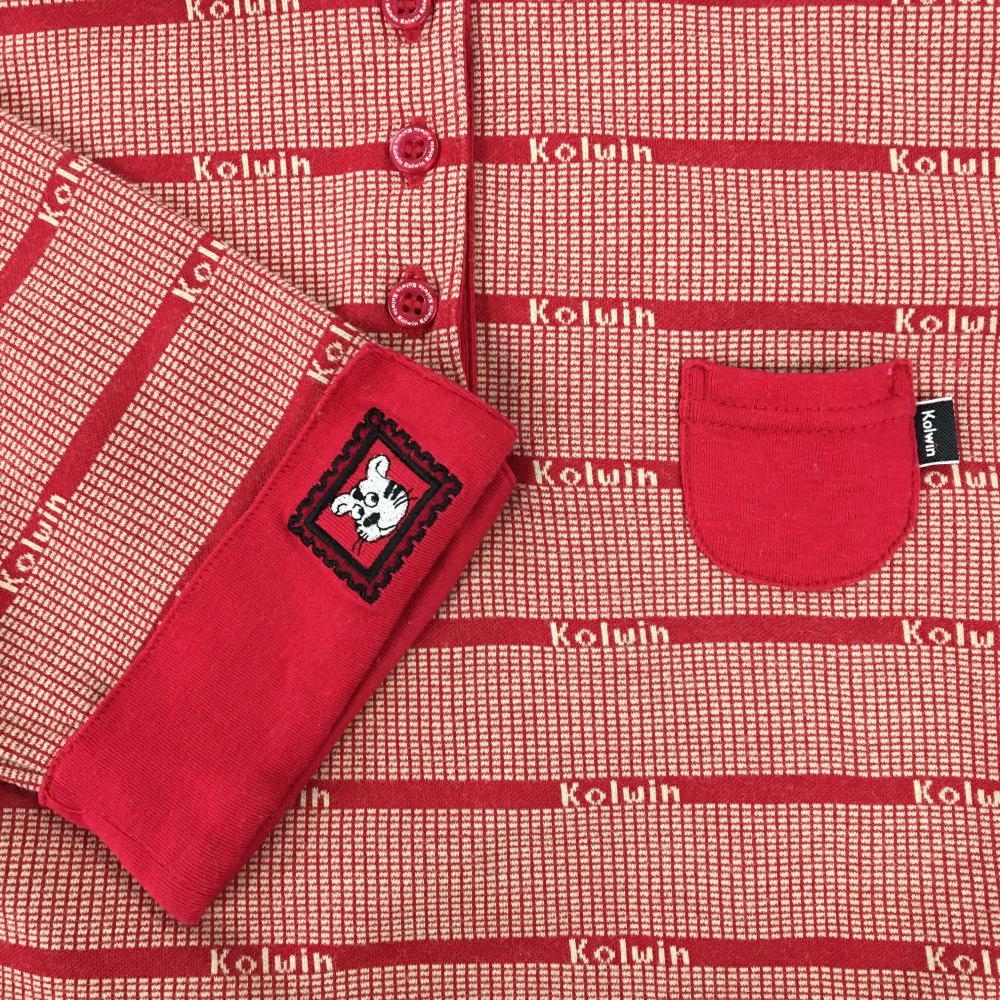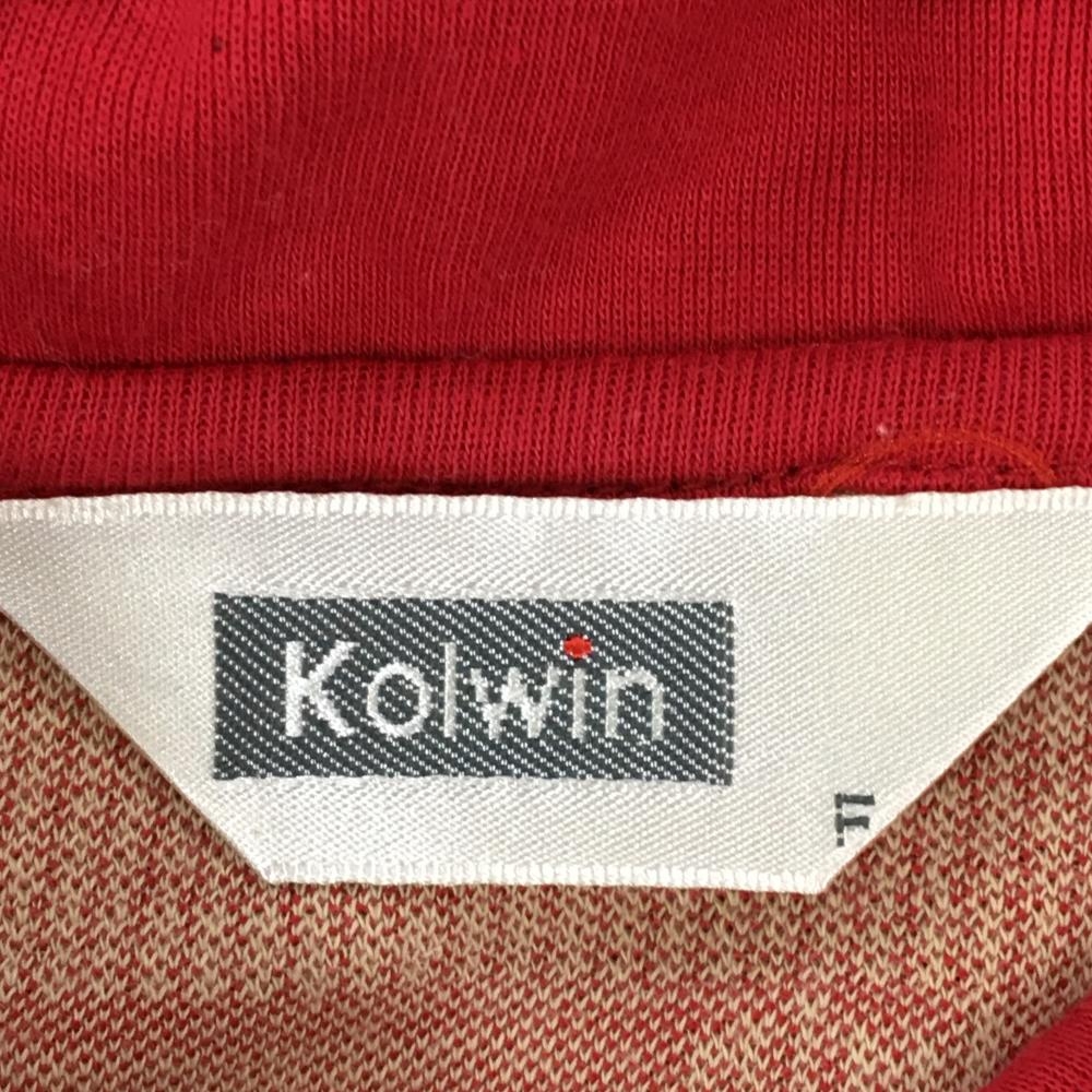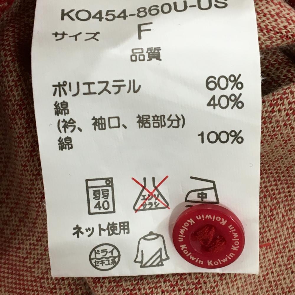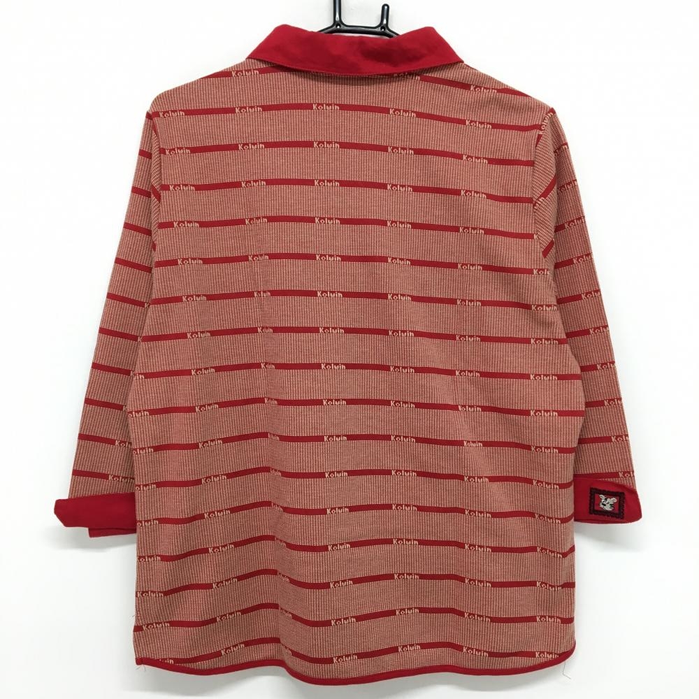 【超美品】コルウィン 七分袖ポロシャツ レッド×ライトベージュ 総柄 ボーダー調 レディース F ゴルフウェア Kolwin
