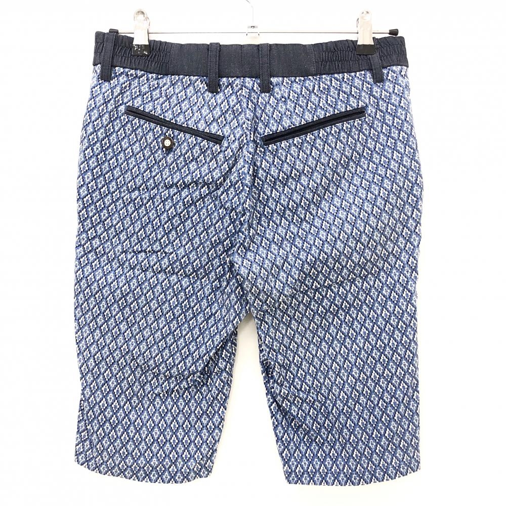 【超美品】マークアンドロナ ハーフパンツ ライトブルー×白 ダイヤ柄総柄 ウエスト一部ゴム メンズ S ゴルフウェア MARK&LONA