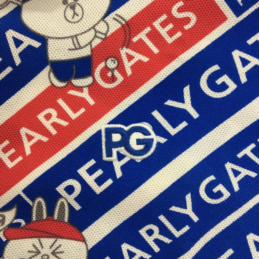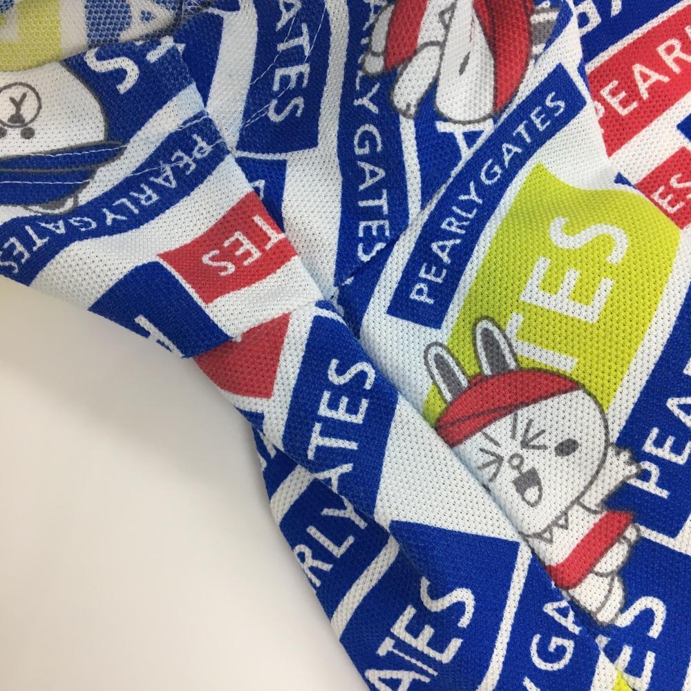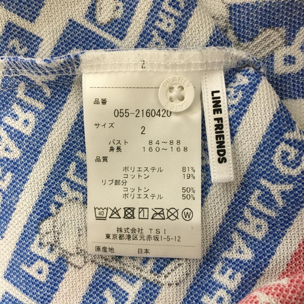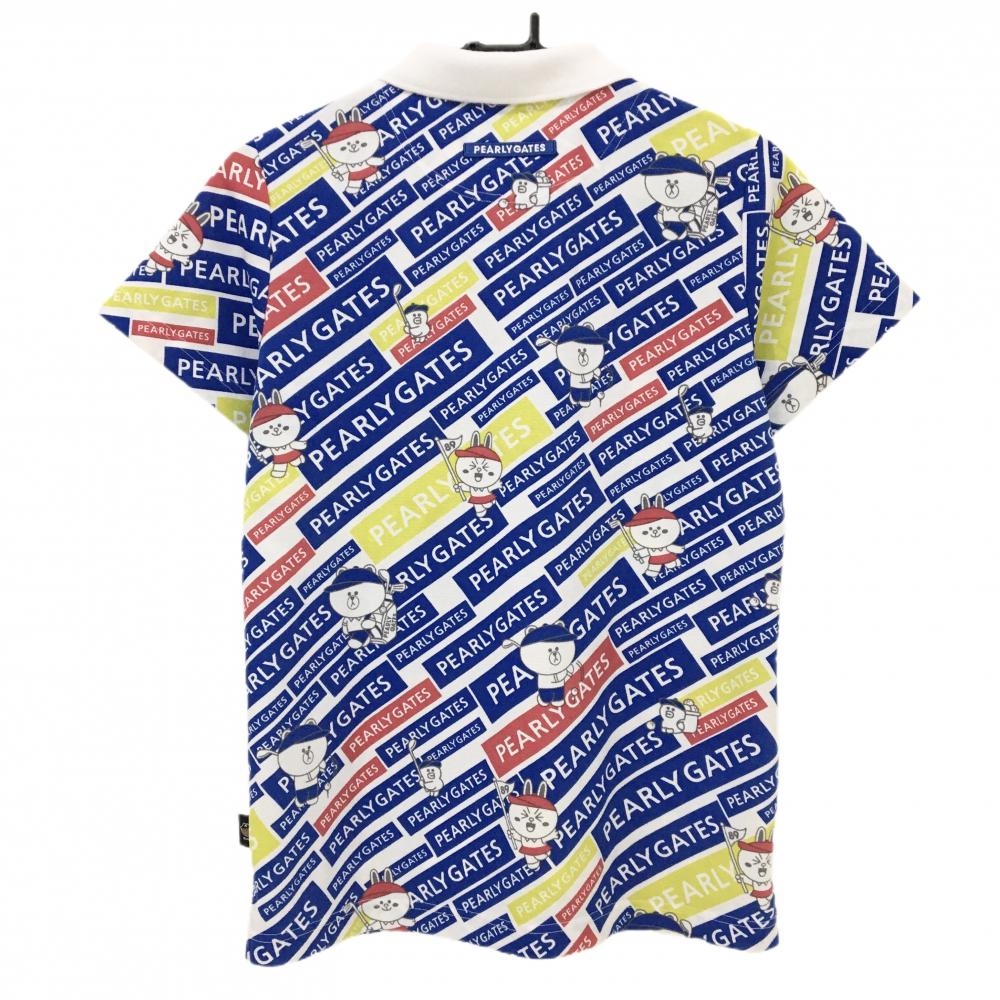パーリーゲイツ×LINE FRIENDS 半袖ポロシャツ 白×ブルー 総柄 ロゴ レディース 2(L) ゴルフウェア PEARLY GATES