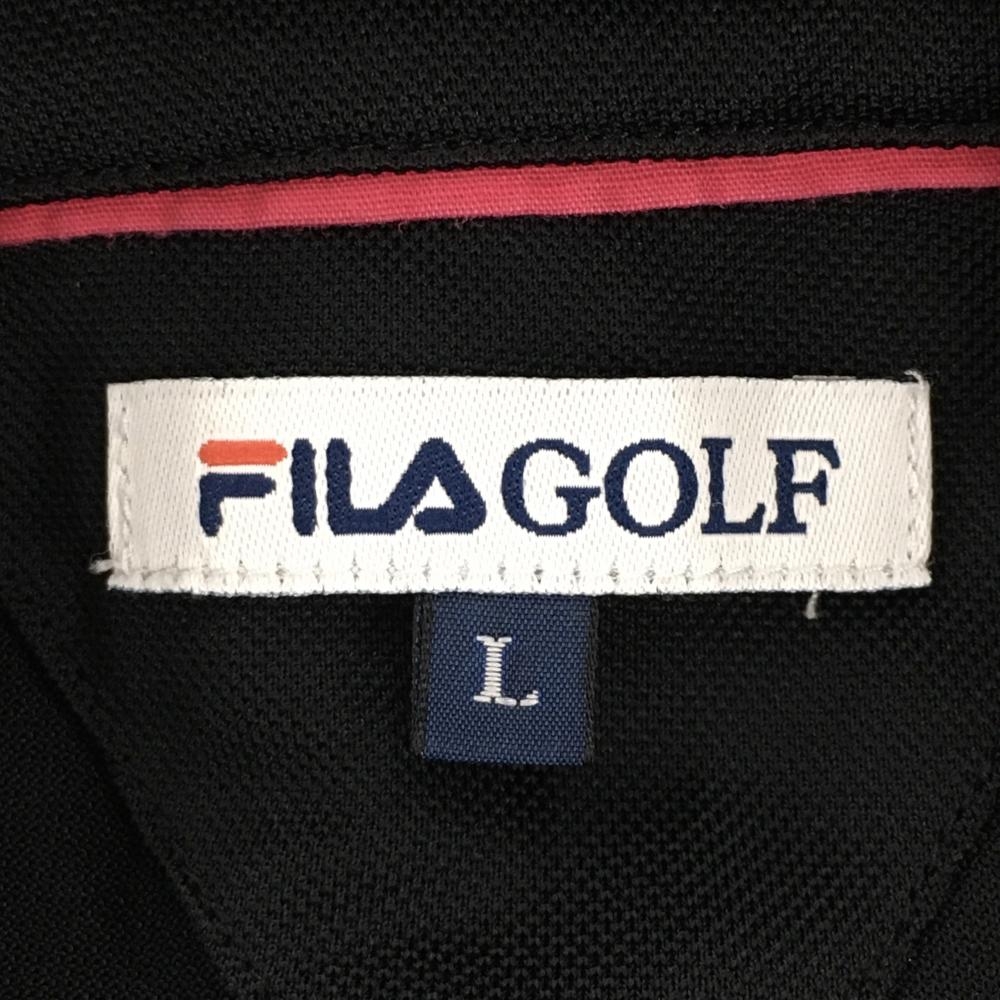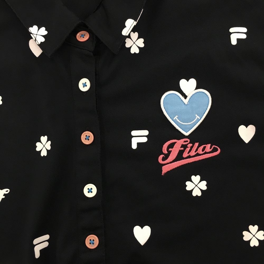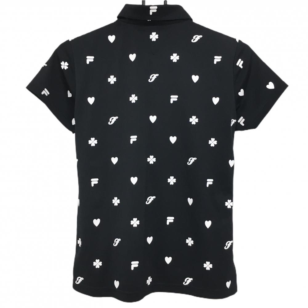 【超美品】フィラゴルフ 半袖ポロシャツ 黒×白 総柄 ワッペン レディース L ゴルフウェア FILA GOLF