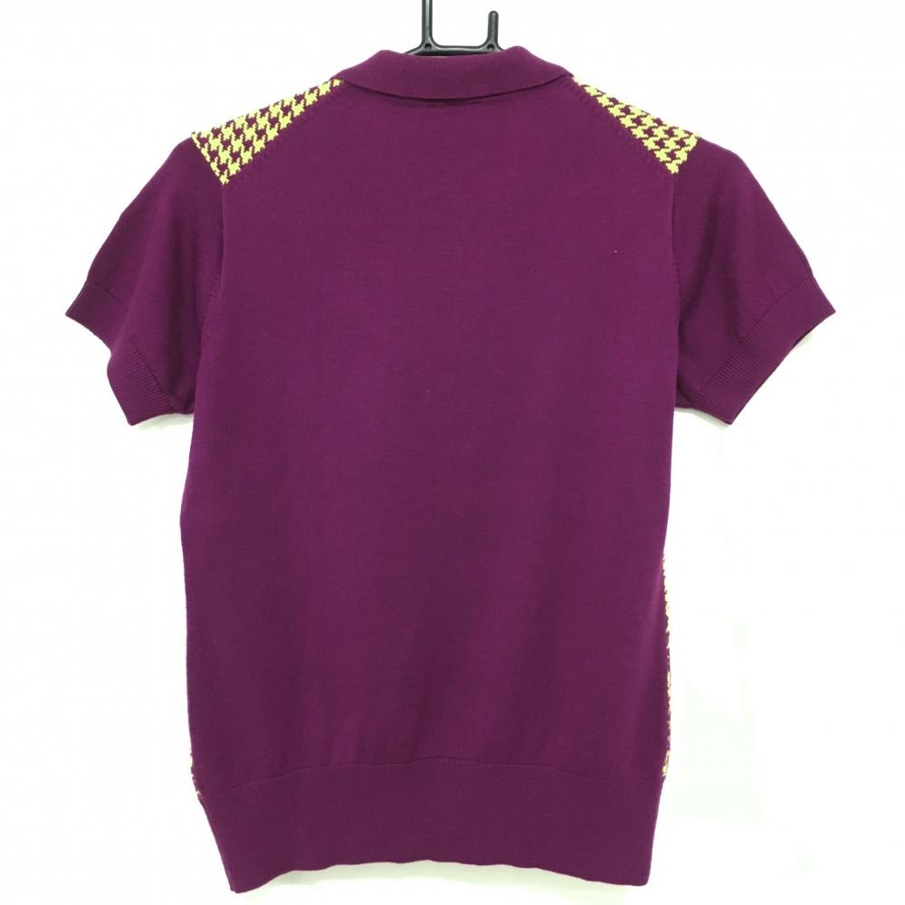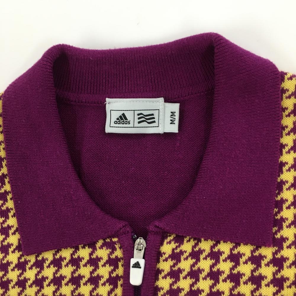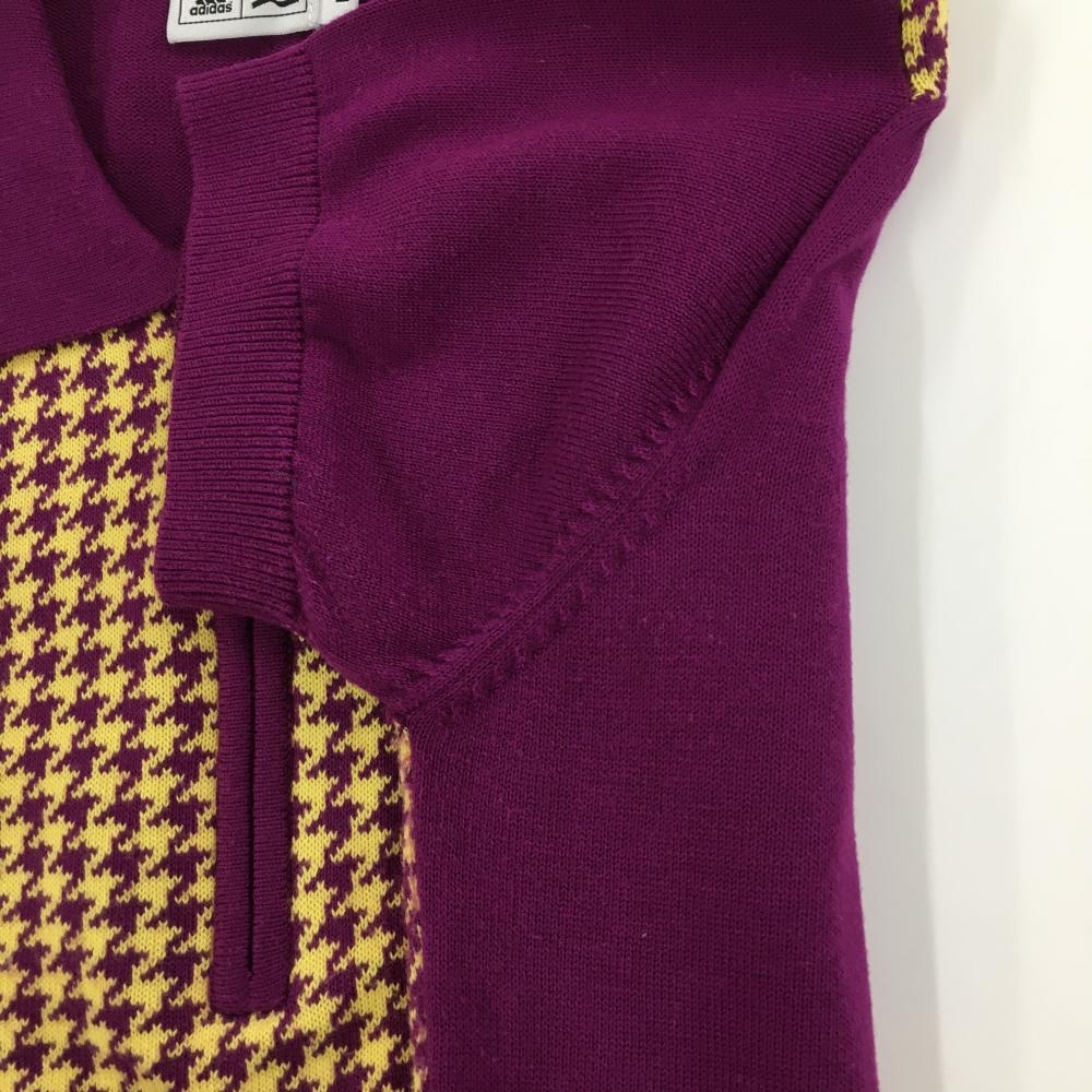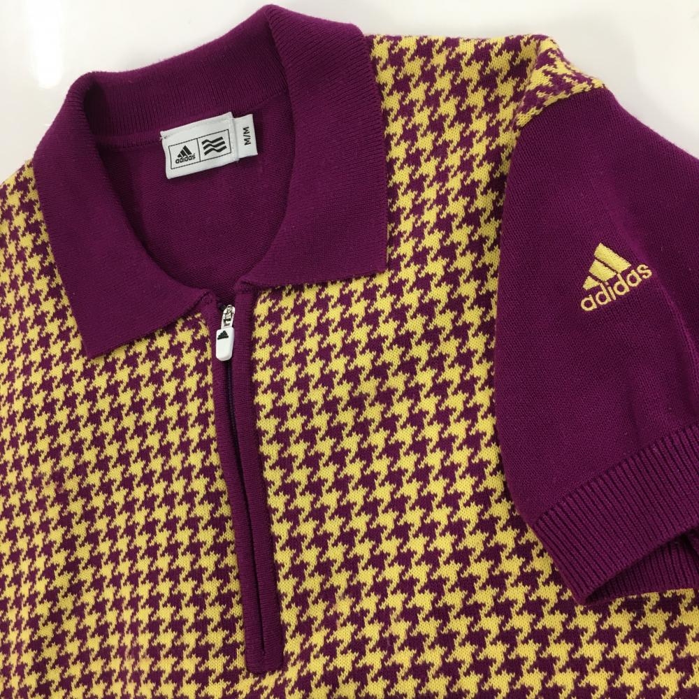 【美品】アディダス 半袖ニットポロシャツ パープル×イエロー 千鳥格子 袖ロゴ ハーフジップ レディース M ゴルフウェア adidas
