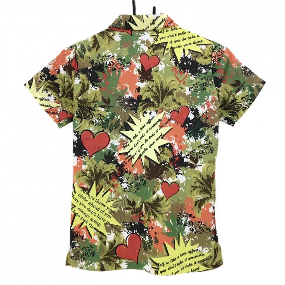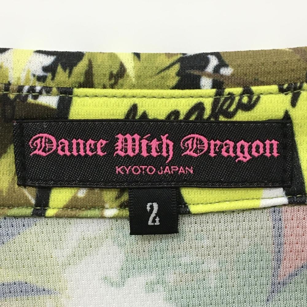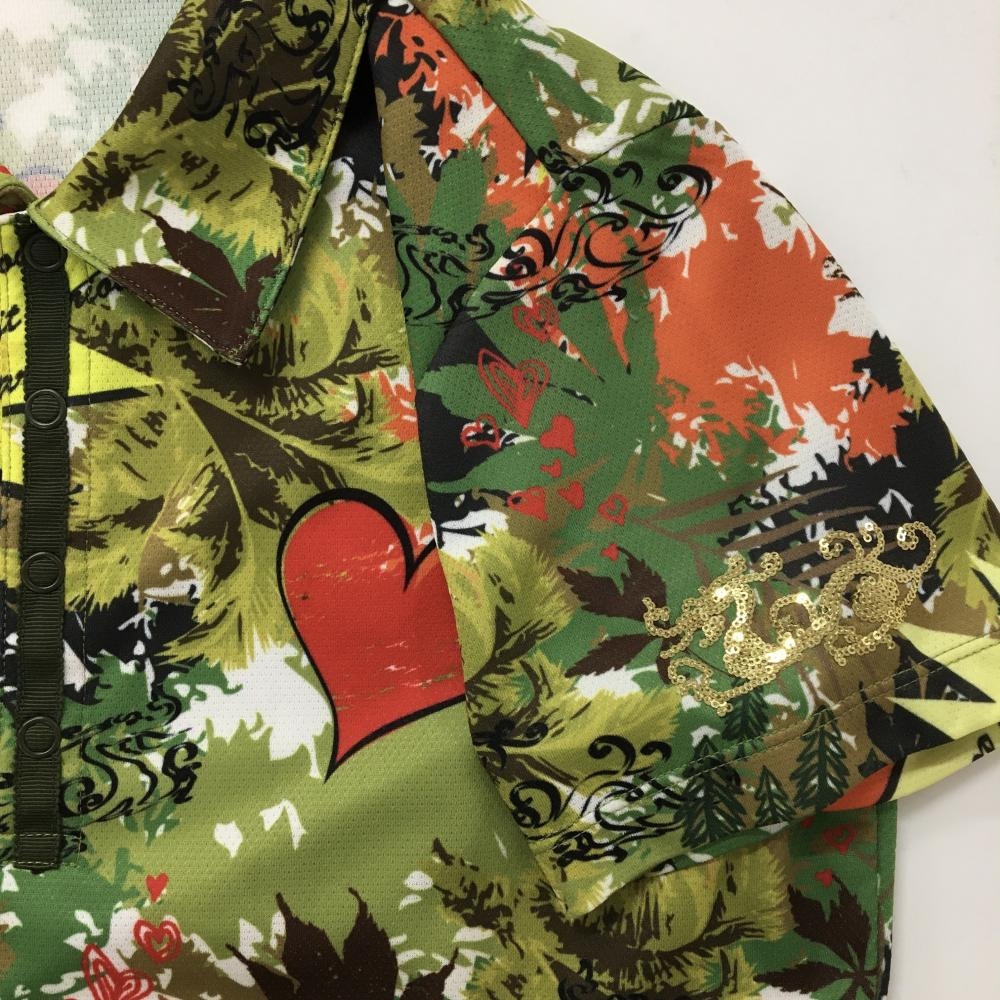 【超美品】ダンスウィズドラゴン 半袖ポロシャツ グリーン系×レッド 総柄 ハート リーフ レディース 2(M) ゴルフウェア Dance With Dragon