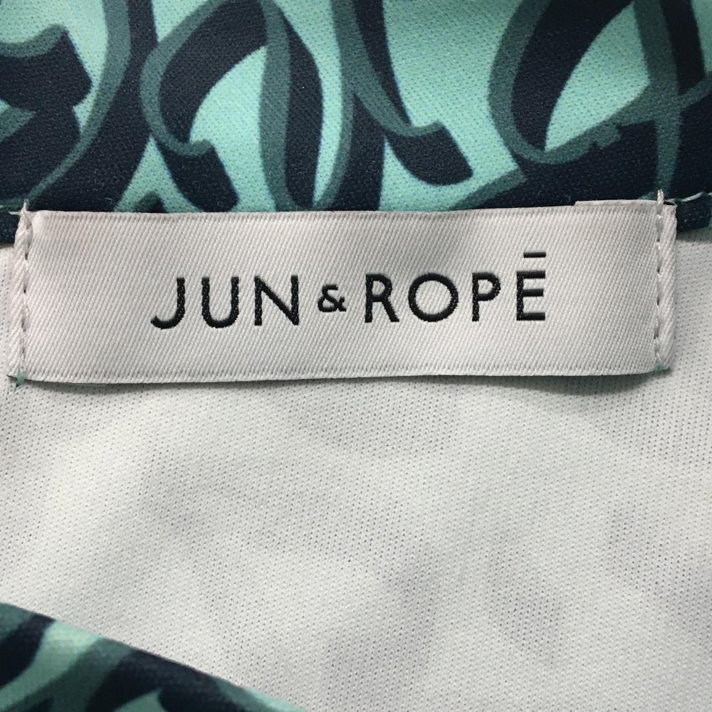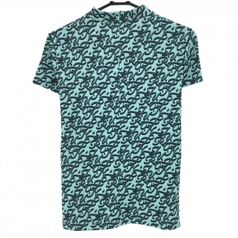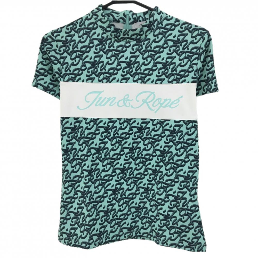 ジュンアンドロペ 半袖ハイネックシャツ ライトブルー×ネイビー ロゴ総柄 胸元切替 レディース M ゴルフウェア JUN&ROPE