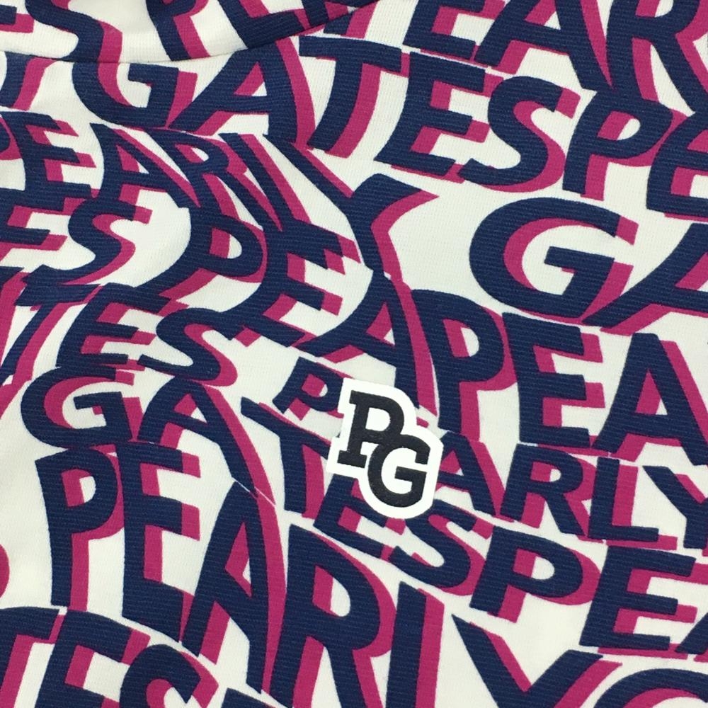 【美品】パーリーゲイツ ノースリーブハイネックシャツ 白×ネイビー×ピンク系 ロゴ英字総柄 レディース 2(L) ゴルフウェア PEARLY GATES