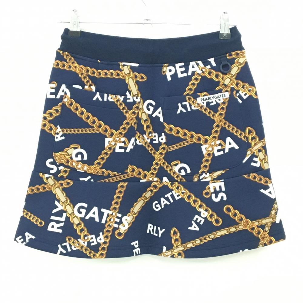 【新品】パーリーゲイツ スカート ネイビー×ゴールド チェーン柄 ウエストゴム 調節紐 レディース 0(S) ゴルフウェア PEARLY GATES