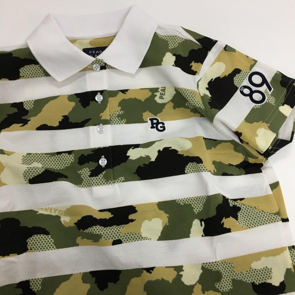 【新品】パーリーゲイツ 半袖ポロシャツ 白×カーキ系 ボーダー 迷彩 カモフラ ロゴ刺しゅう レディース 0(S) ゴルフウェア PEARLY GATES