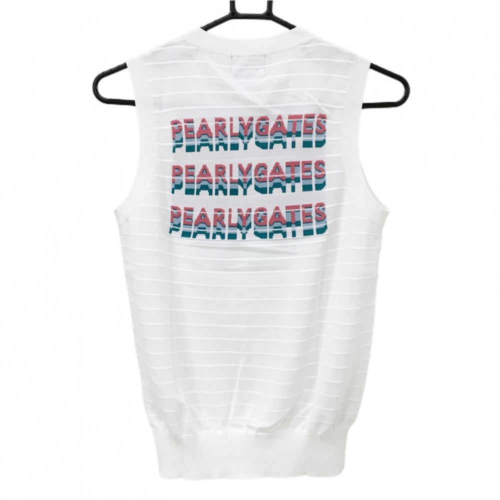 【新品】パーリーゲイツ ニットベスト 白 ボーダー織生地 バックロゴ Vネック 薄手 レディース 0(S) ゴルフウェア PEARLY GATES