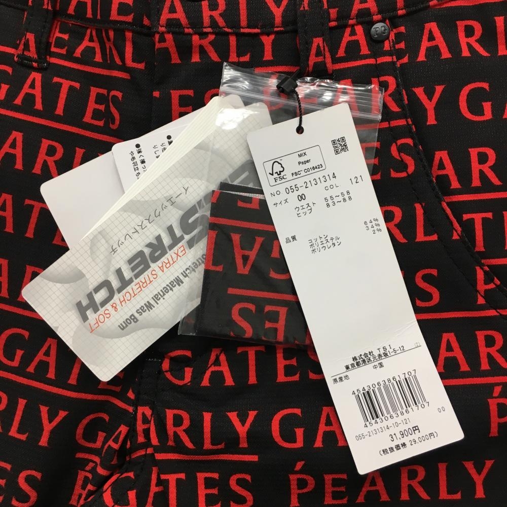 【新品】パーリーゲイツ パンツ 黒×レッド ロゴ総柄 刺しゅう白 レディース 00(XS) ゴルフウェア PEARLY GATES