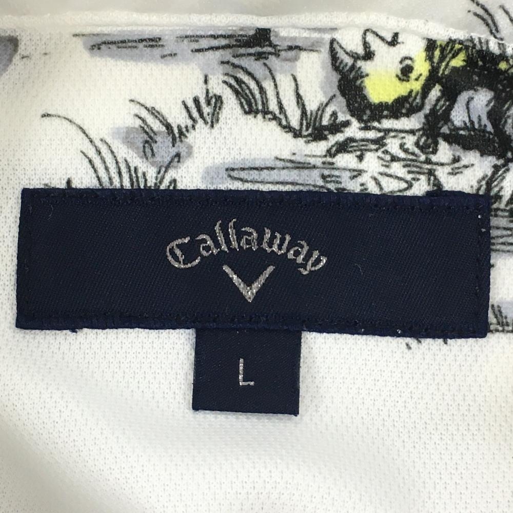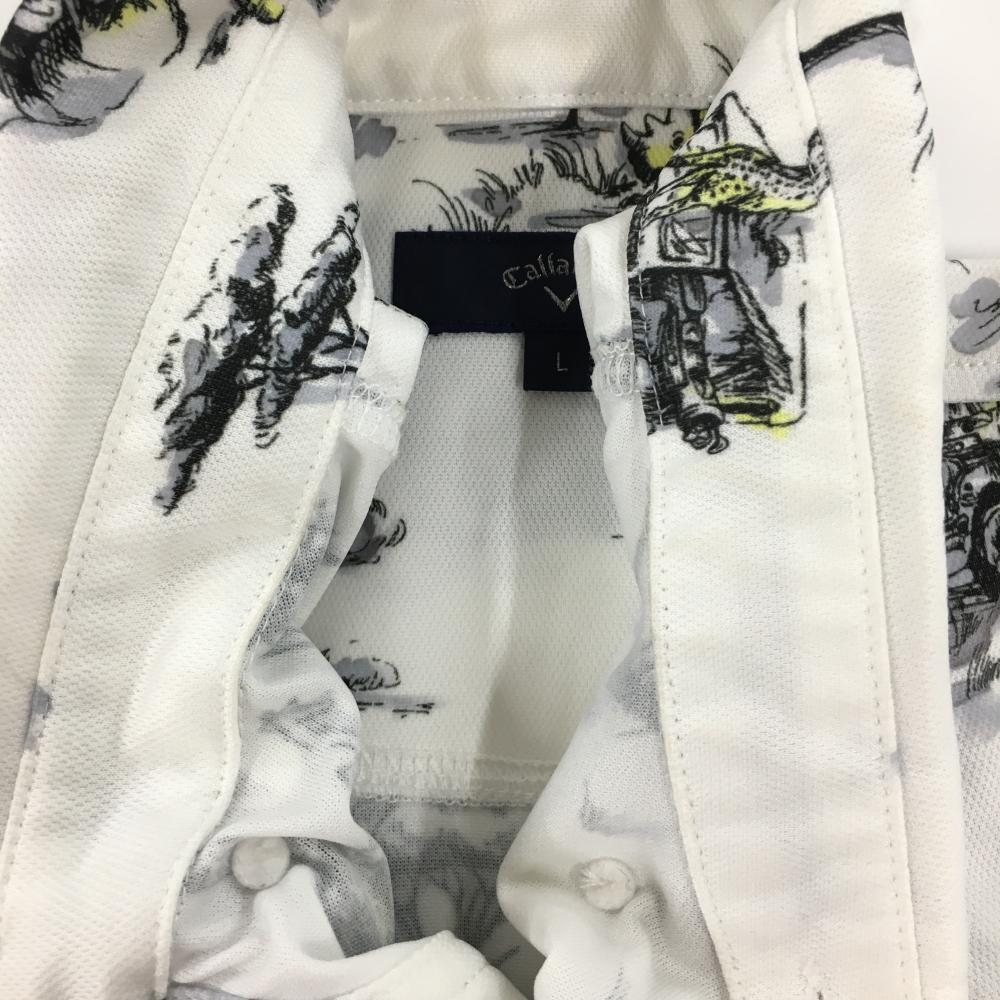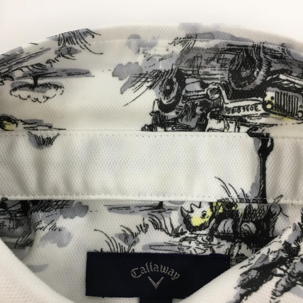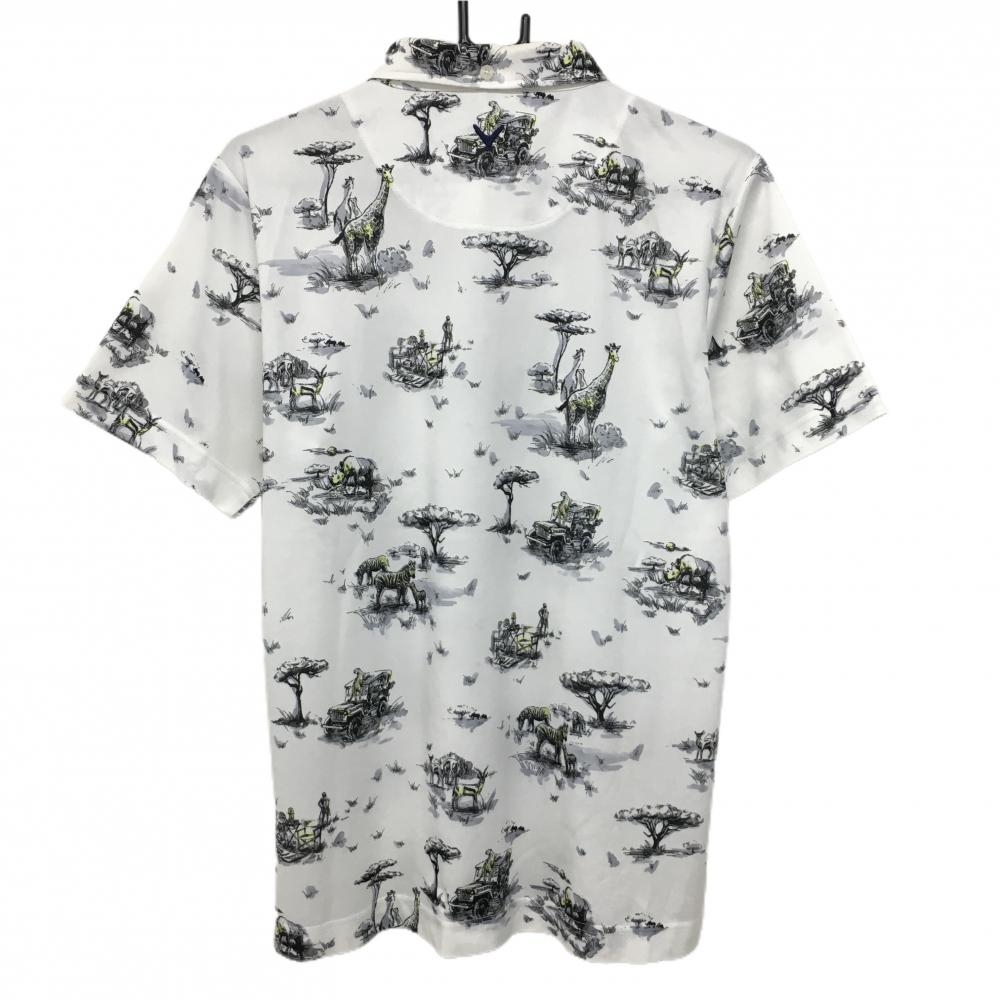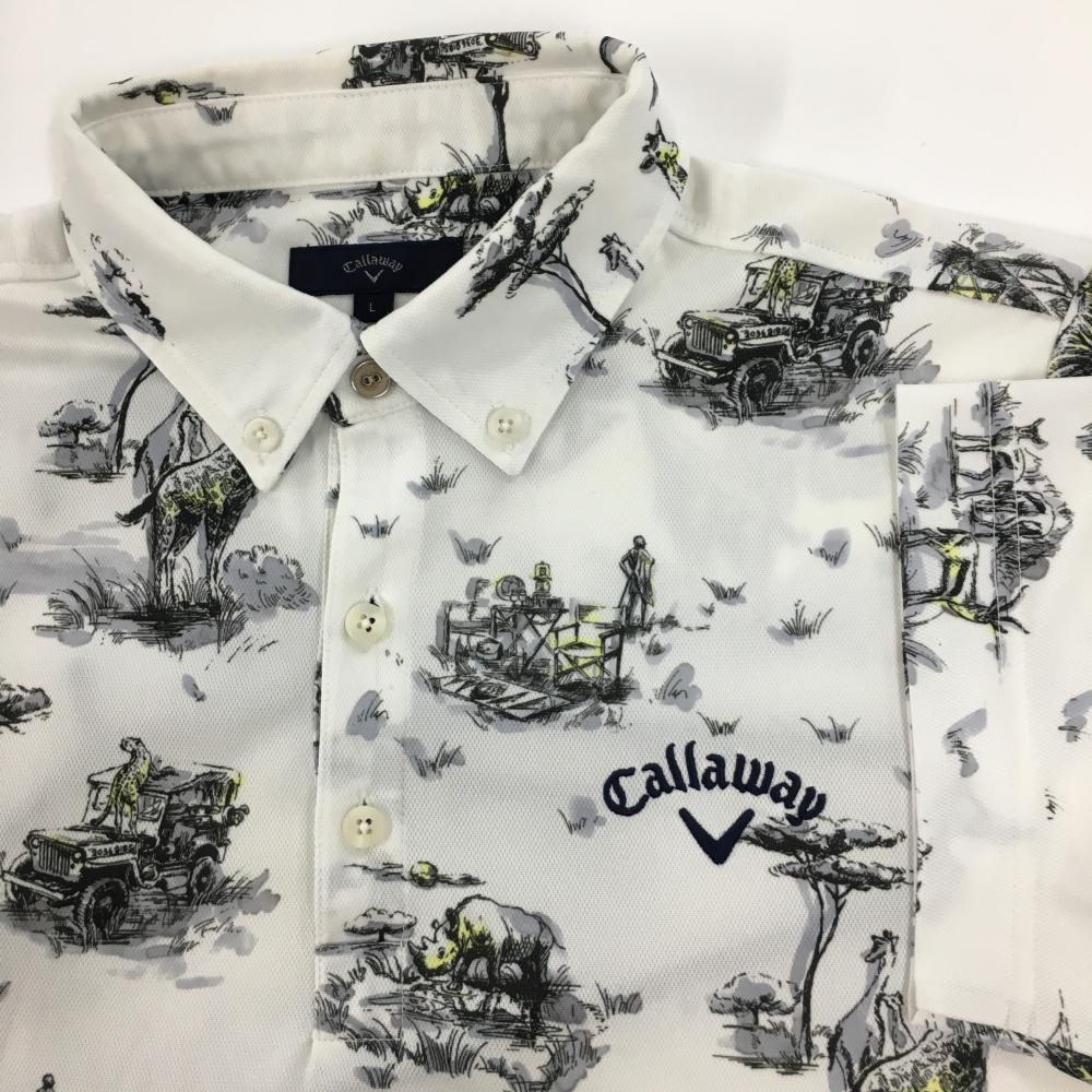 【美品】キャロウェイ 半袖ポロシャツ 白×黒 サバンナアニマル総柄 ロゴ刺しゅう メンズ L ゴルフウェア Callaway