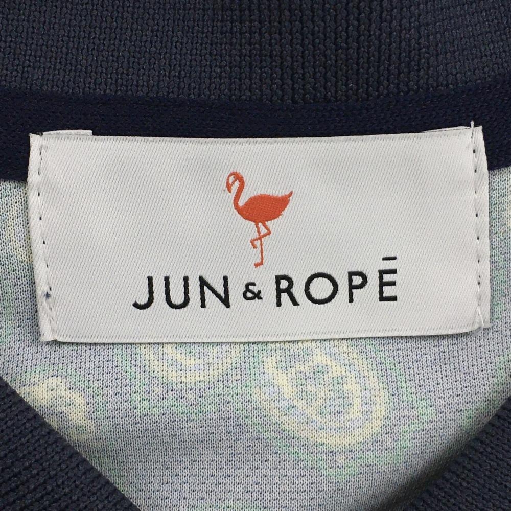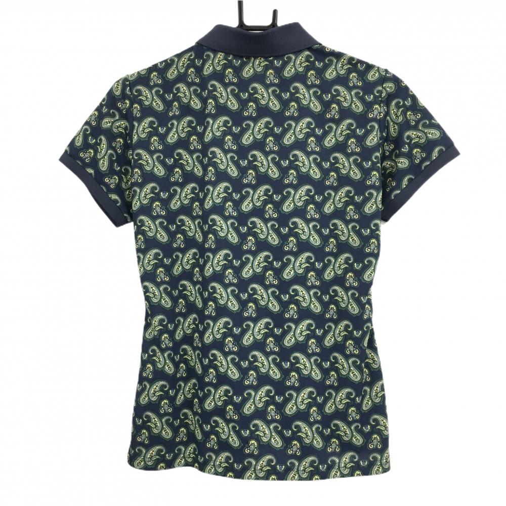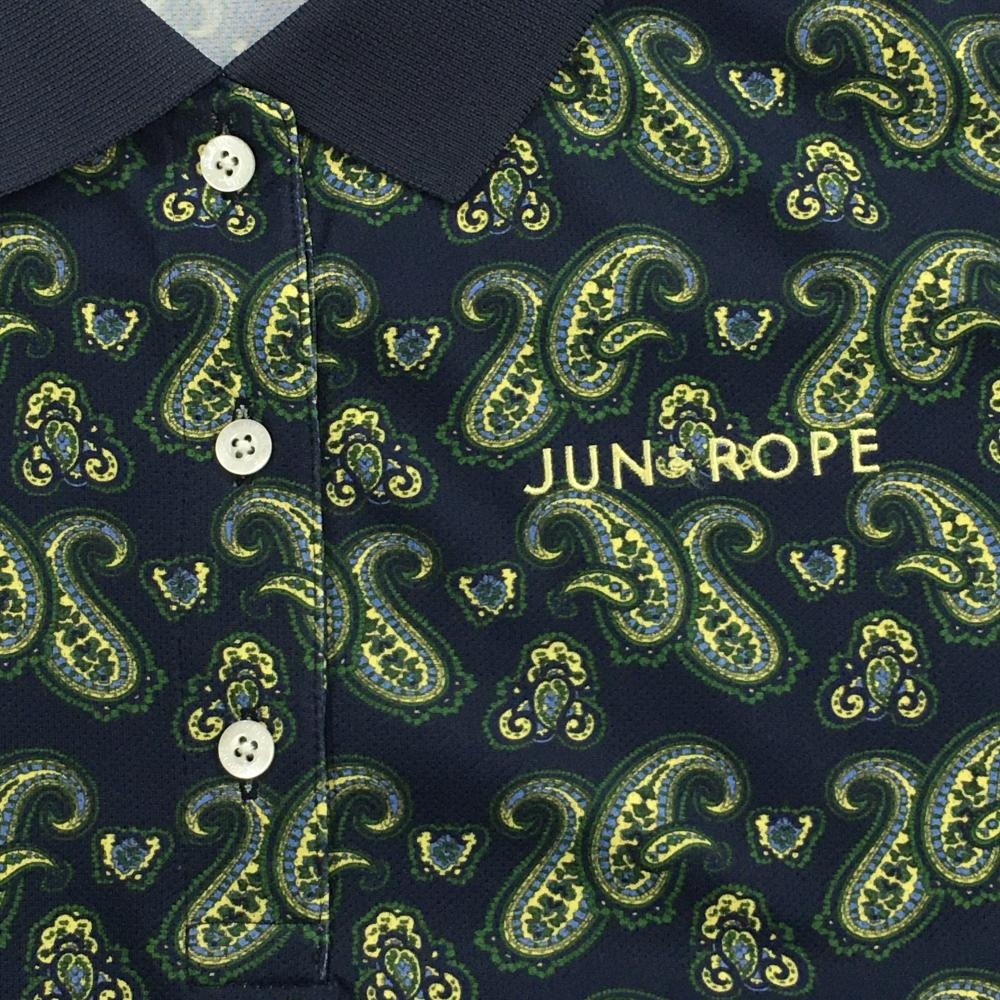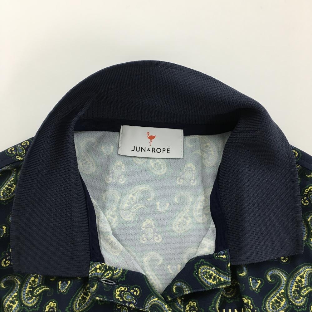 【美品】ジュンアンドロペ 半袖ポロシャツ ネイビー×イエロー×グリーン 総柄 ペイズリー調 レディース M ゴルフウェア JUN&ROPE