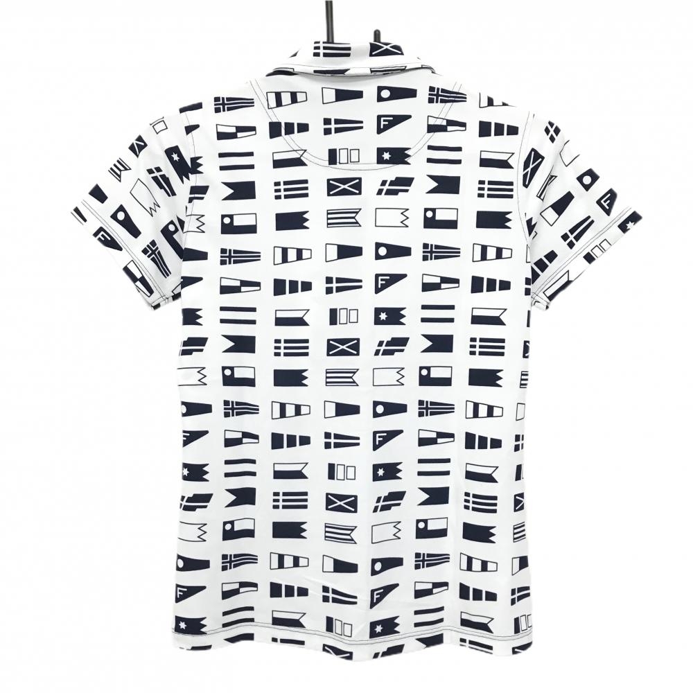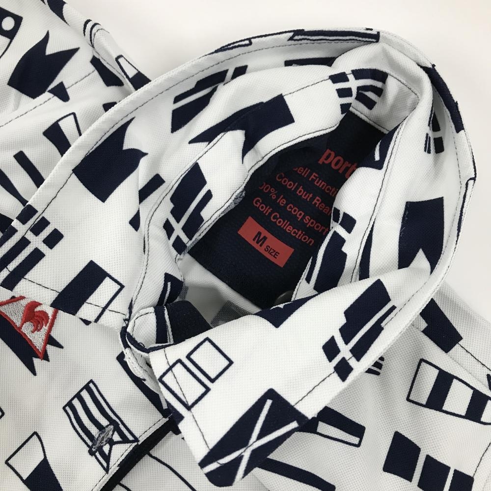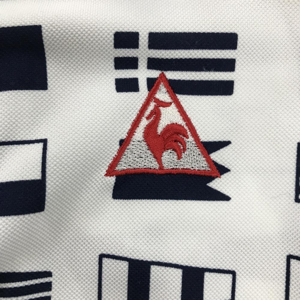 【美品】ルコックゴルフ 半袖ポロシャツ 白×ネイビー 総柄 国旗 胸ロゴ刺しゅう 襟汚れ少 レディース M ゴルフウェア le coq sportif