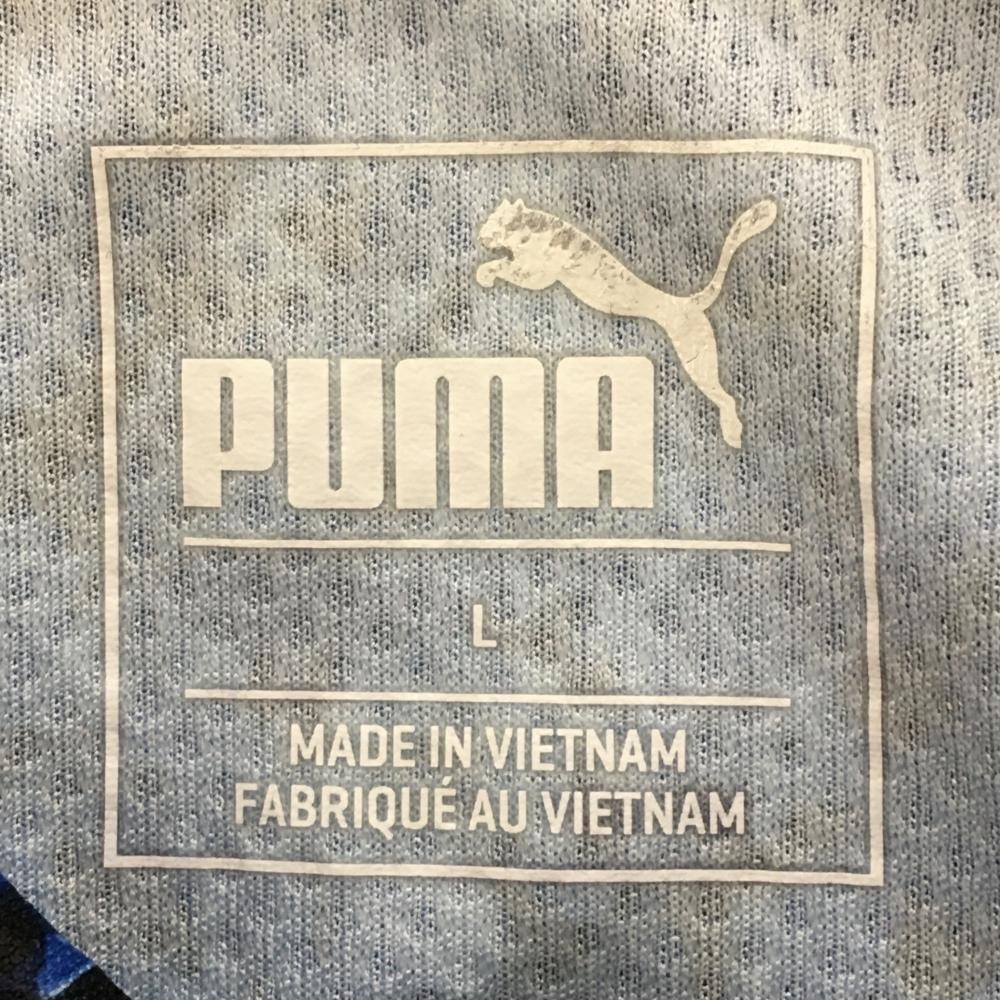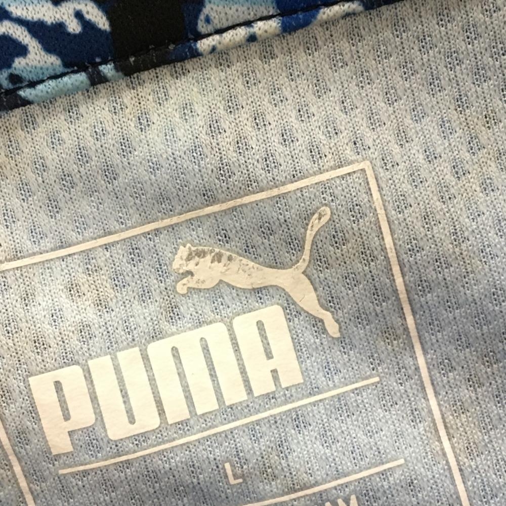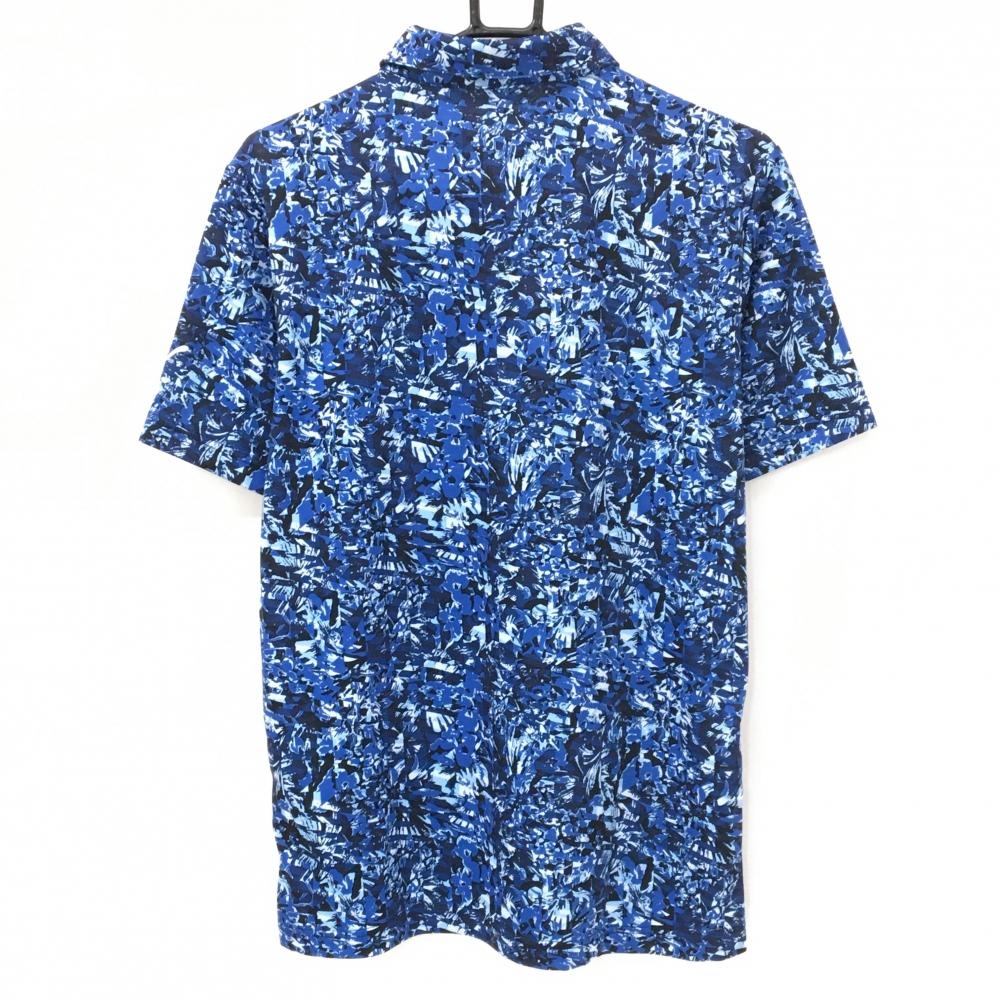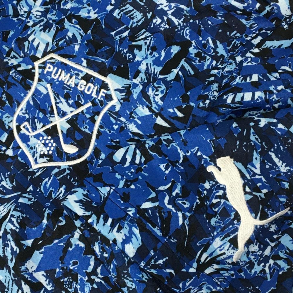 【美品】プーマ 半袖ポロシャツ ネイビー×ブルー 総柄 ロゴ刺しゅう メンズ L ゴルフウェア PUMA