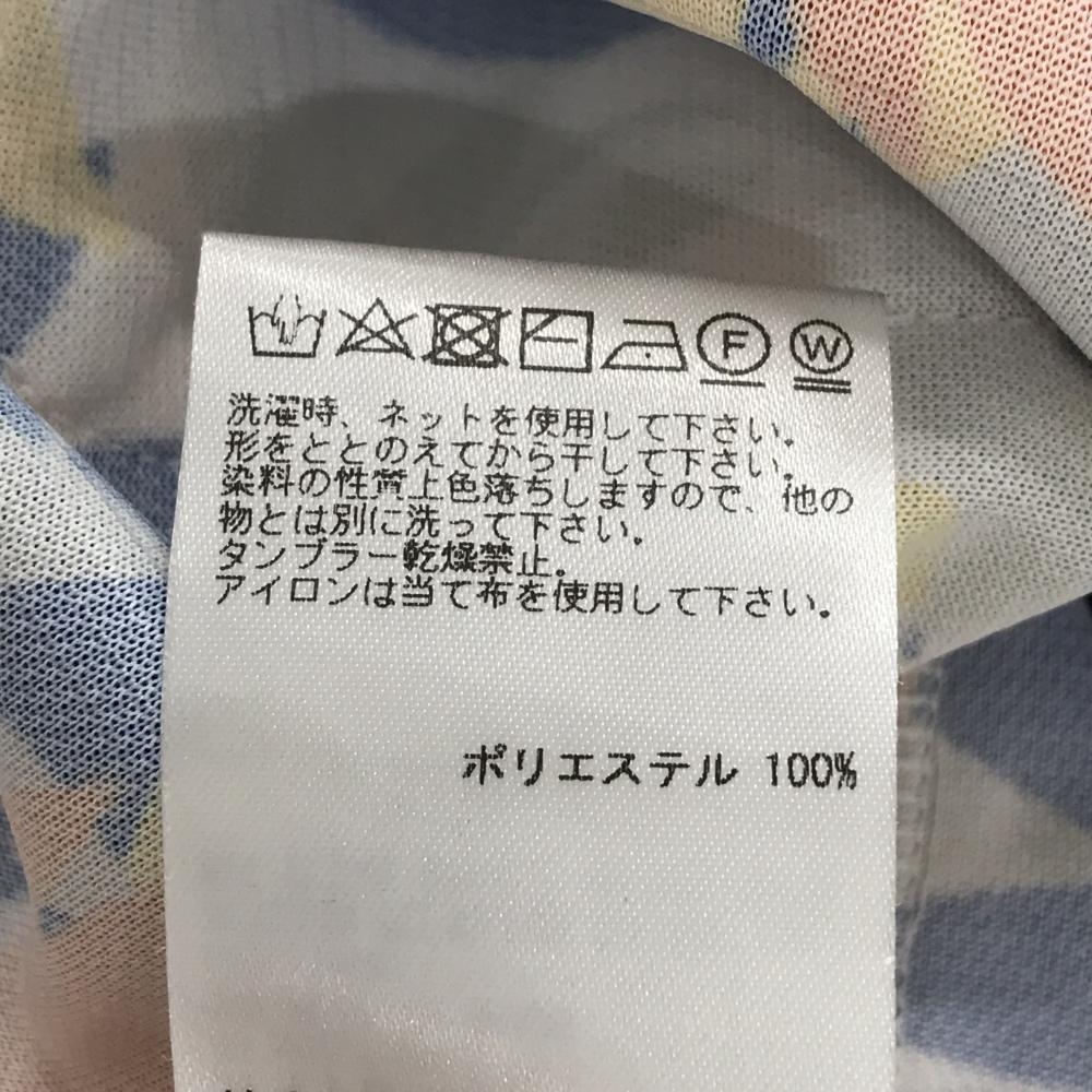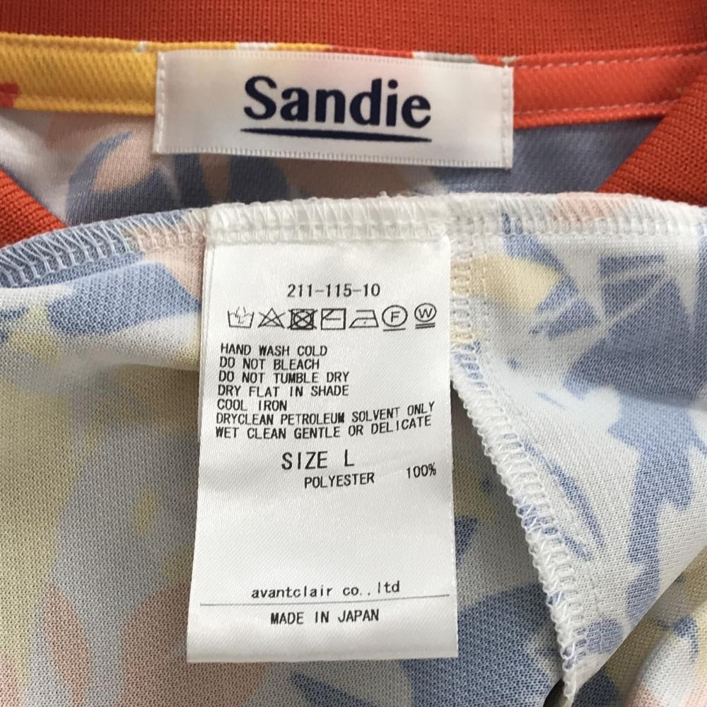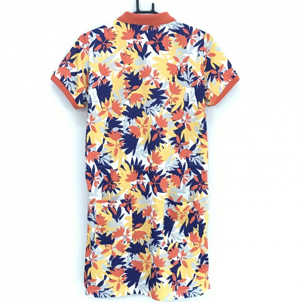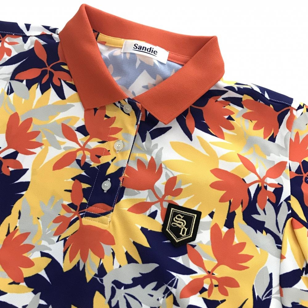 【超美品】サンディ 半袖ポロワンピース オレンジ×イエロー×ネイビー 総柄 リーフ レディース L ゴルフウェア sandie