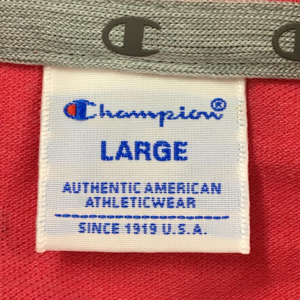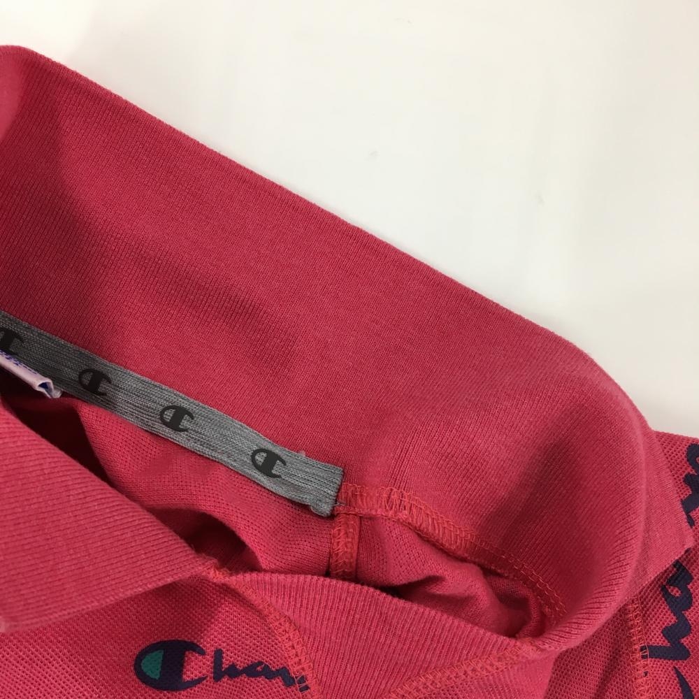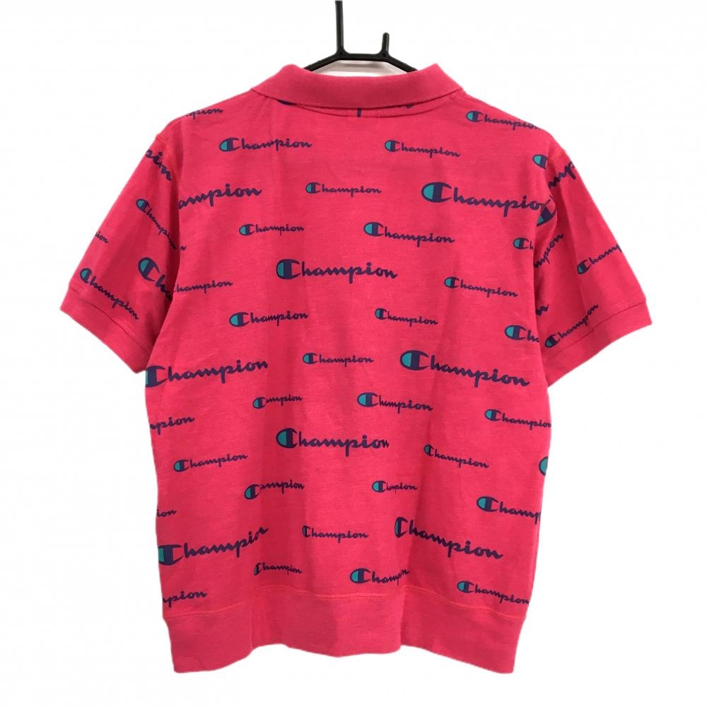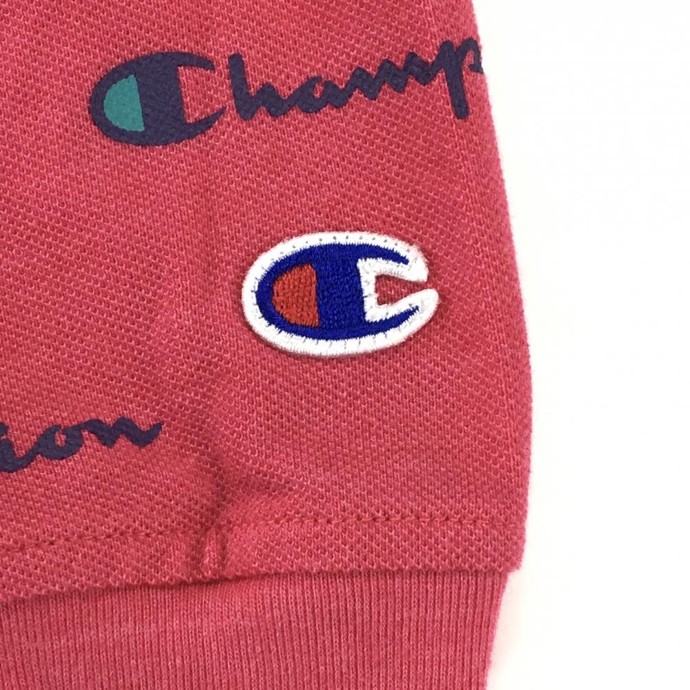 【美品】チャンピオン 半袖スキッパーシャツ ピンク×ネイビー ロゴ総柄 レディース LARGE ゴルフウェア Champion