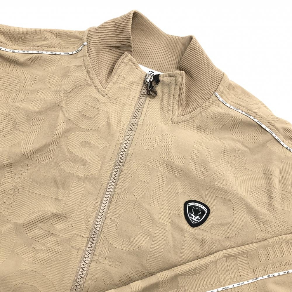 【新品】CPG ジャケットブルゾン ベージュ×白 英字地模様 肩・袖ロゴライン 立体ロゴ レディース 3(L) ゴルフウェア 2024年モデル CPG