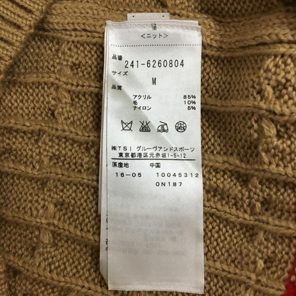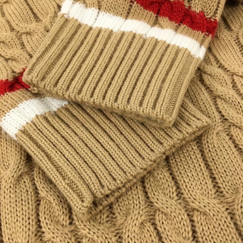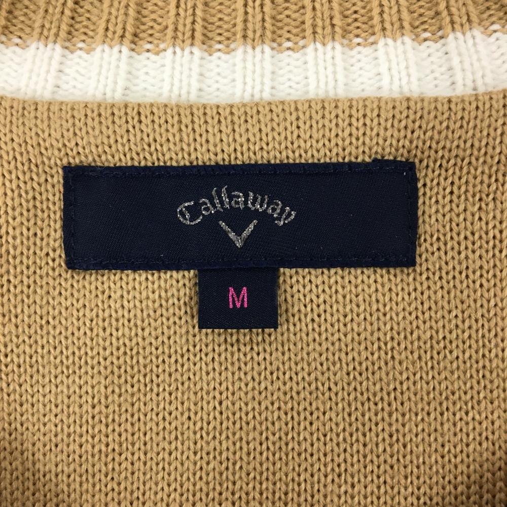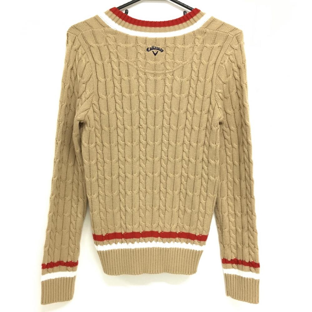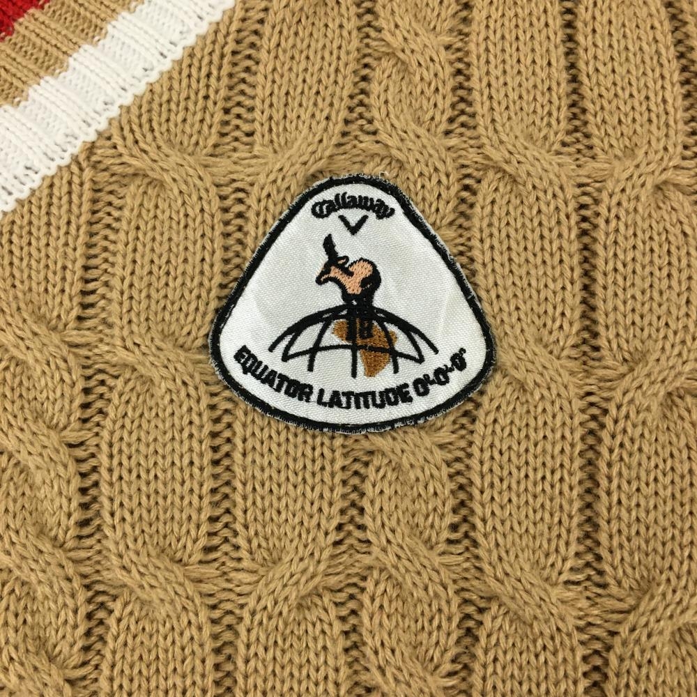 【美品】キャロウェイ セーター ベージュ×レッド ケーブル編み 刺しゅうワッペン Vネック ニット レディース M ゴルフウェア Callaway