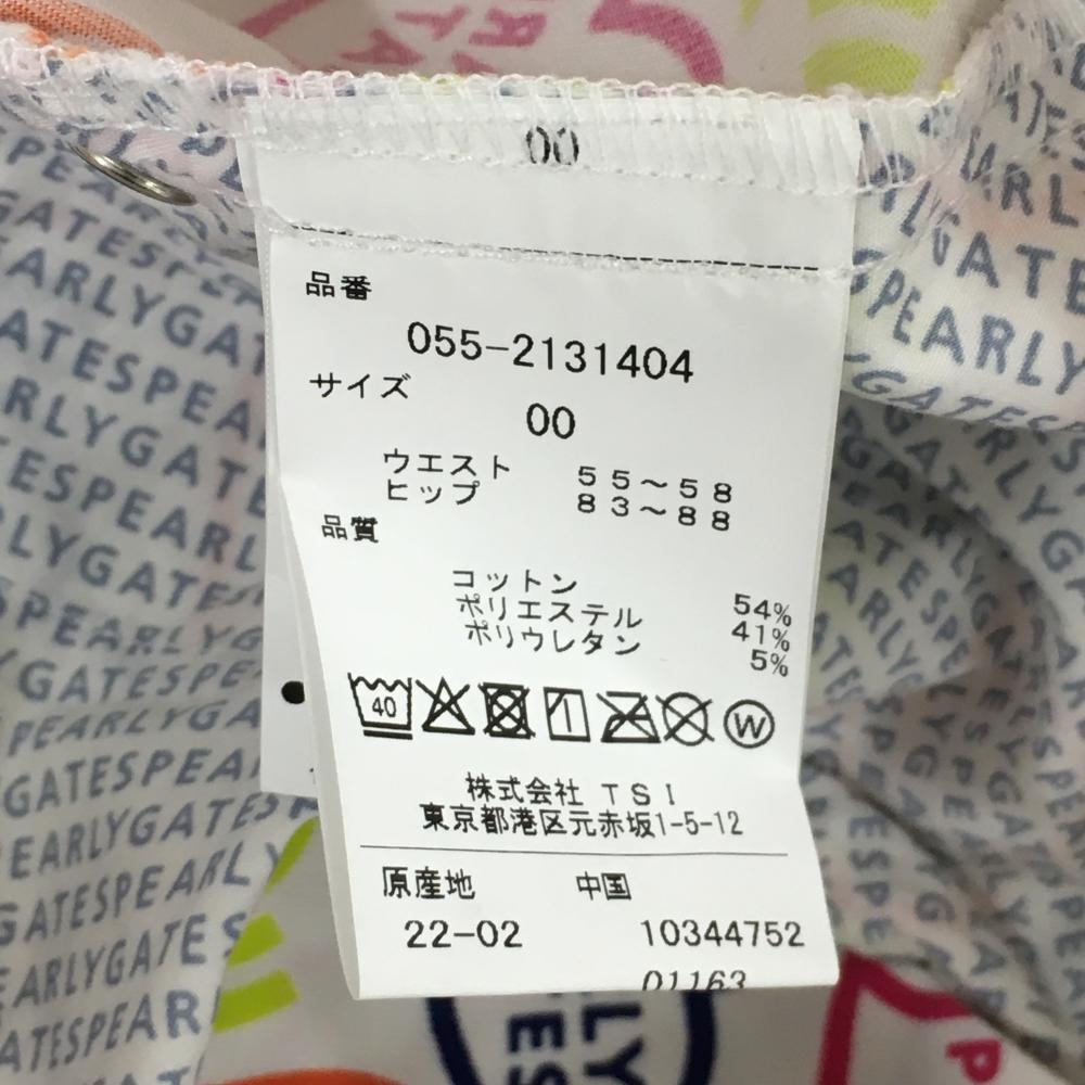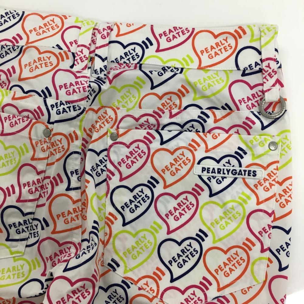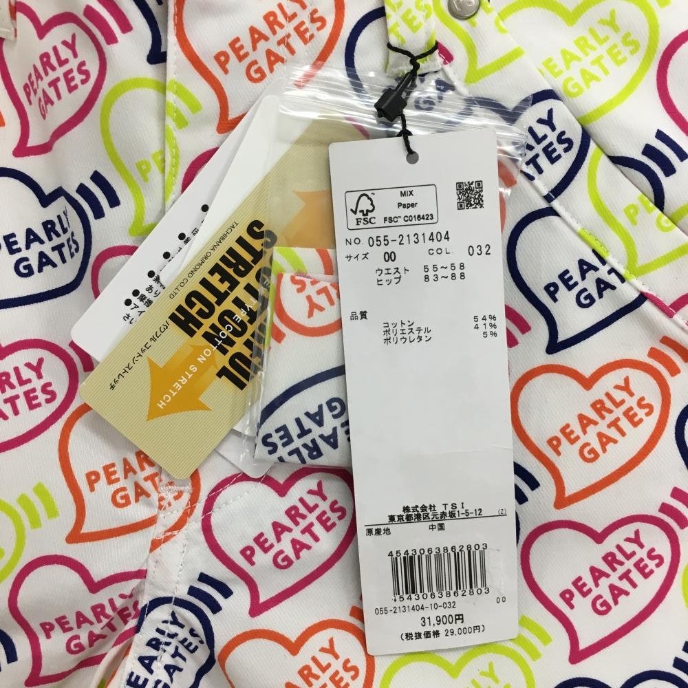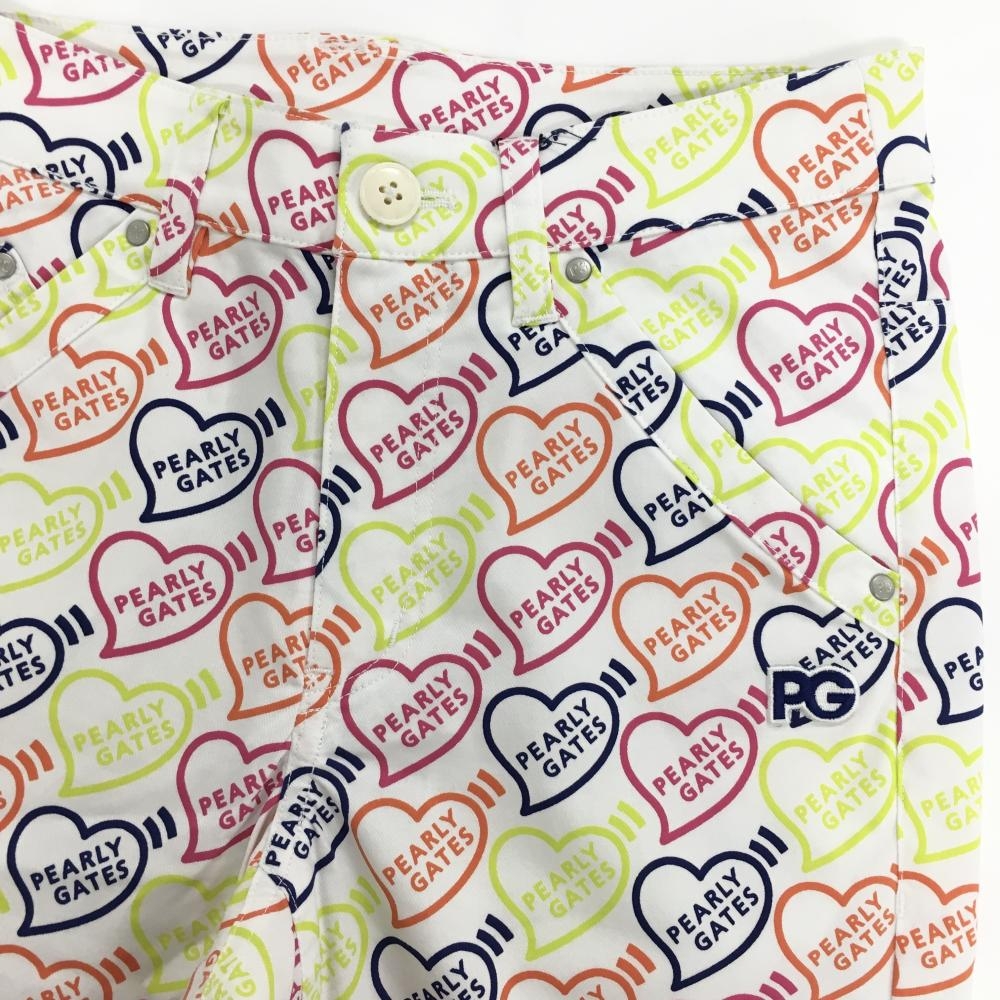 【新品】パーリーゲイツ パンツ 白×マルチカラー ハートロゴ総柄 ストレッチ レディース 00(XS) ゴルフウェア PEARLY GATES