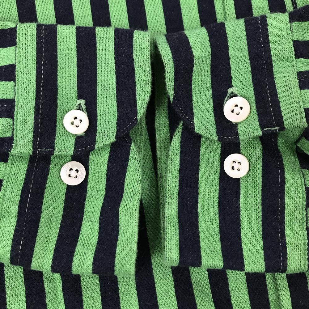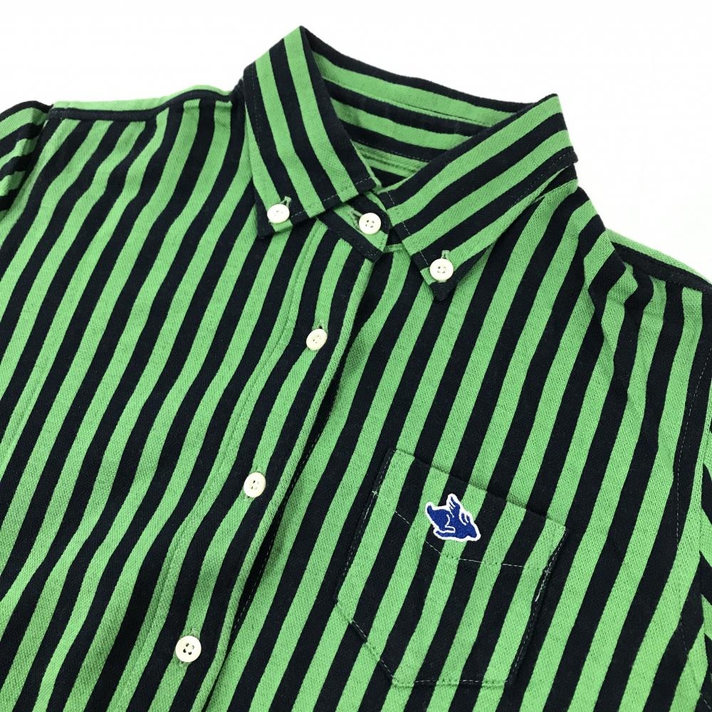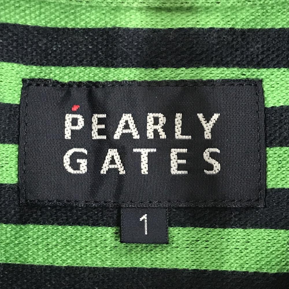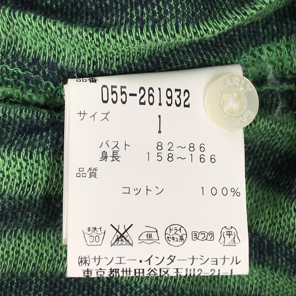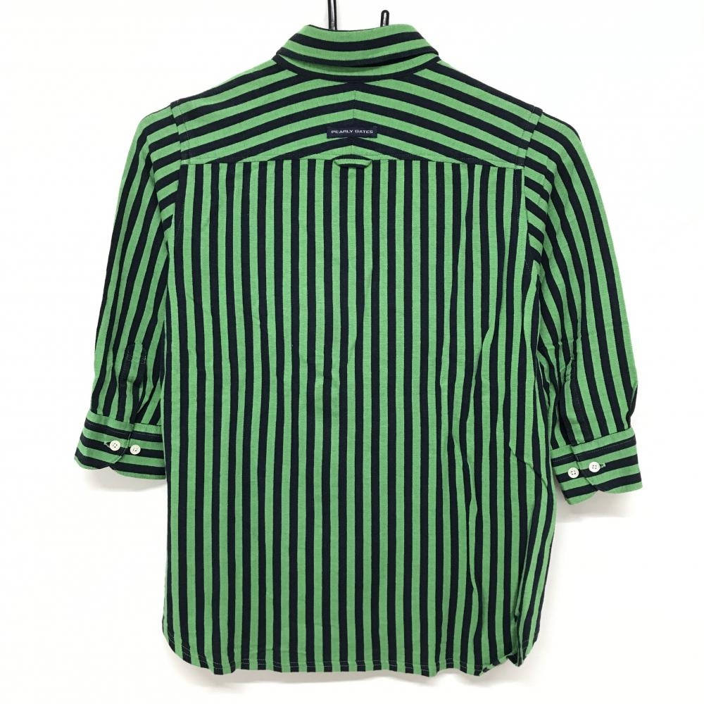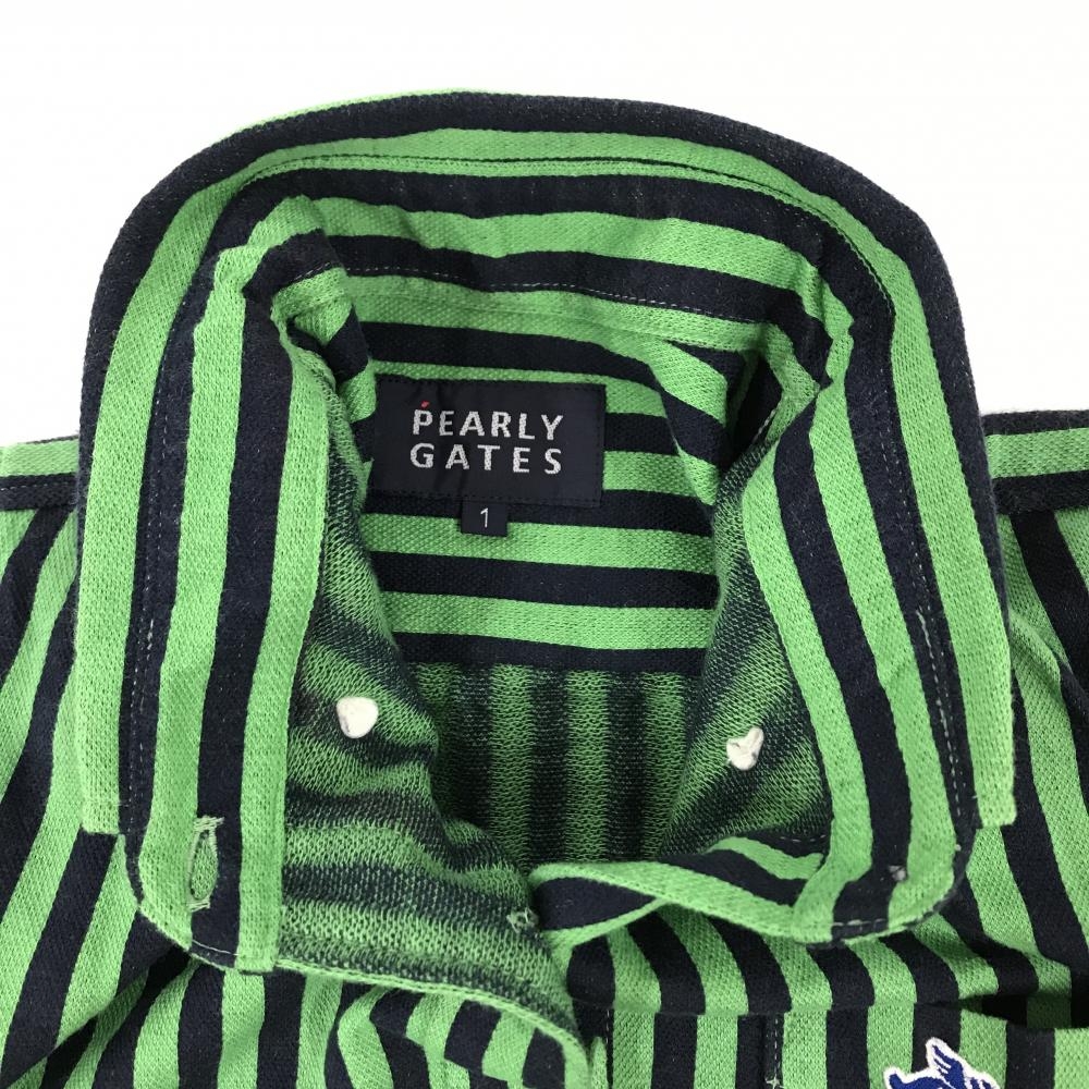 【美品】パーリーゲイツ 五分袖シャツ ライトグリーン×ネイビー ストライプ ボタンダウン レディース 1(M) ゴルフウェア PEARLY GATES